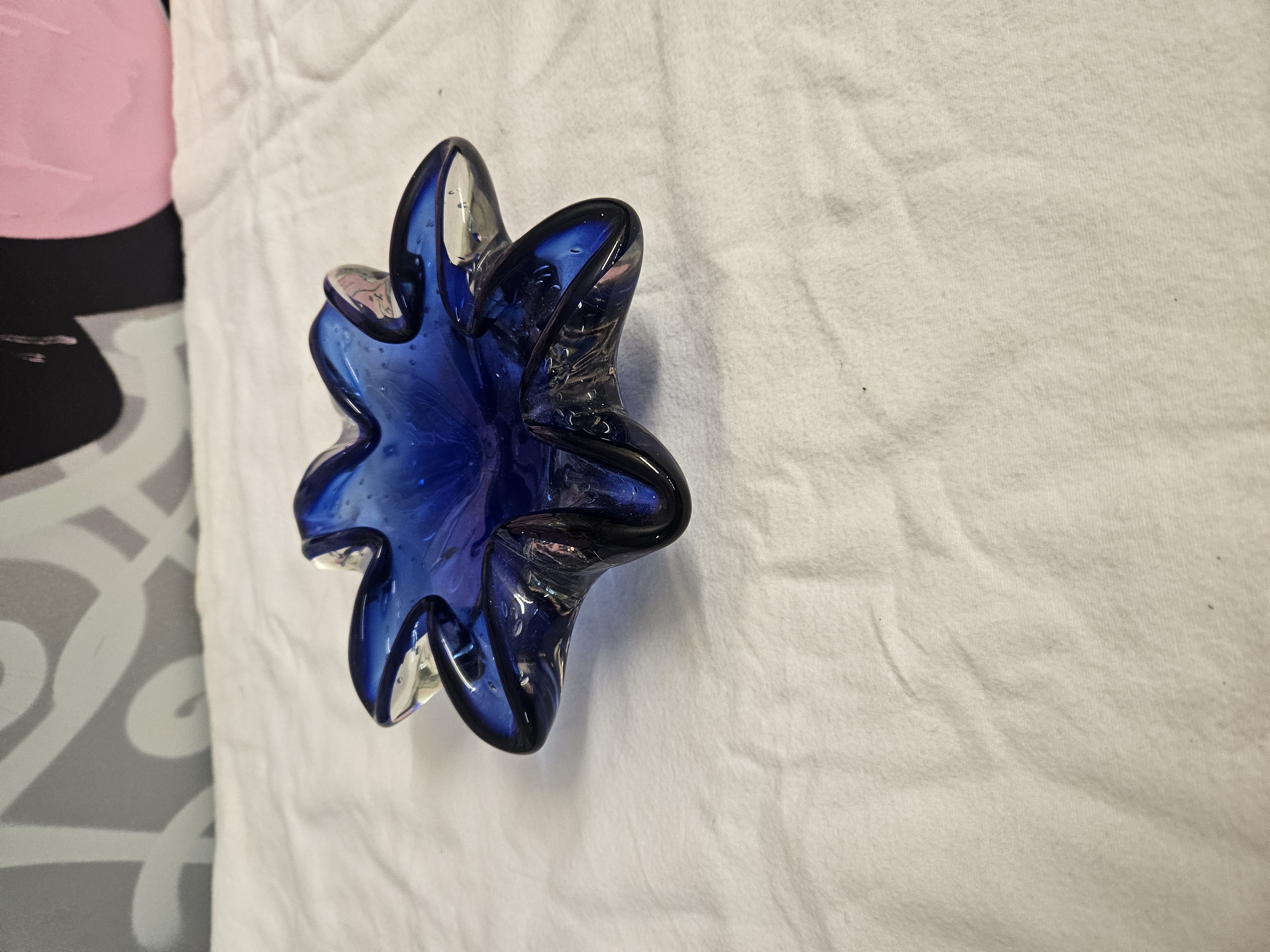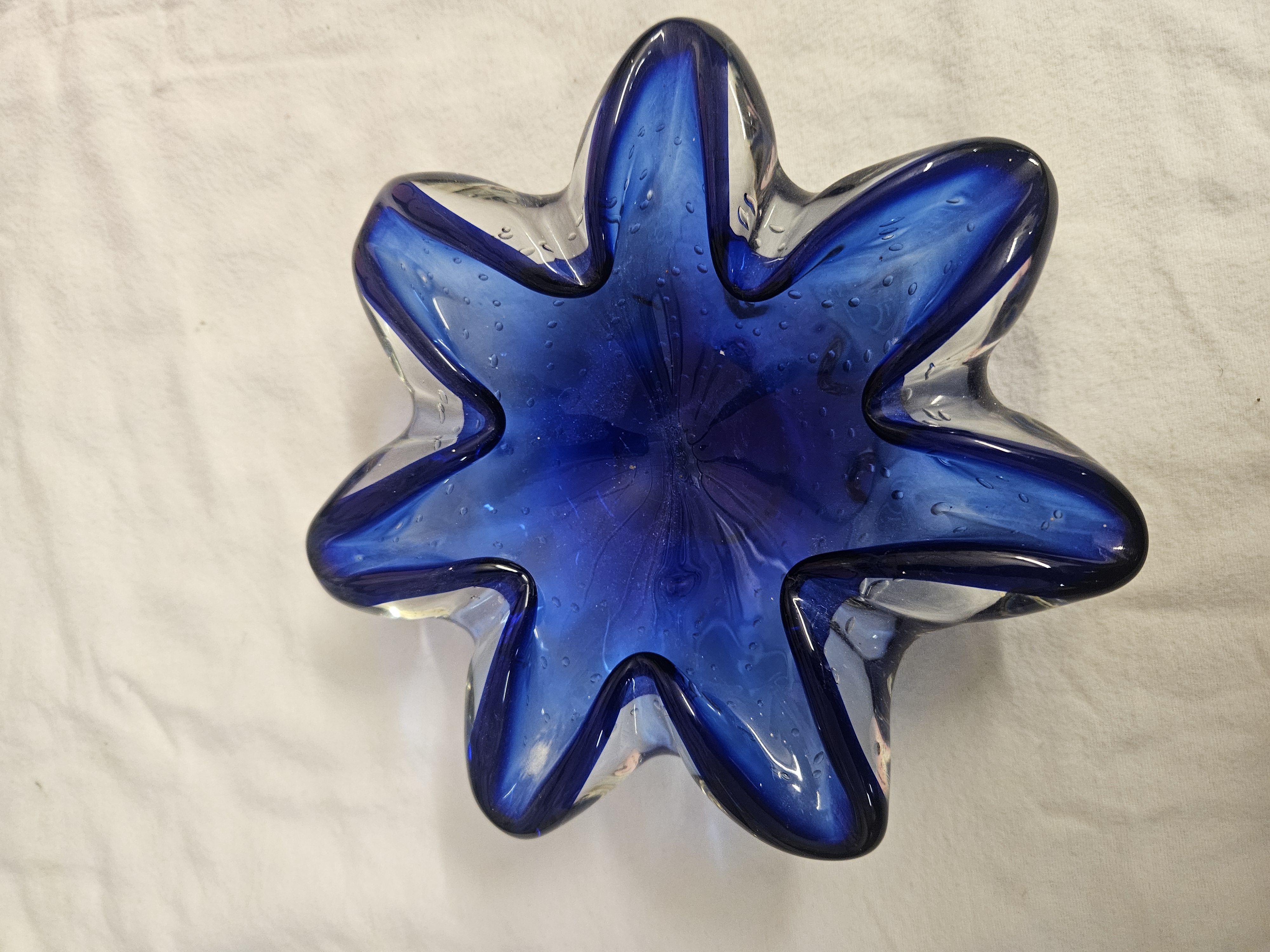 A mid-century art glass bowl attributed to Murano, Italy. The vessel is designed in a multi-lobed, eight-point star shape and produced using the sommerso technique. It features a deep cobalt blue core encased within a thick layer of clear glass. The blue interior is decorated with controlled bubble inclusions, a technique referred to as bullicante. No maker marks, signatures, or factory labels are present on the body or the base.