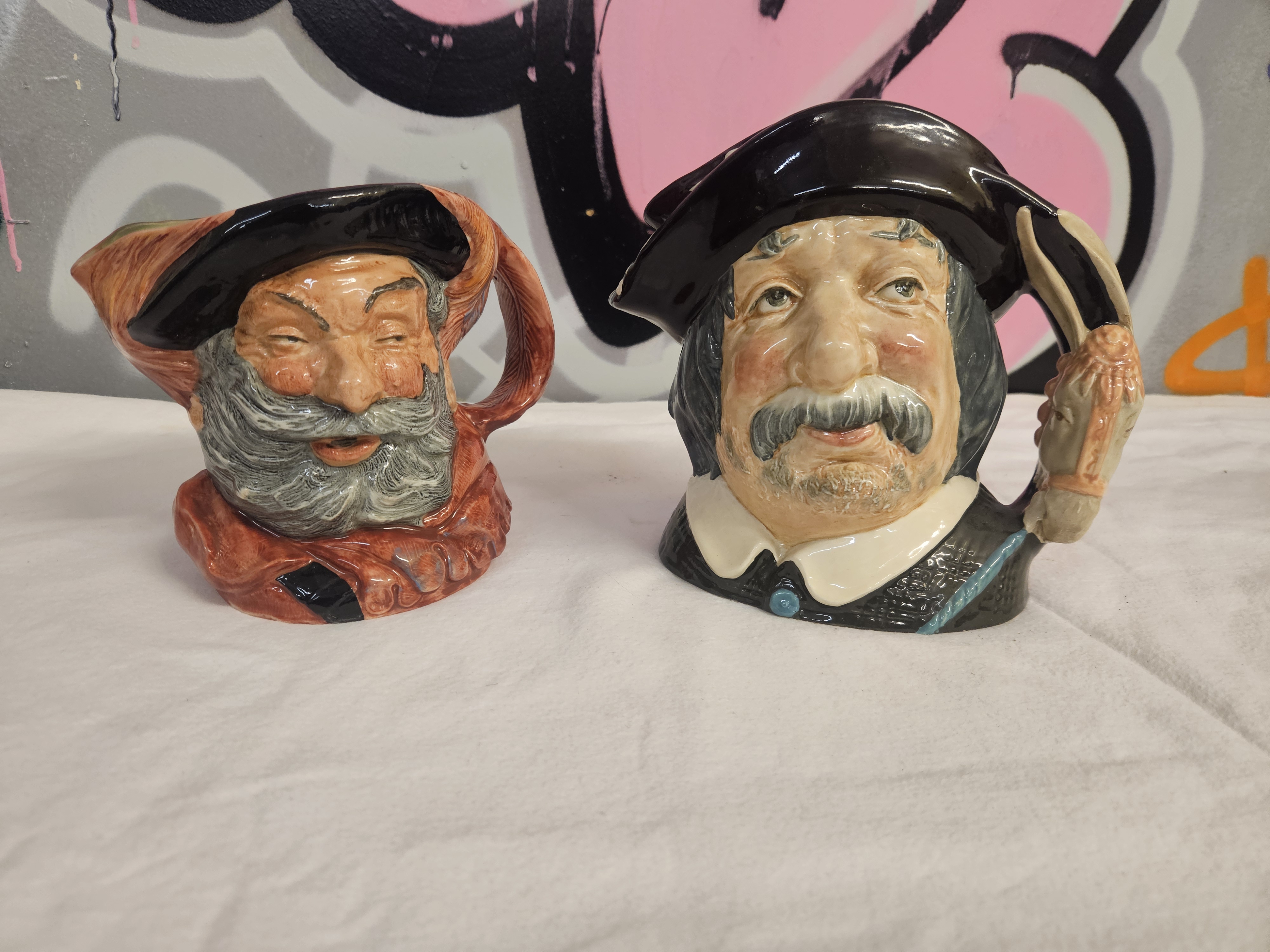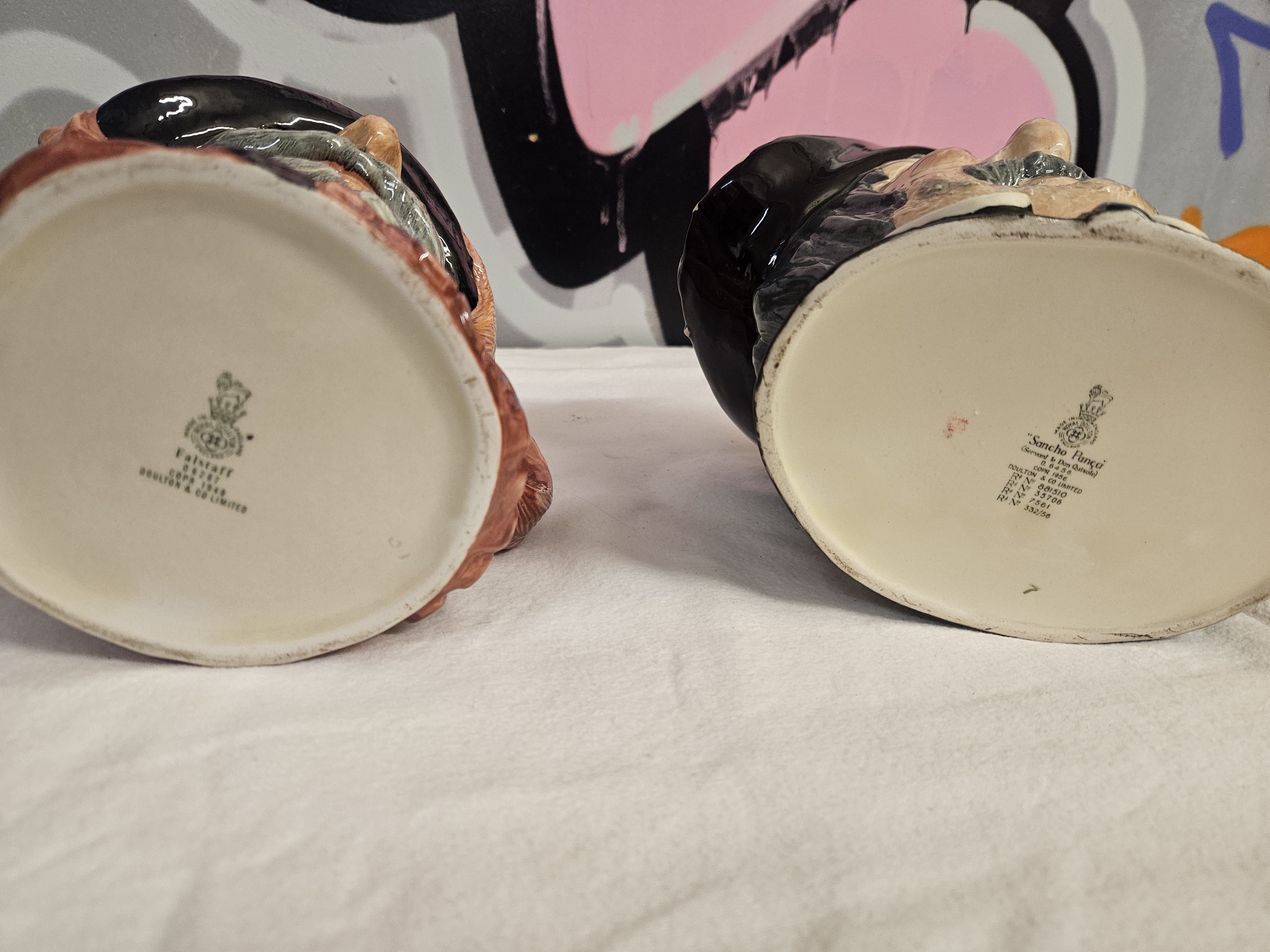 Two large-scale glazed ceramic character jugs produced by Royal Doulton. The first jug depicts the Shakespearean character Sir John Falstaff, featuring a grey beard and moustache, wearing a black hat and red doublet. The second jug depicts Sancho Pança, servant to Don Quixote, featuring a grey moustache and goatee, wearing a black bicorne-style hat and a dark tunic with a white collar. The handle of the Sancho Pança jug is modelled in the form of a donkey’s head and a saddle. Both items feature the circular Royal Doulton backstamp with a lion and crown on the base. The Falstaff jug is marked Falstaff, D 6287, COPR 1949, and Doulton & Co Limited, with an incised or painted 10 near the rim. The Sancho Pança jug is marked Sancho Pança (Servant to Don Quixote), D 6456, COPR 1956, and Doulton & Co Limited, alongside registration numbers Rd No 881510, Rd No 35706, Rd No 7561, and Rd No 332/56. A small hand-painted green mark is present on the base of the Sancho Pança jug.