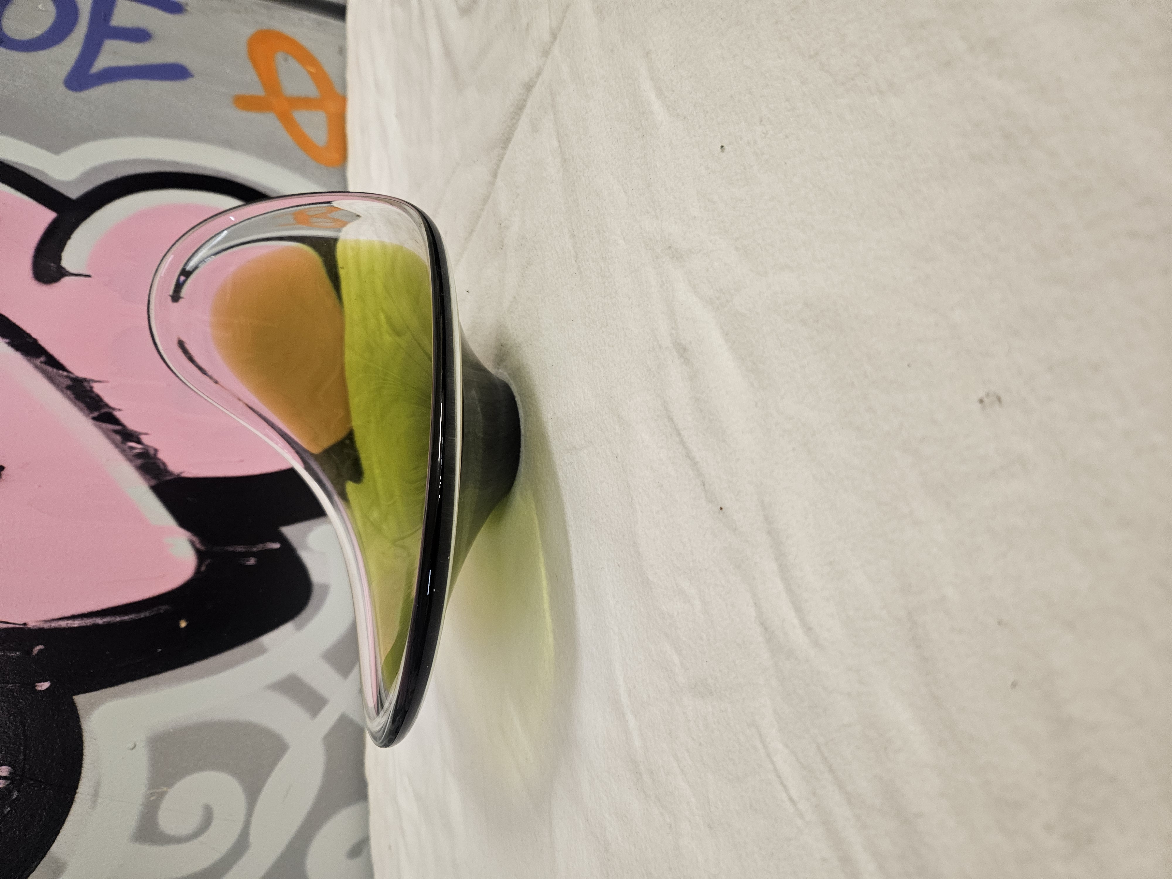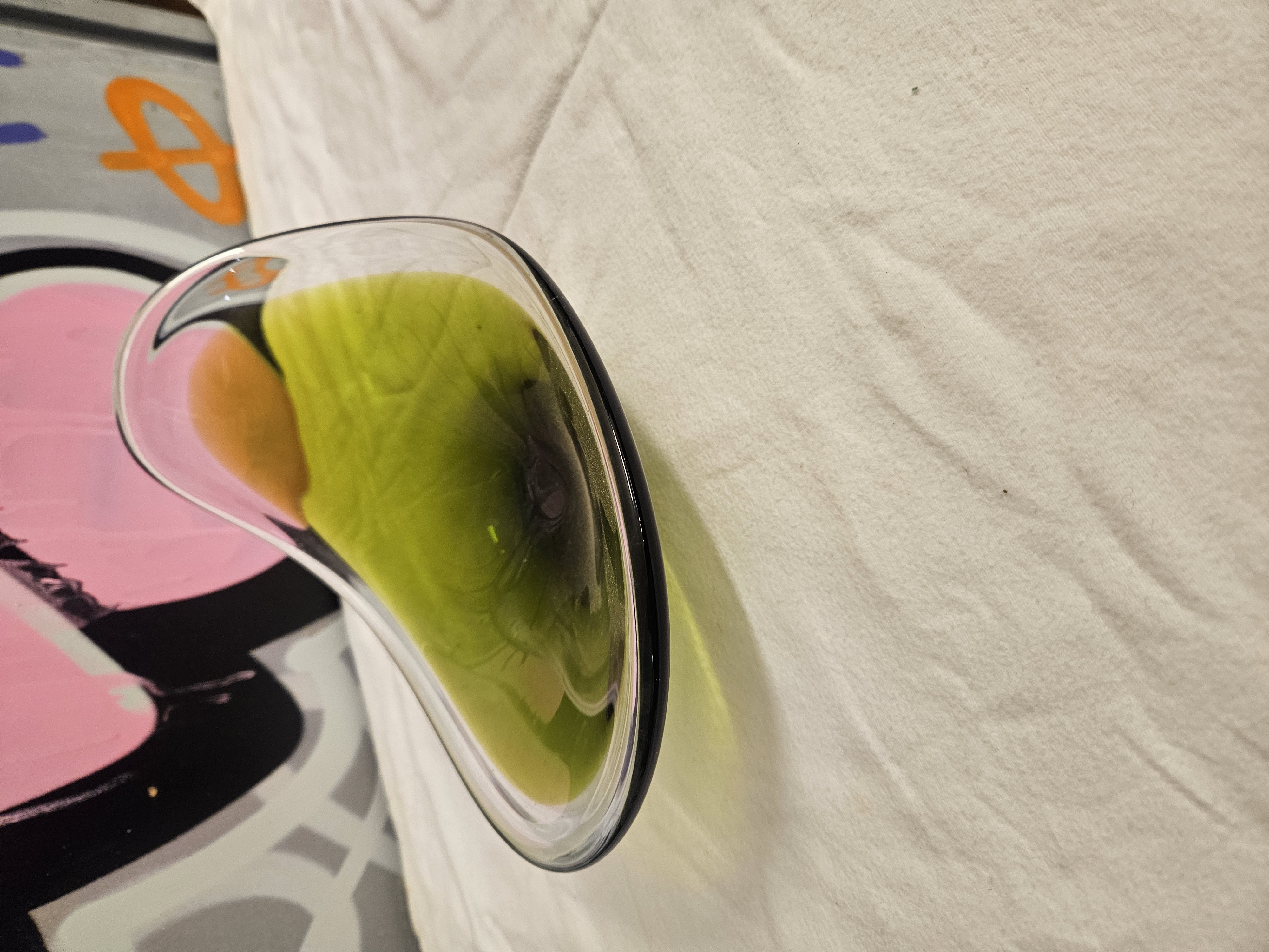 A mid-20th-century art glass dish of organic, asymmetrical form, produced using the sommerso technique. The piece features a lime-green core with an amber-orange internal element, both submerged within a thick, clear glass casing. The vessel is finished with a smoke-grey tinted rim and sits on an integrated circular foot of the same dark hue. The biomorphic shape and colour palette are characteristic of mid-century design, with similar examples attributed to Murano makers or Sasaki Crystal of Japan (designed by Denji Takeuchi, circa 1963). No manufacturer marks, signatures, or labels are present.