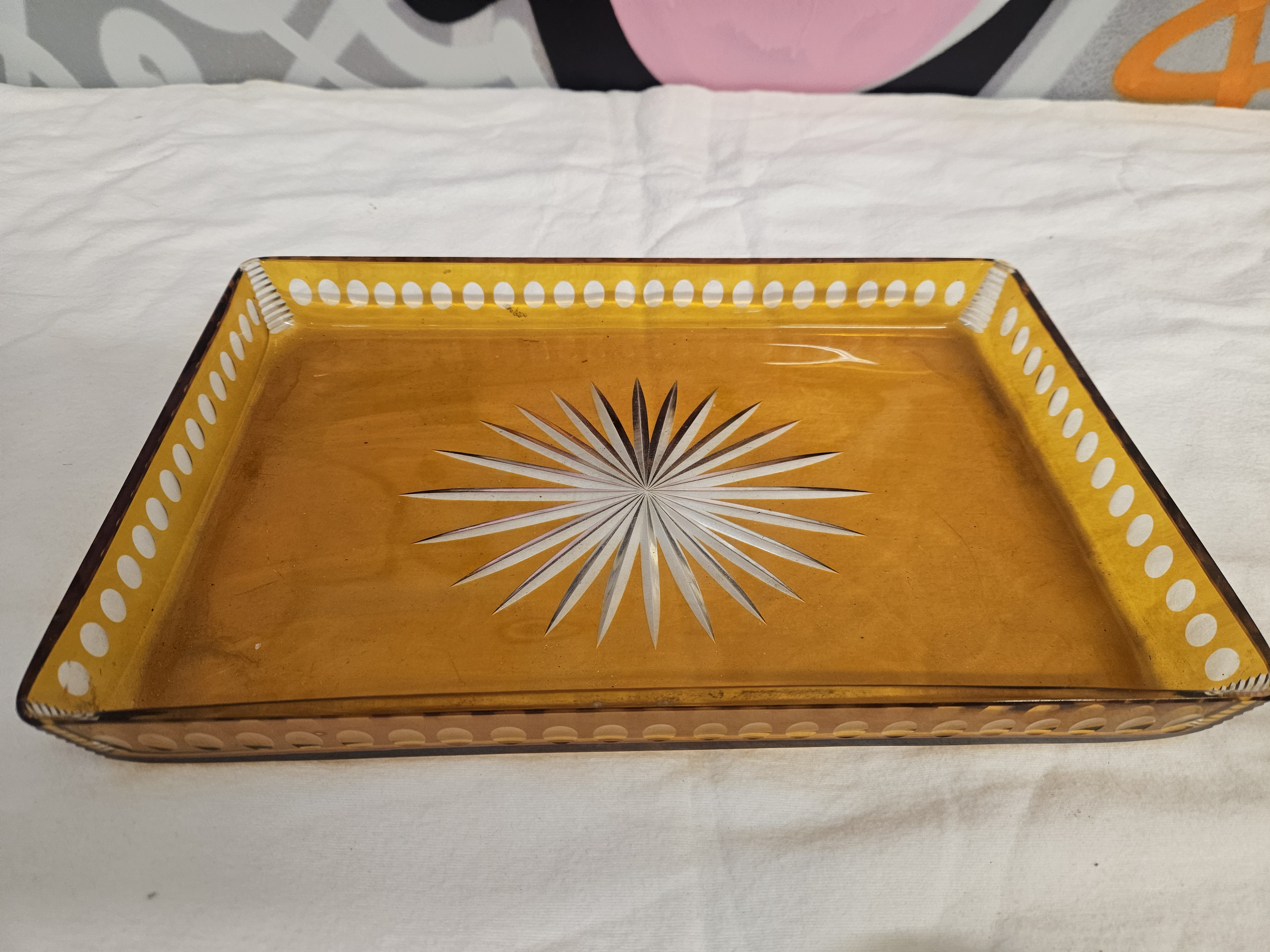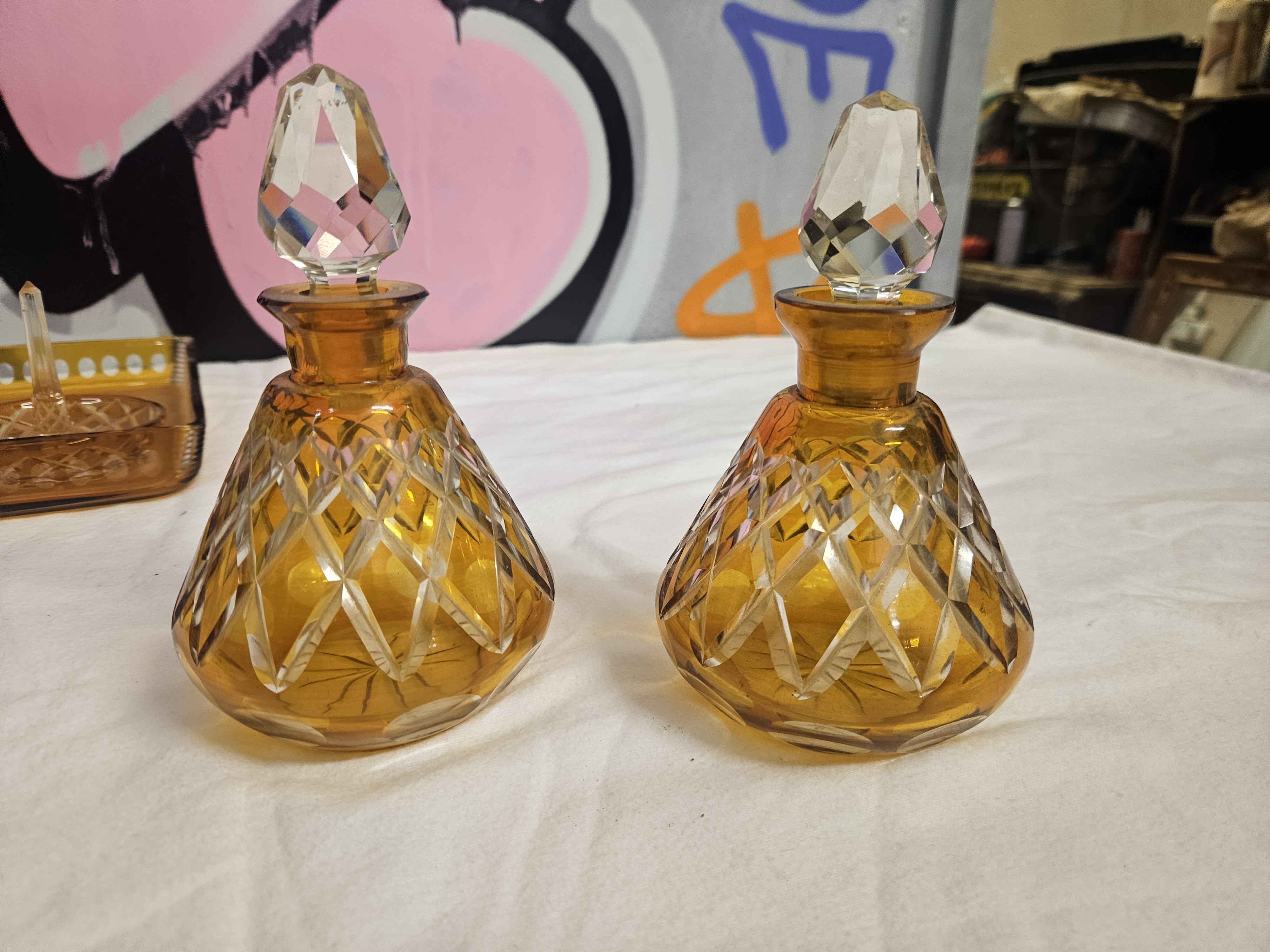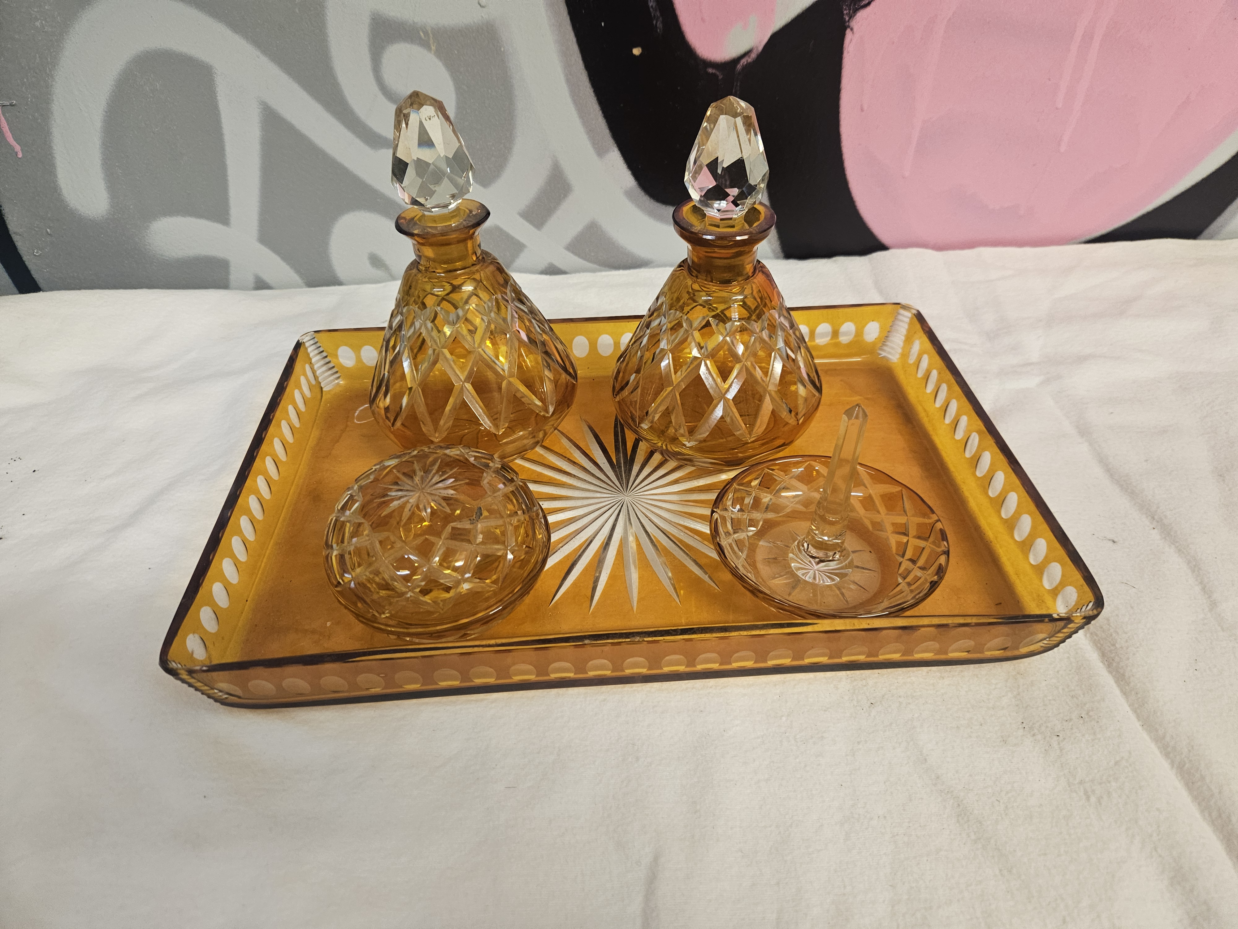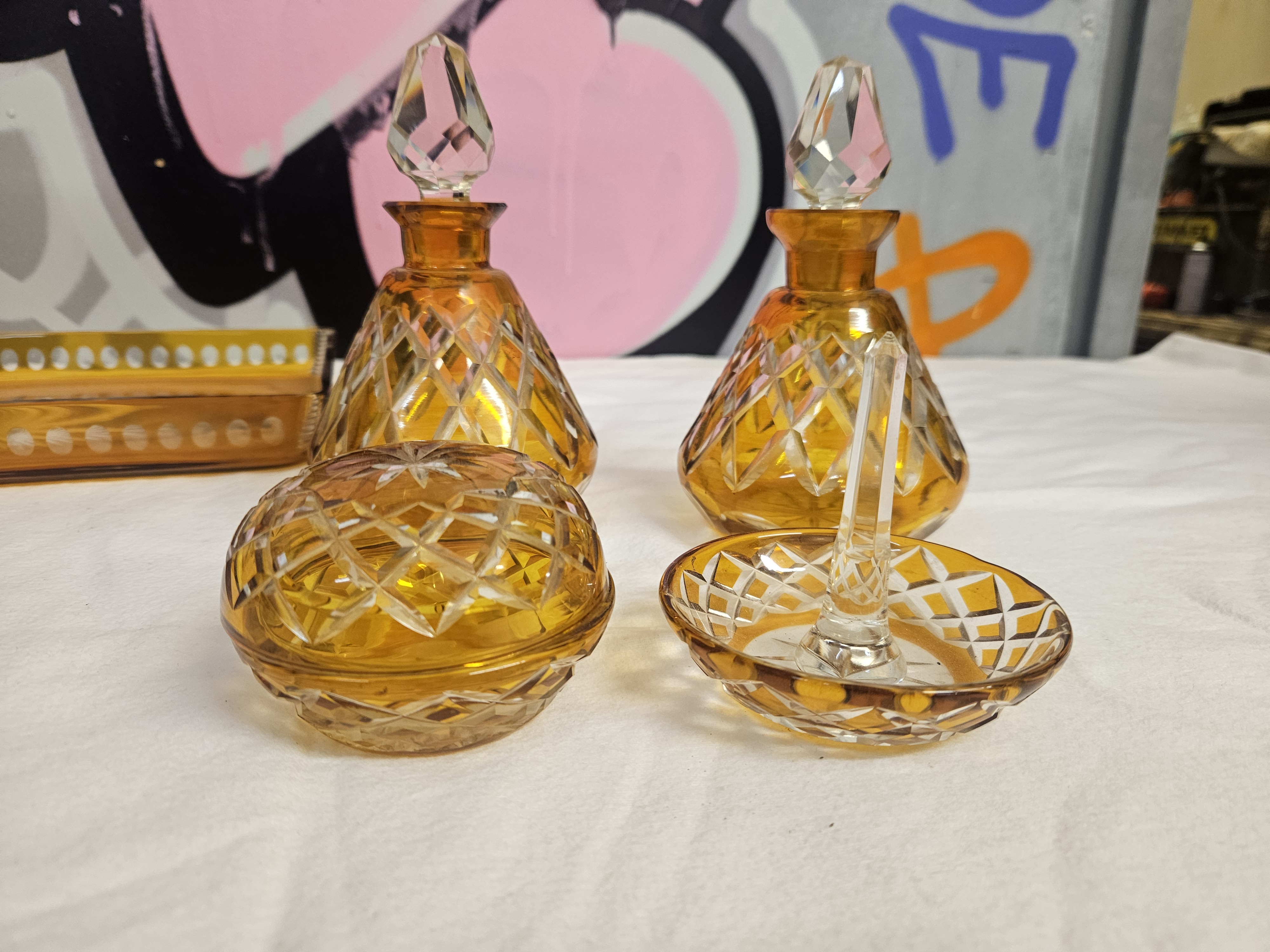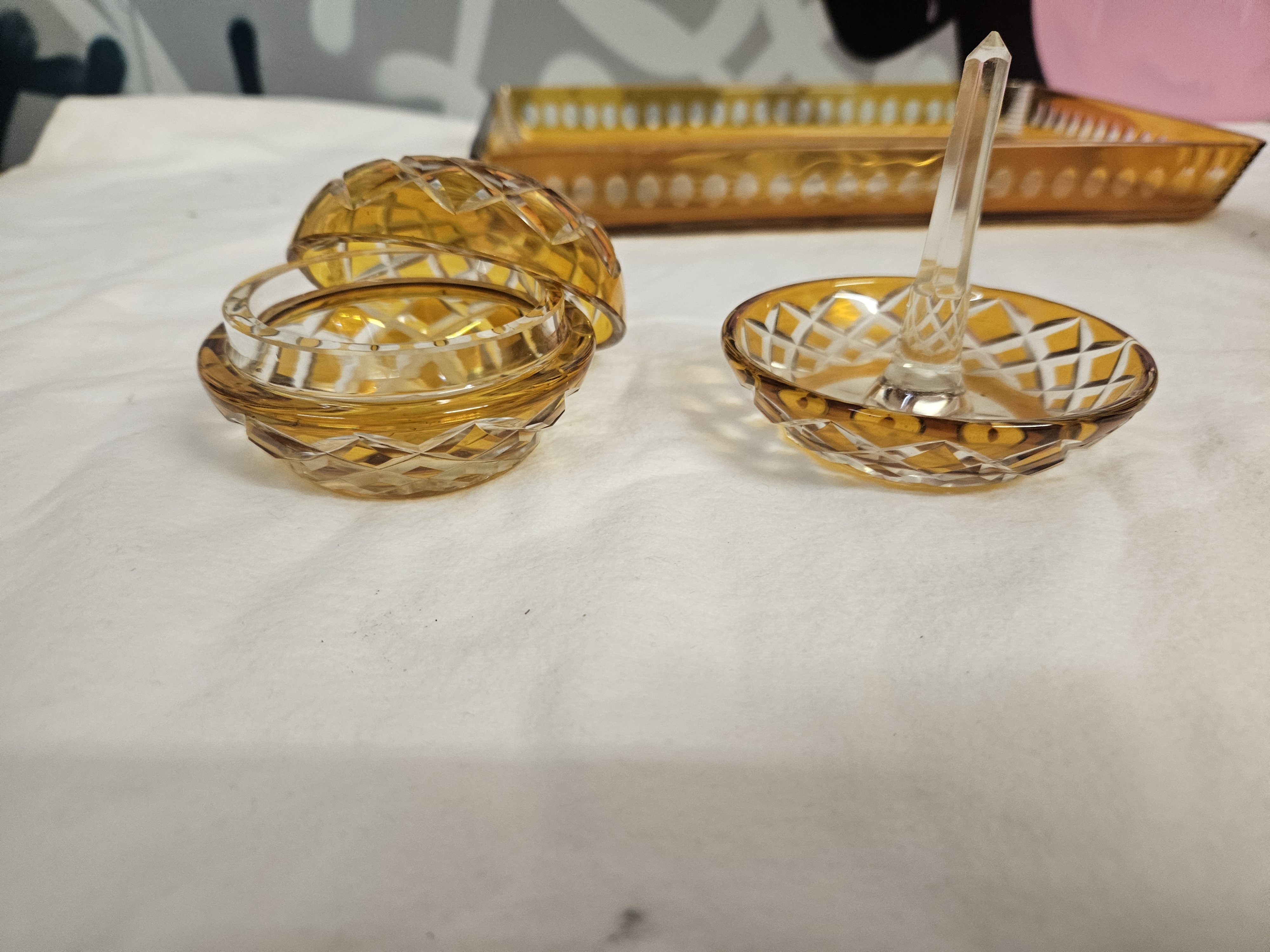 A six-piece collection of amber-coloured cut glass dressing table items, dating from the Art Deco period, circa 1930. The set consists of a rectangular tray, two scent bottles, a lidded trinket jar, and a ring stand. The tray features a central cut starburst motif and a gallery rim with a continuous band of oval thumbprint cuts. The scent bottles are conical in shape with a diamond and cross-hatch cut pattern to the lower section, each fitted with a multi-faceted clear glass stopper. The circular trinket jar and the ring stand feature matching diamond-cut patterns. The ring stand is finished with a central clear glass pillar. The glass is transparent amber with clear glass components. No maker marks or signatures are visible.