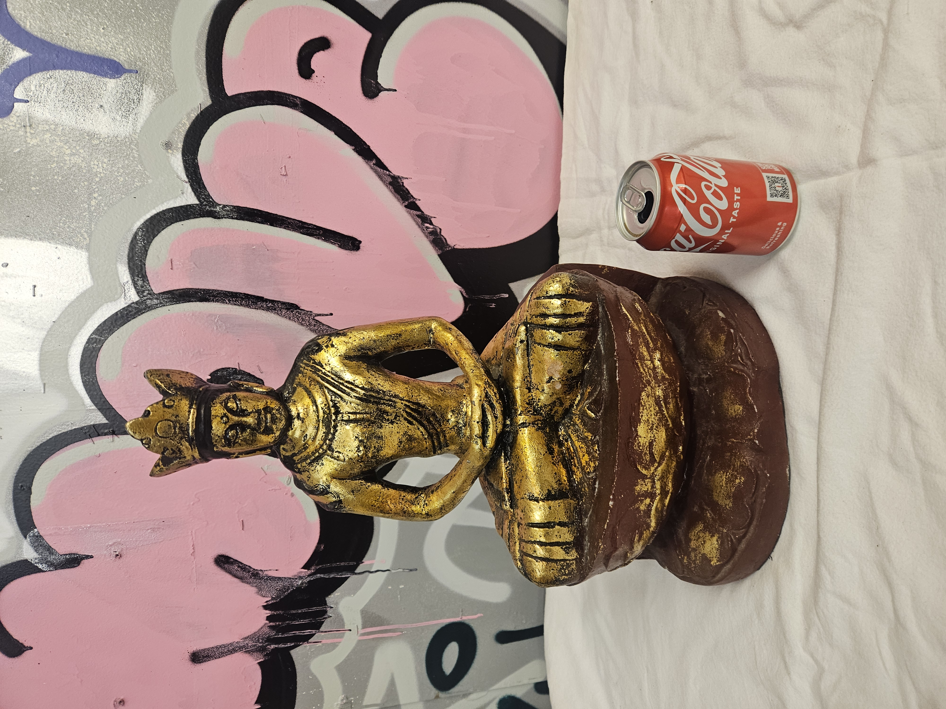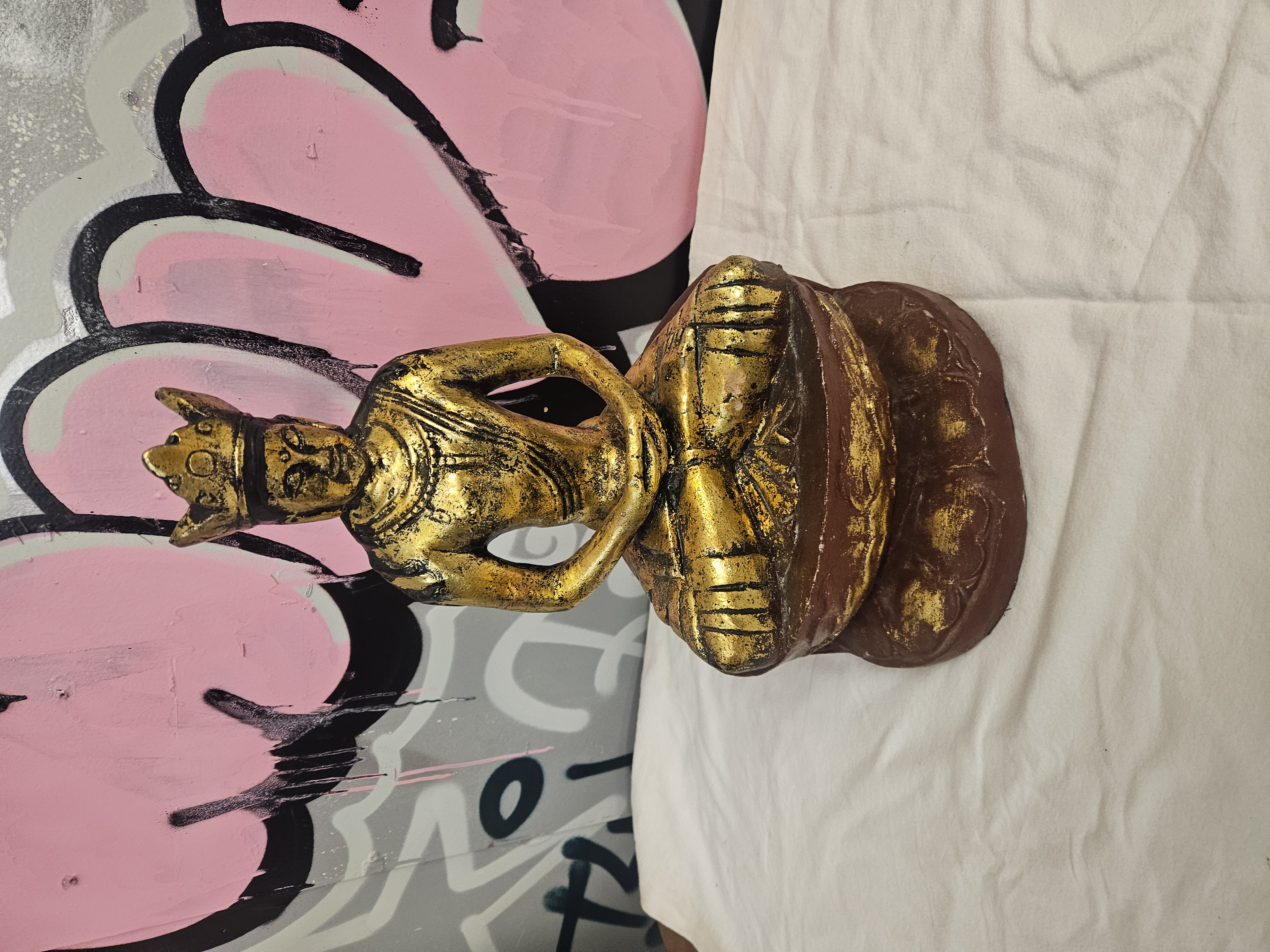 A decorative figure of a crowned Buddha, depicted in the Southeast Asian Jambupati style. The figure is shown seated in padmasana, also known as the lotus position, with hands resting in dhyana mudra or the meditation gesture. The iconography features a high, tiered monarchical crown, ornate necklaces, and robes with detailed borders, representing the Buddha’s sovereignty in Thai and Burmese traditions. The statue is mounted on a stepped, lotus-form base. The item is constructed from a moulded composite material or base metal, finished with a gilt-effect coating over a reddish-brown base layer. No marks, characters, or inscriptions are visible on the exterior surfaces of the item.