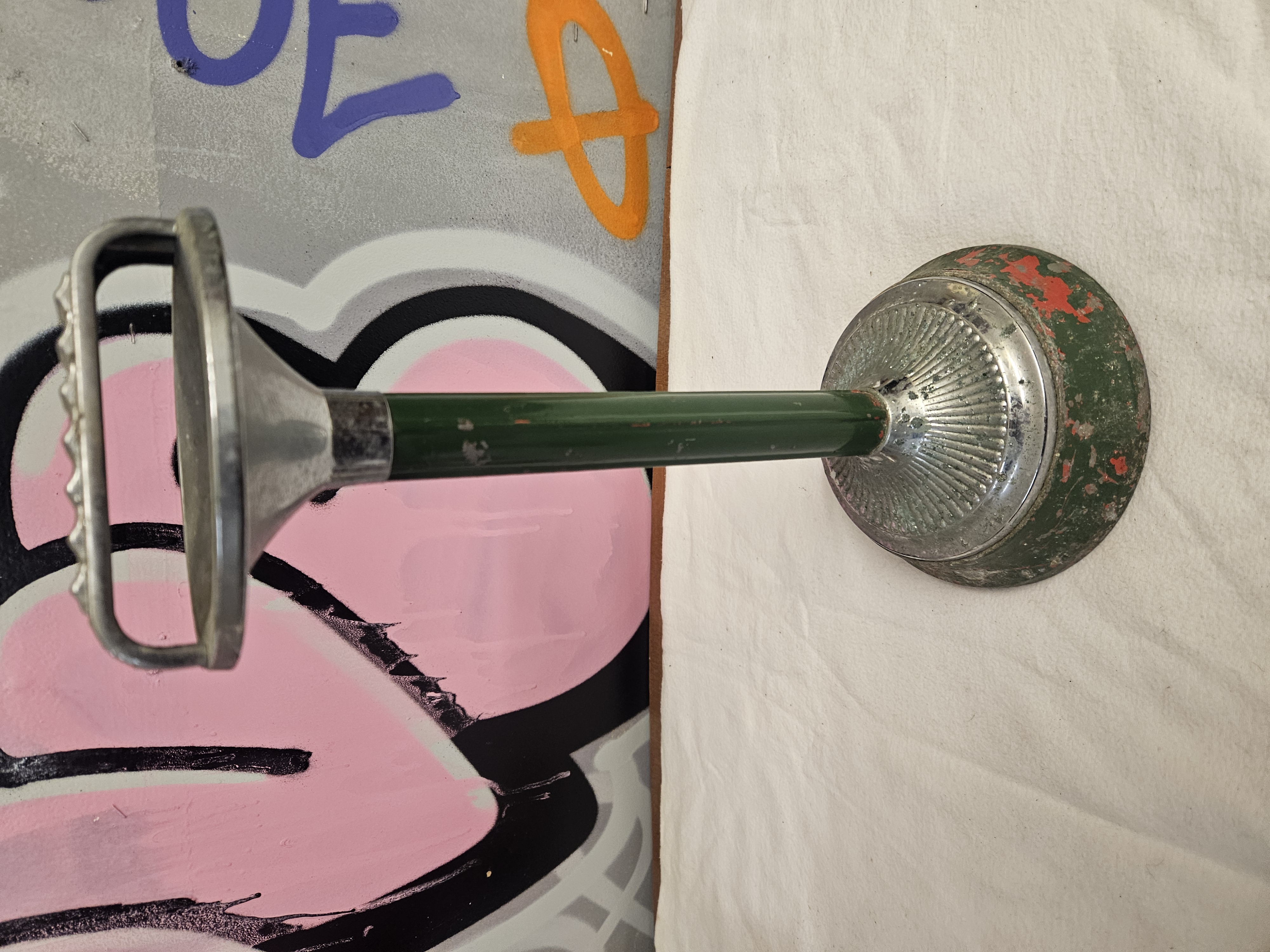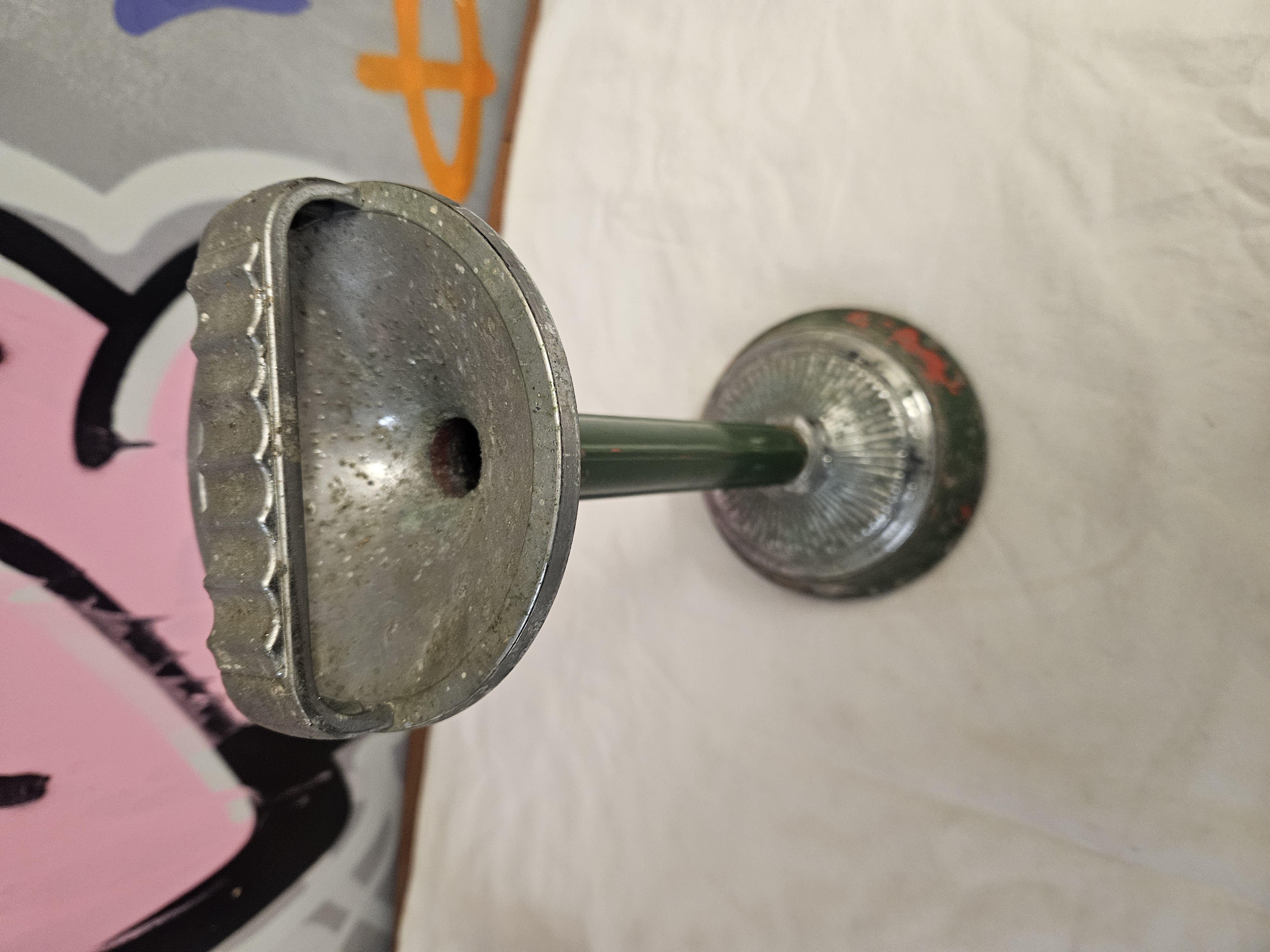 A mid-20th century floor-standing smoker’s companion or ashtray. The piece is constructed from cast metal components and a tubular metal stem, secured by a central internal tension rod. The top features a D-shaped cast metal bowl with a bridge-style handle. The underside of the handle is notched to provide rests for cigarettes. The central stem and weighted domed base are finished in dark green paint over a red primer. A decorative fluted chrome-plated collar is positioned at the junction of the stem and the base. This type of stand was commonly used in British domestic and commercial settings, such as public houses, between the 1930s and 1950s. No maker’s marks are present.