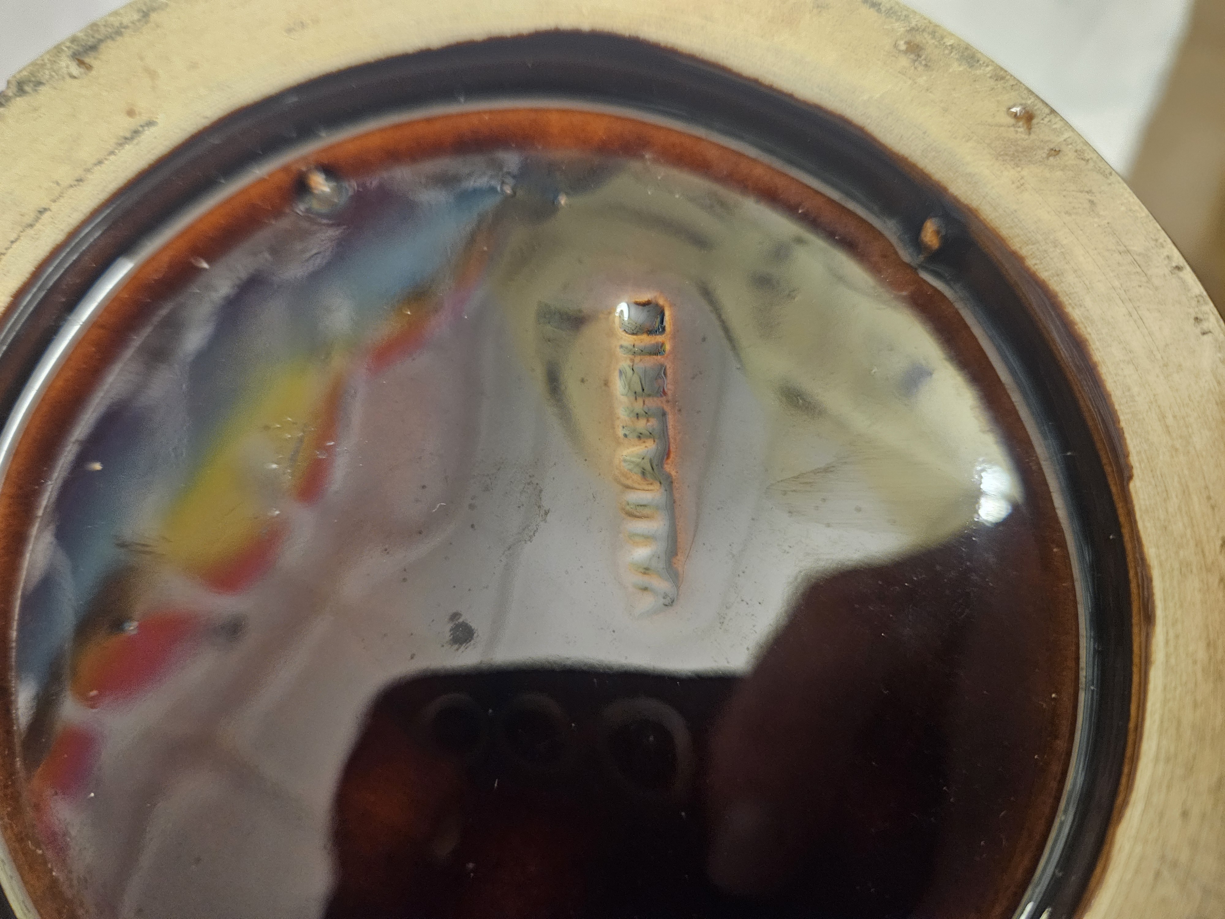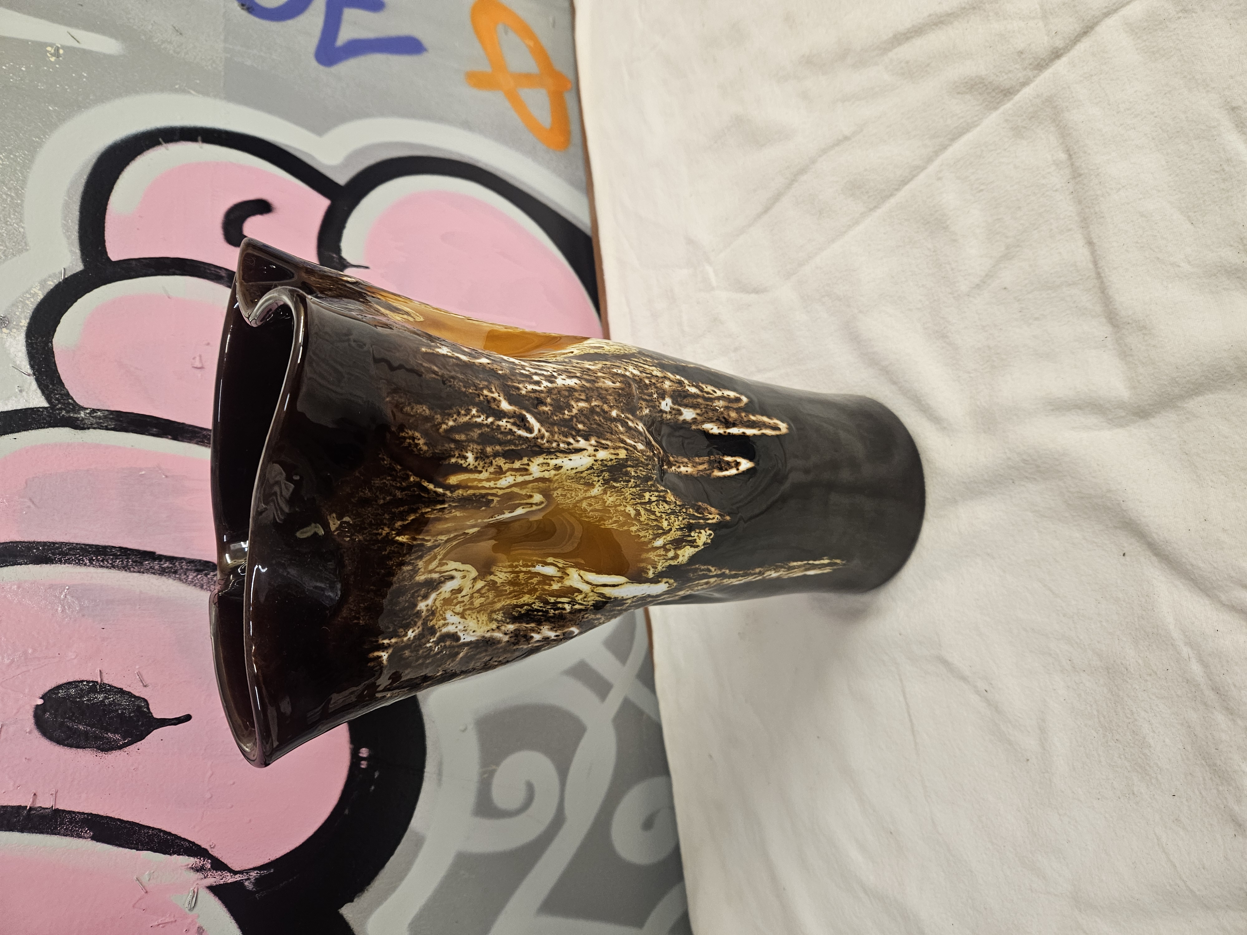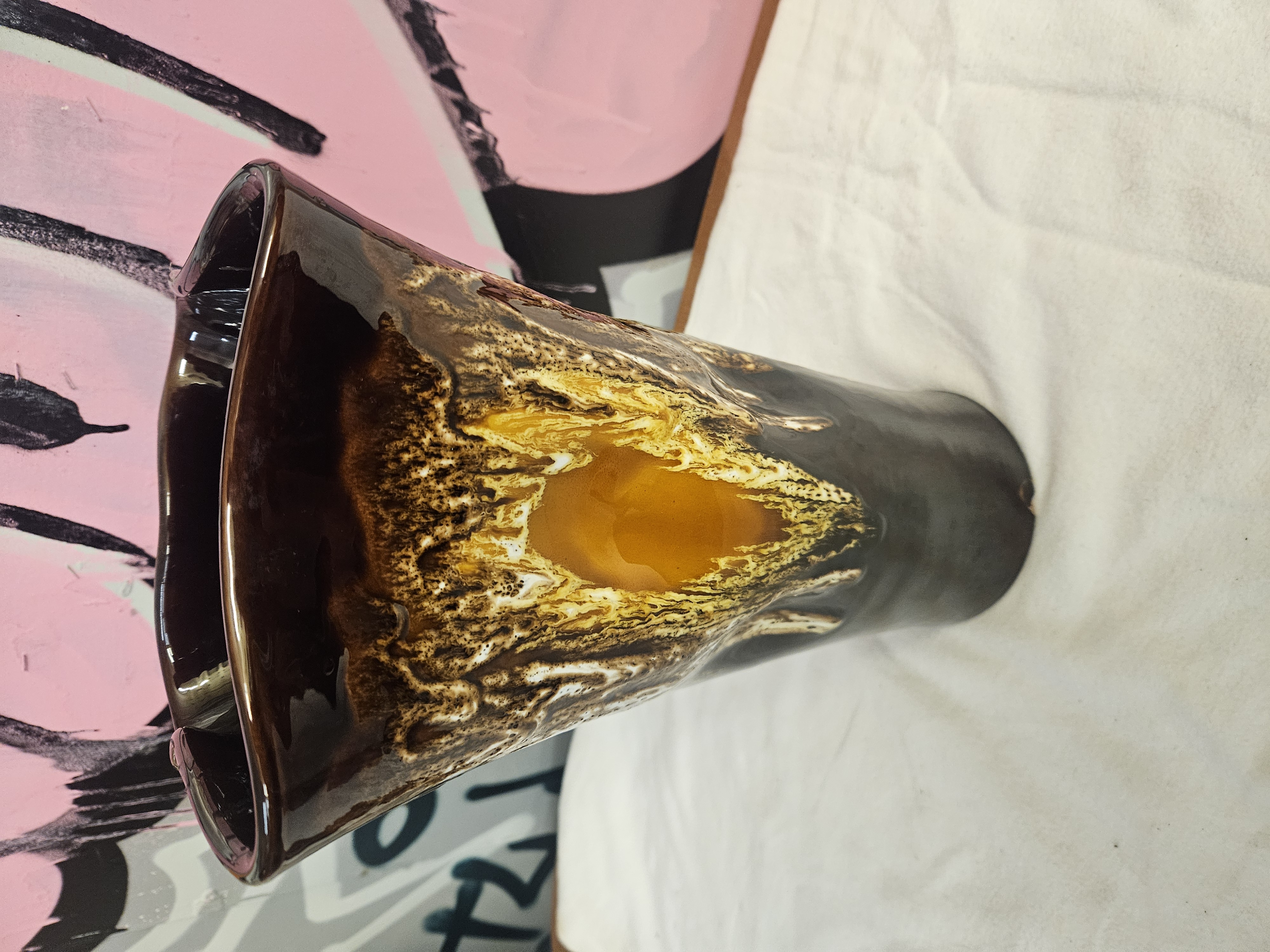 A mid-20th-century French earthenware vase produced in the Vallauris pottery centre. The vessel is of tall cylindrical form with a wide, hand-formed undulating rim. It is decorated with a thick, textured reactive glaze in tones of amber, ochre, and cream, applied over a dark brown to black glossy base glaze to create a volcanic or fat lava effect. The underside features an incised mark reading VALLAURIS beneath the glaze. The foot rim is unglazed.