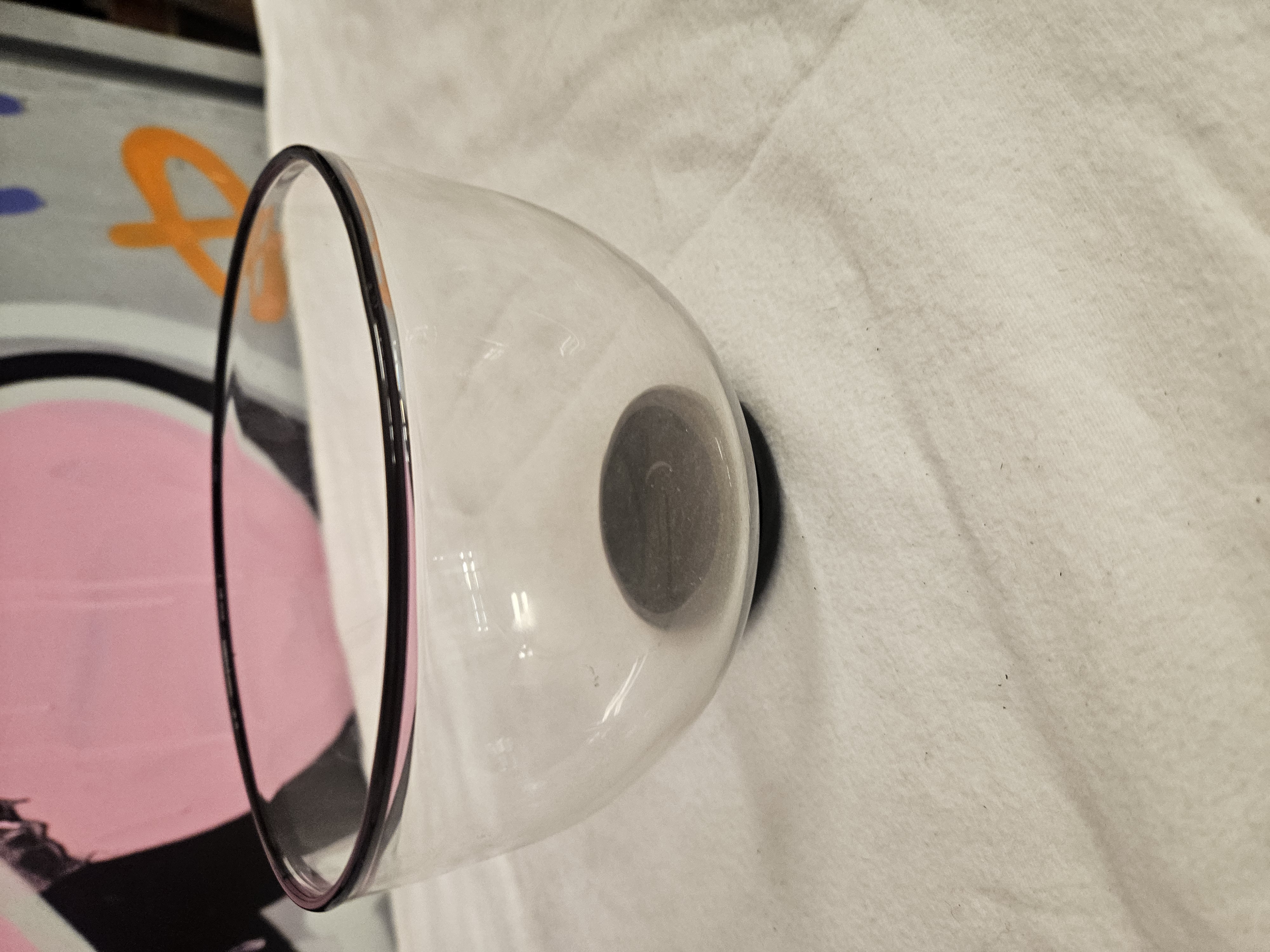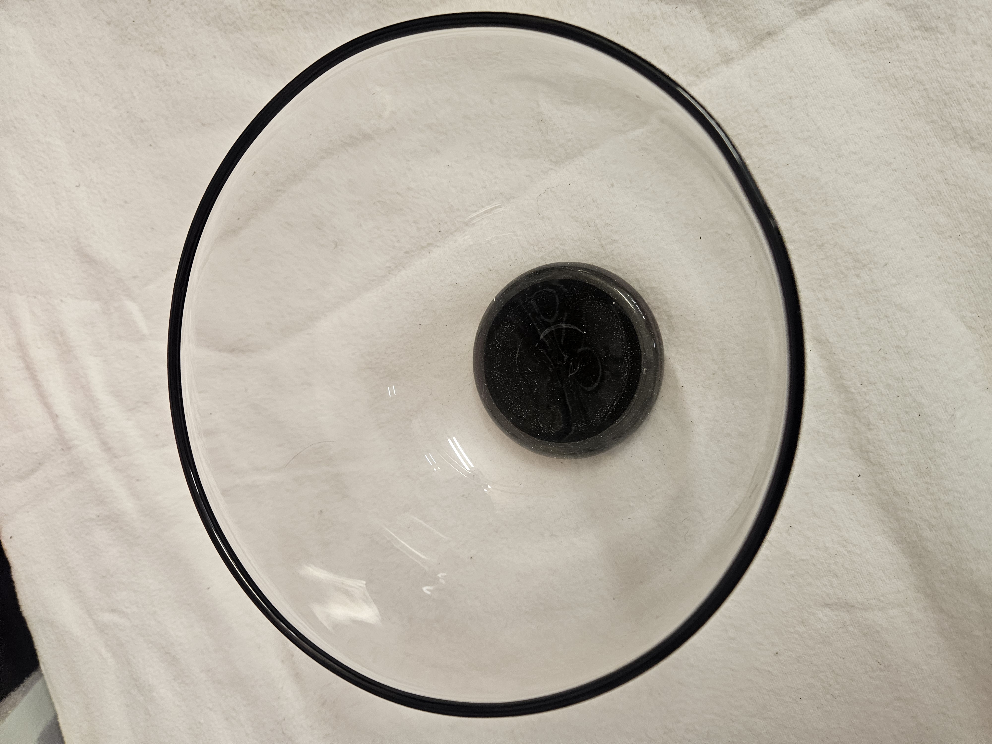 A minimalist art glass bowl of rounded conical form, constructed from clear glass. The piece features a thin, dark grey or black glass band at the rim and an applied circular button base in matching dark glass. An etched maker’s mark is present on the underside of the base, consisting of a stylised character within a circle, resembling a lowercase d or uppercase D. This mark is consistent with those used by Dartington Crystal. The design is characteristic of modern British art glass from the late 20th century.