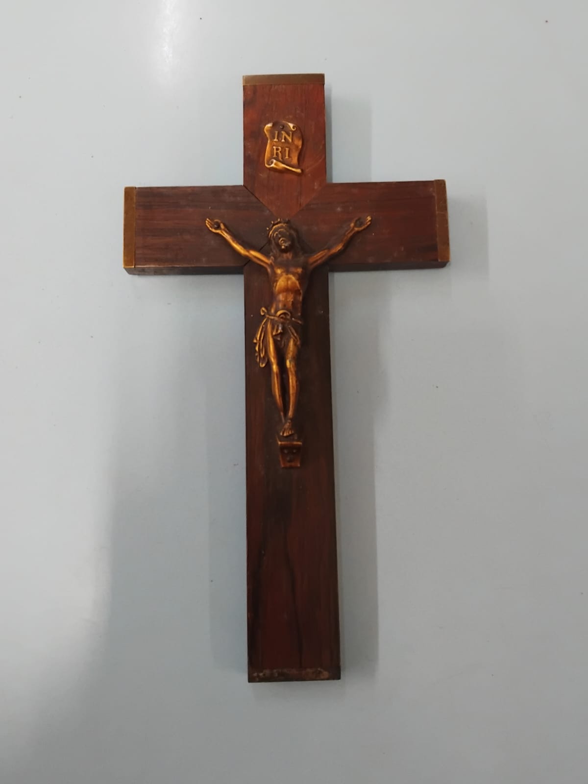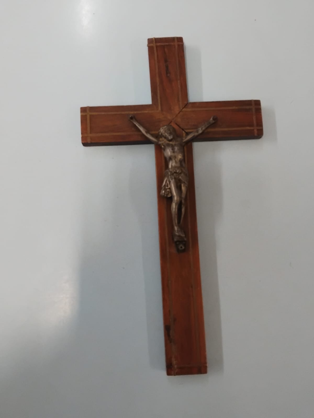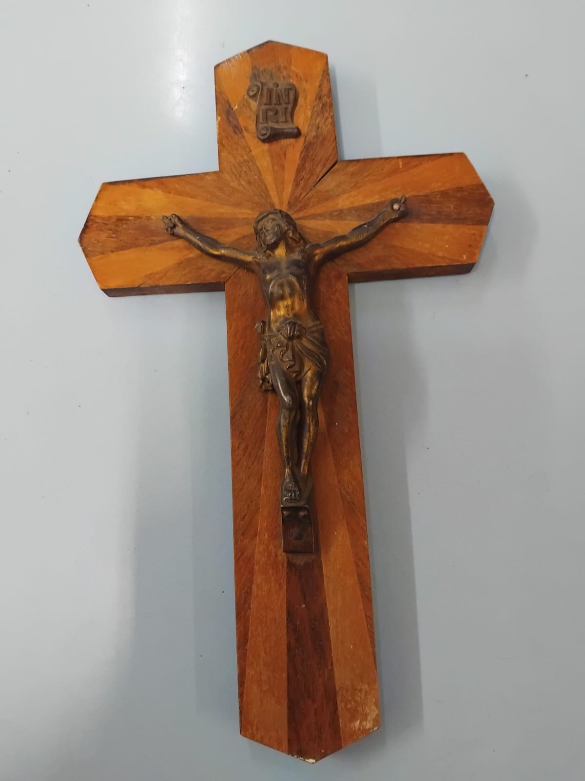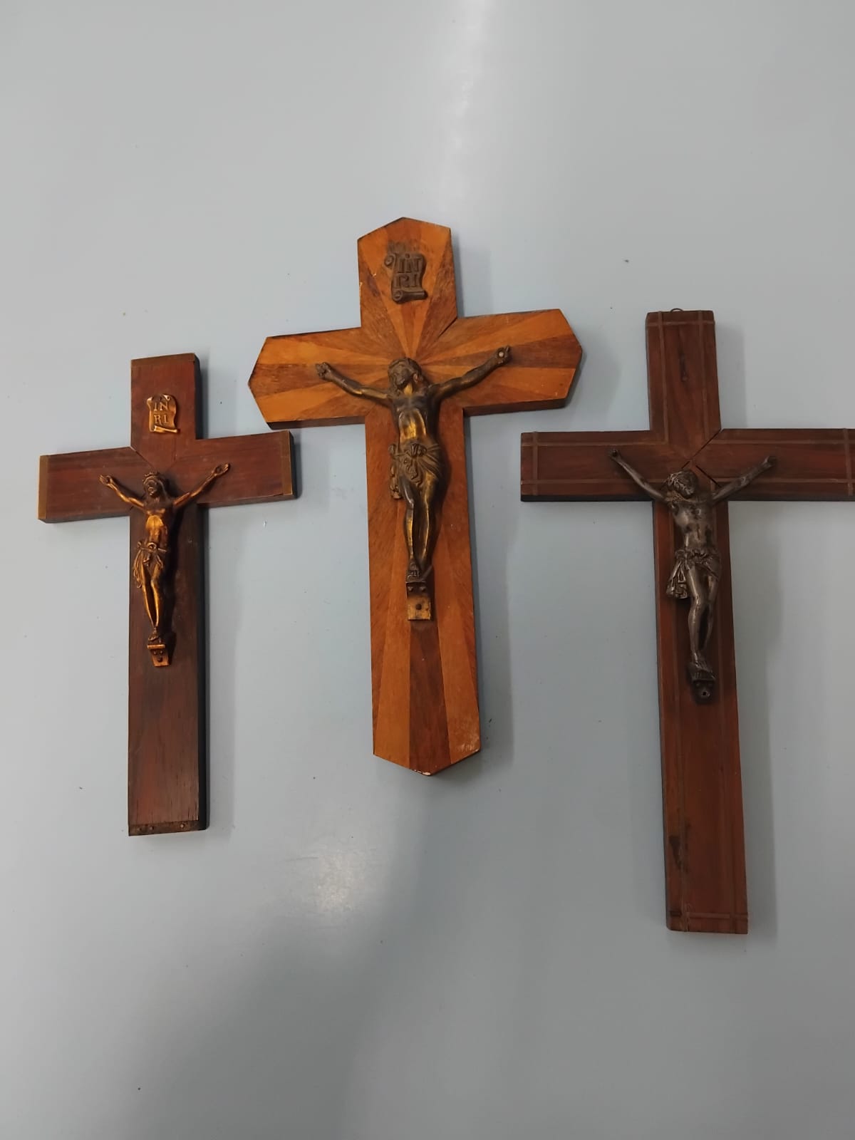 Three mid-20th century wall-hanging crucifixes of varying construction and design. One example features a cross decorated with parquetry veneer in a radiating sunburst pattern using two contrasting tones of wood, fitted with a cast metal corpus with a dark bronze-toned patina and a scroll-shaped INRI plaque. Another example is crafted from dark-stained hardwood with brass-capped terminals, featuring a cast metal corpus with a bright brass-toned finish and a scroll-shaped INRI plaque. The final example is composed of medium-toned wood decorated with inlaid light-wood stringing forming a rectangular border design at the ends of each arm, fitted with a silver-toned cast metal corpus.