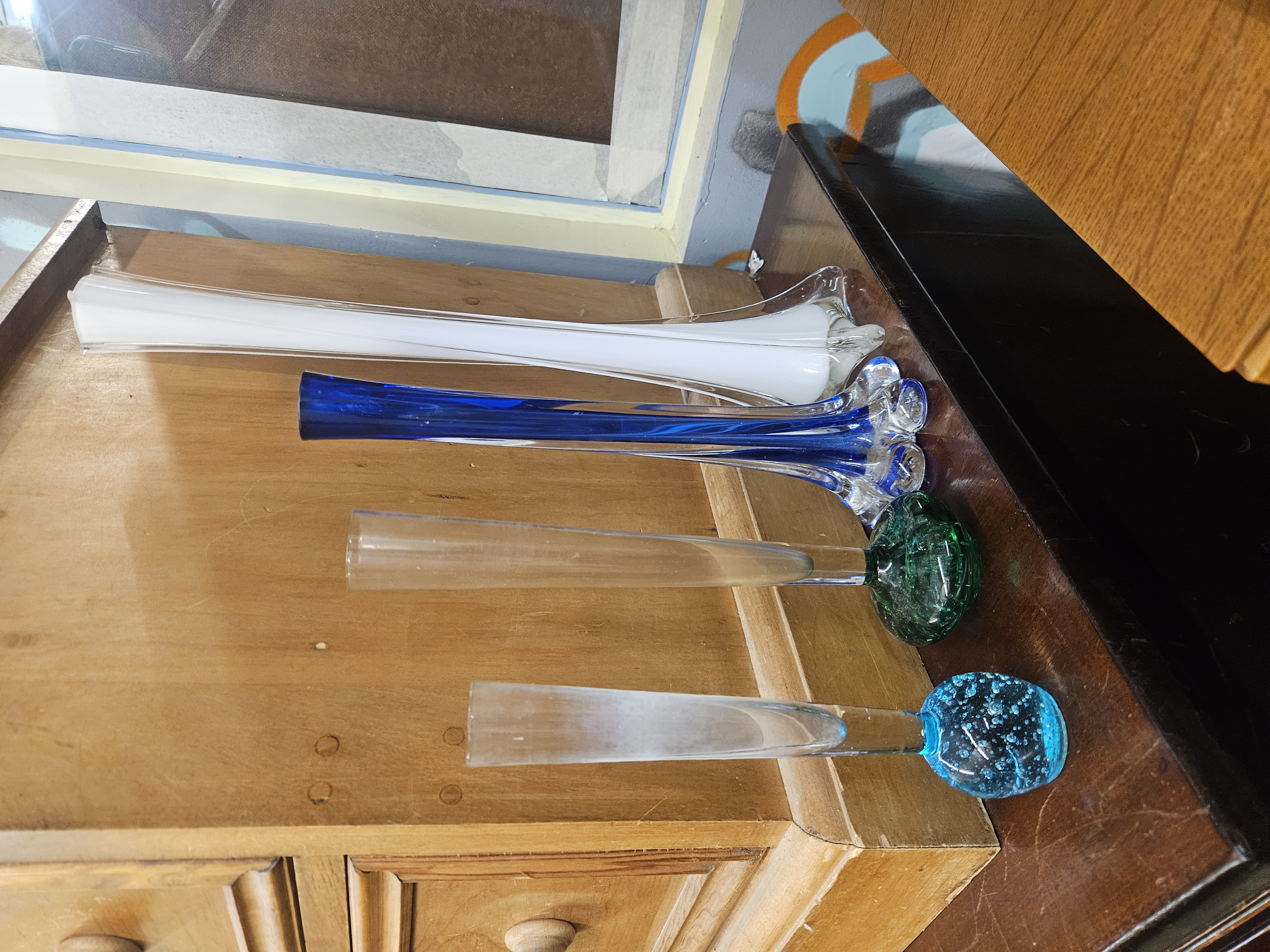 This collection comprises several assorted 20th-century art glass bud vases in the mid-century modern style. The group includes a tall swung vase featuring a white opaque interior cased in clear glass, with a flared undulating rim and a four-pointed base. Also included is a cobalt blue swung vase with internal ribbing cased in clear glass, featuring a lobed flower-form base. The collection further contains soliflore vases with tapered clear glass necks and weighted spherical bases in emerald green and light blue colours. These bases feature controlled internal air bubble inclusions, a technique known as bullicante, often associated with Murano glass production. No maker marks, signatures, or labels are visible on any of the pieces. The styles are consistent with British and European decorative glass from the mid-to-late 20th century.