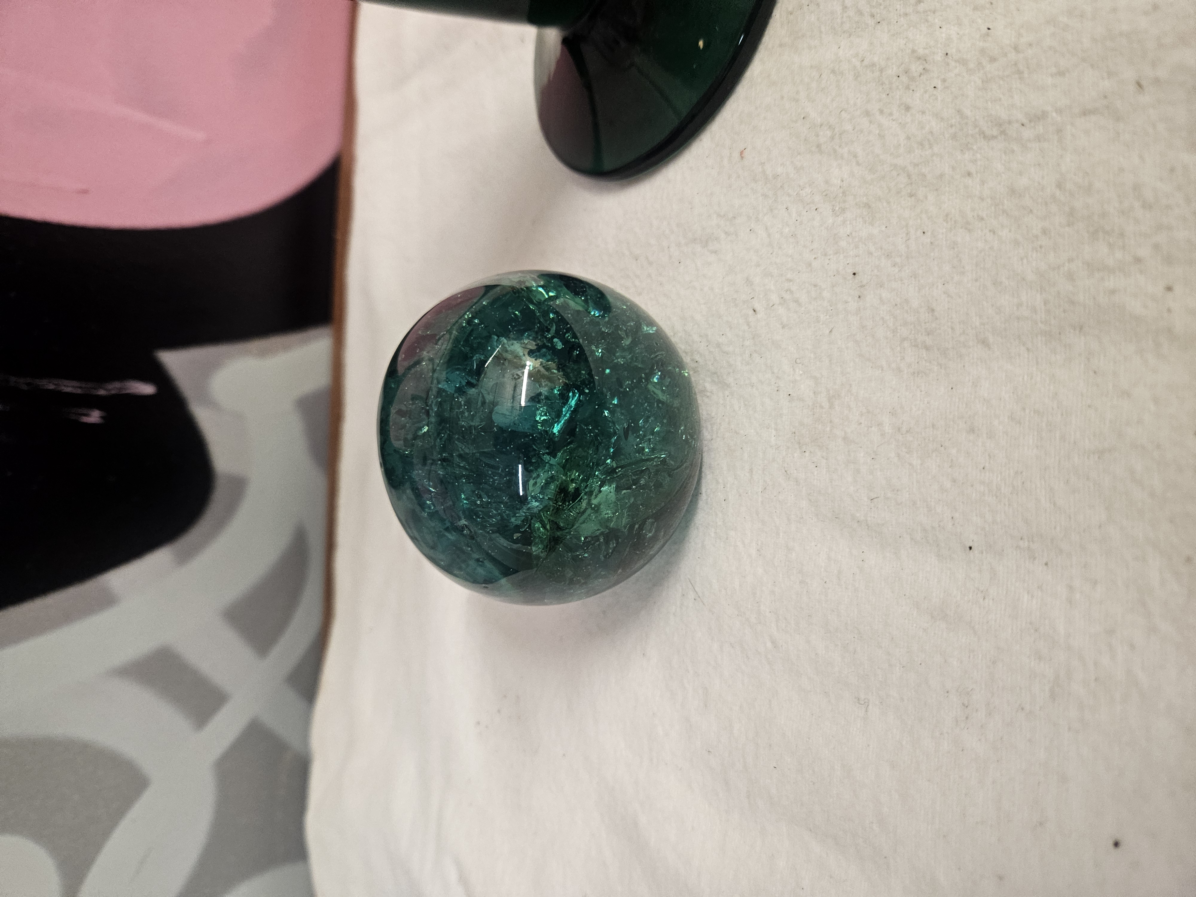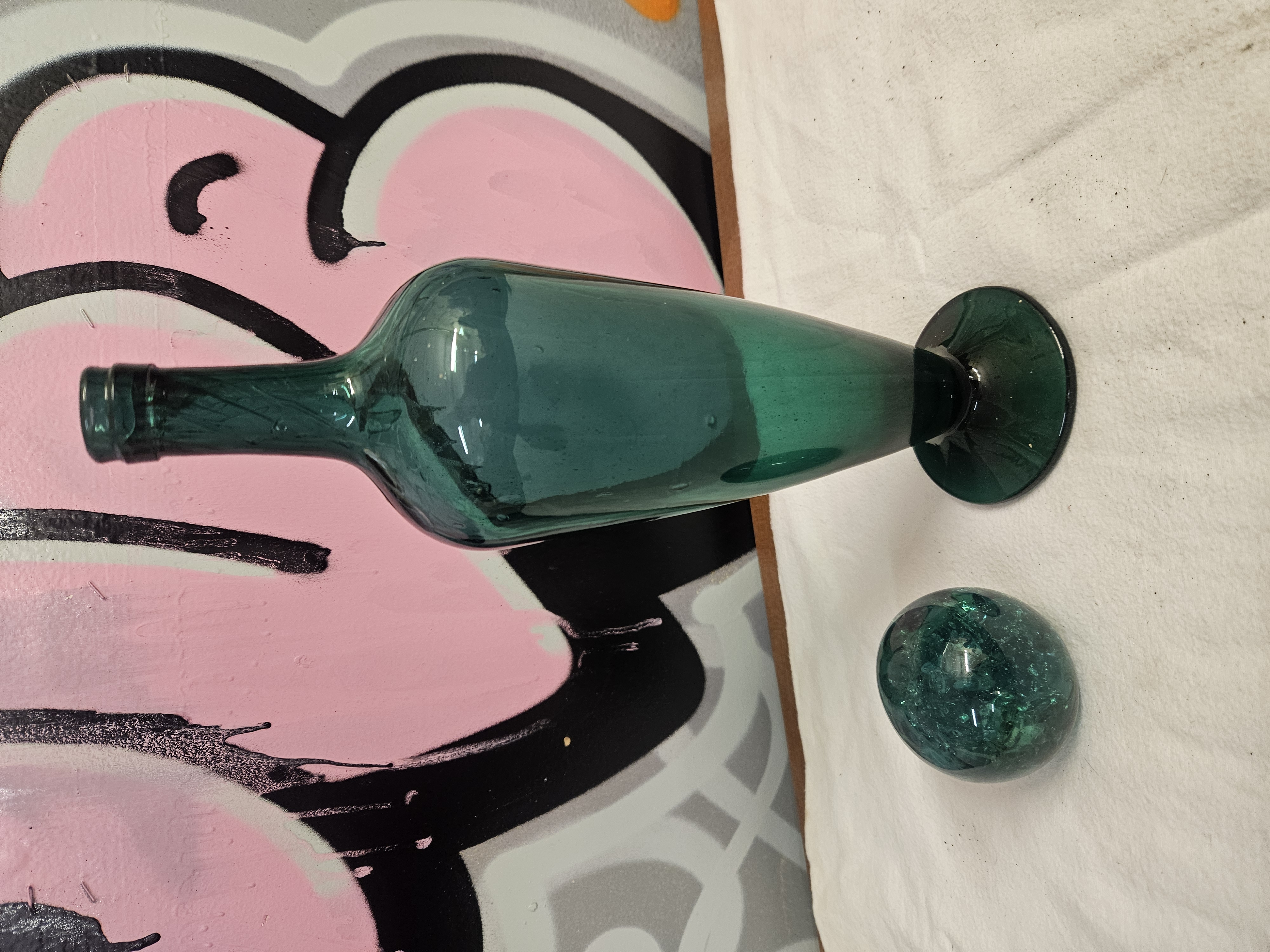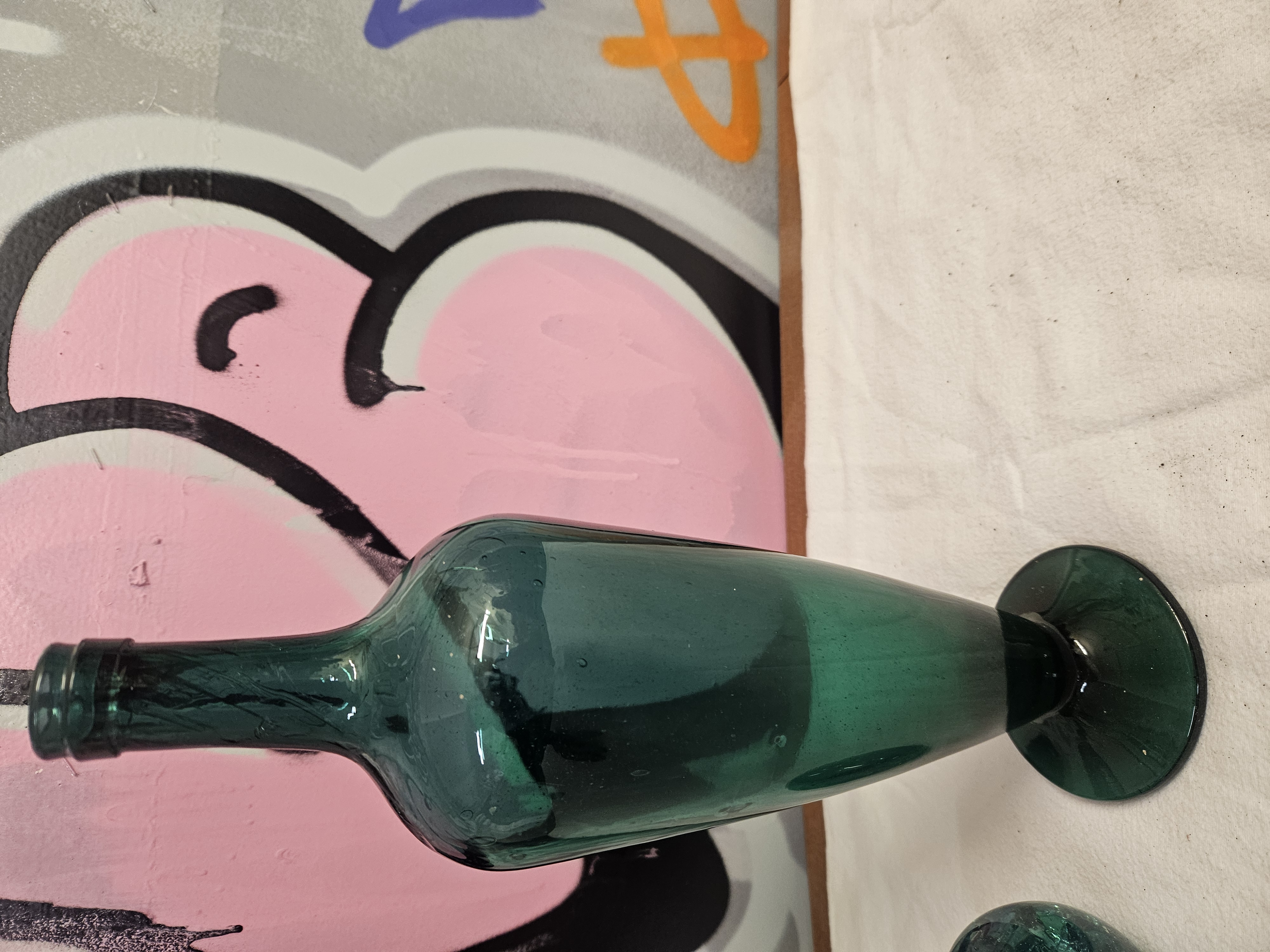 A hand-blown art glass decanter and matching stopper produced in a deep teal or emerald green colour. The vessel is designed with a tapered, ovoid body resting on a flared circular foot, leading to a narrow cylindrical neck with a slightly stepped rim. It is paired with a solid glass spherical stopper featuring a heavily textured internal crackle or seafoam effect. The glass body contains small, intentional air bubbles, or seeds, characteristic of the hand-blowing process. The foot is separately applied to the body. No maker marks, signatures, or labels are visible on the base or body. The style and execution are consistent with mid-20th-century studio glass from the 1960s or 1970s, resembling production from British glasshouses such as Whitefriars or contemporary Scandinavian manufacturers.