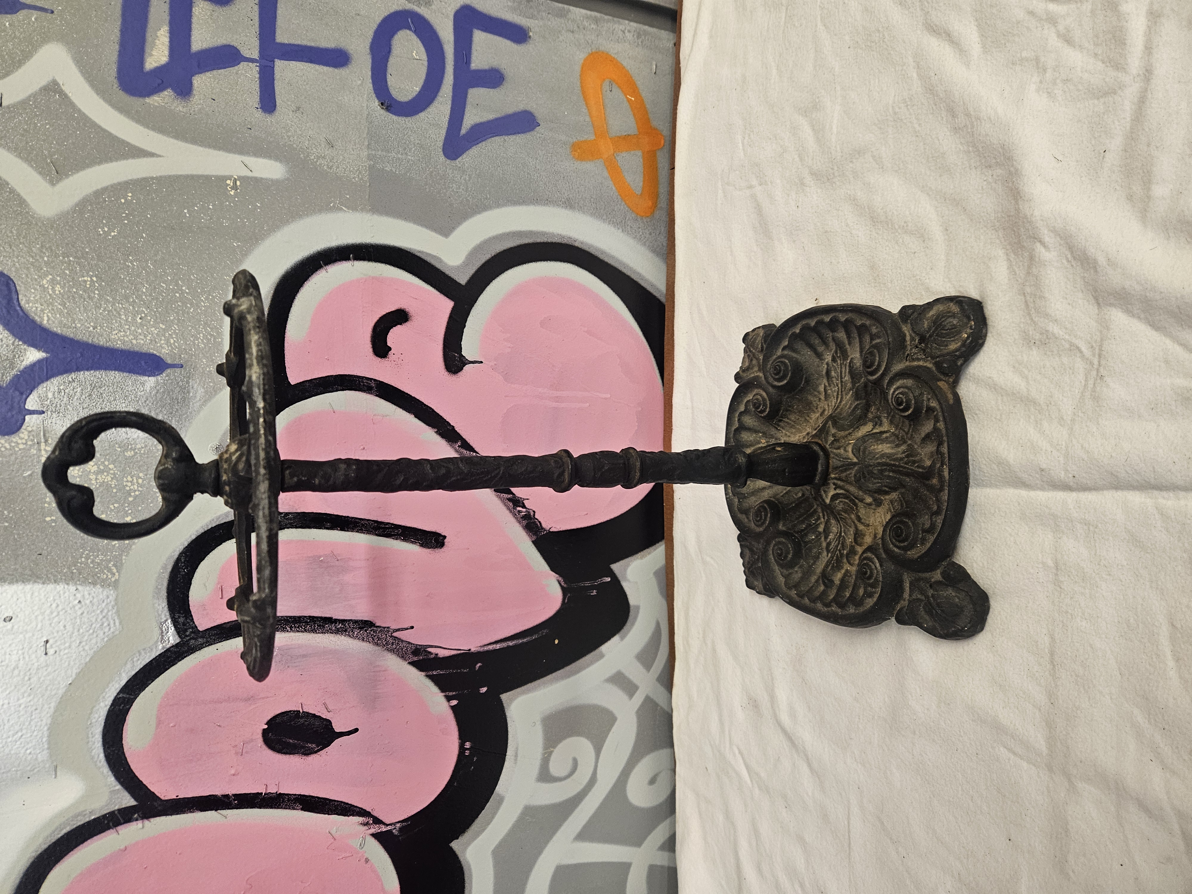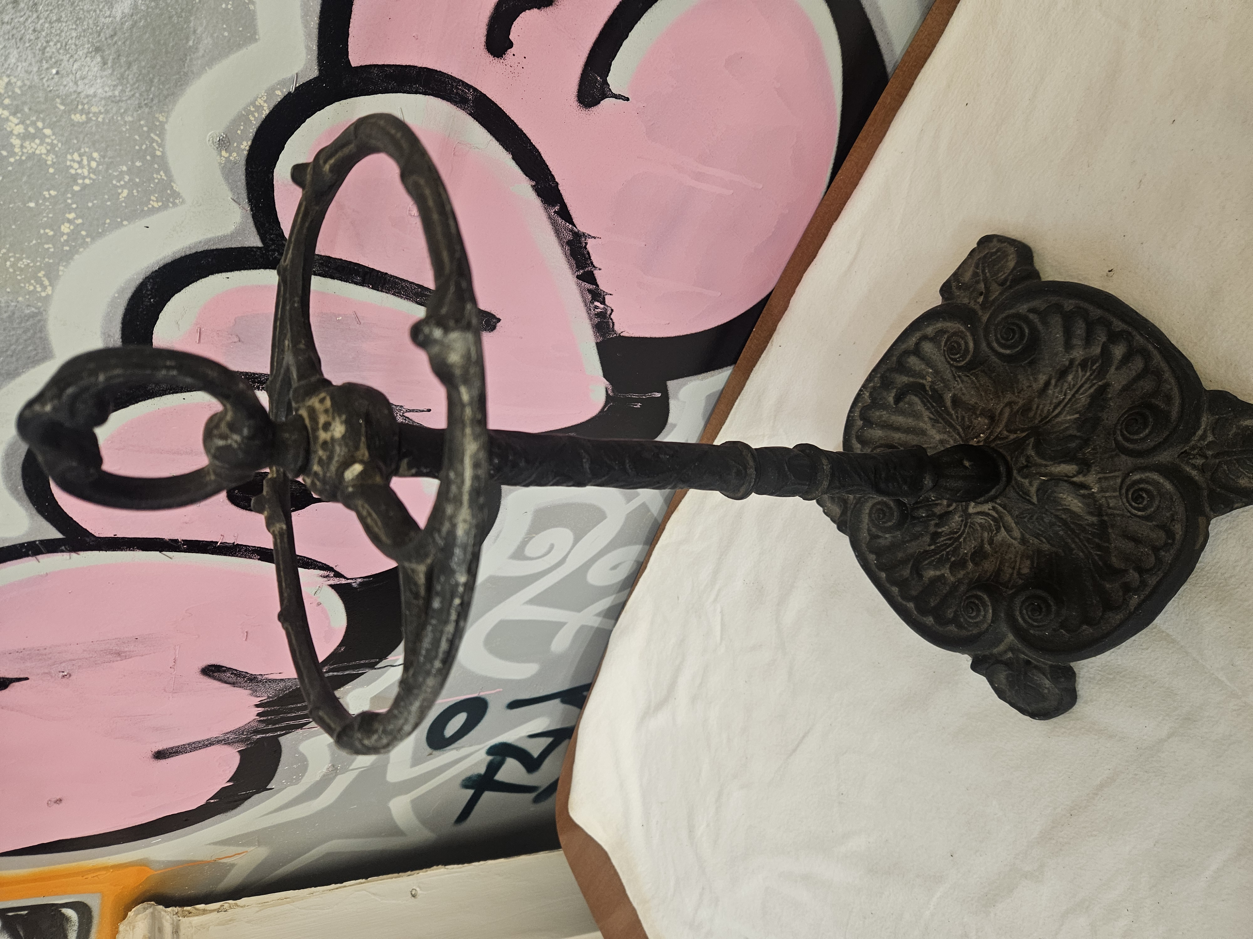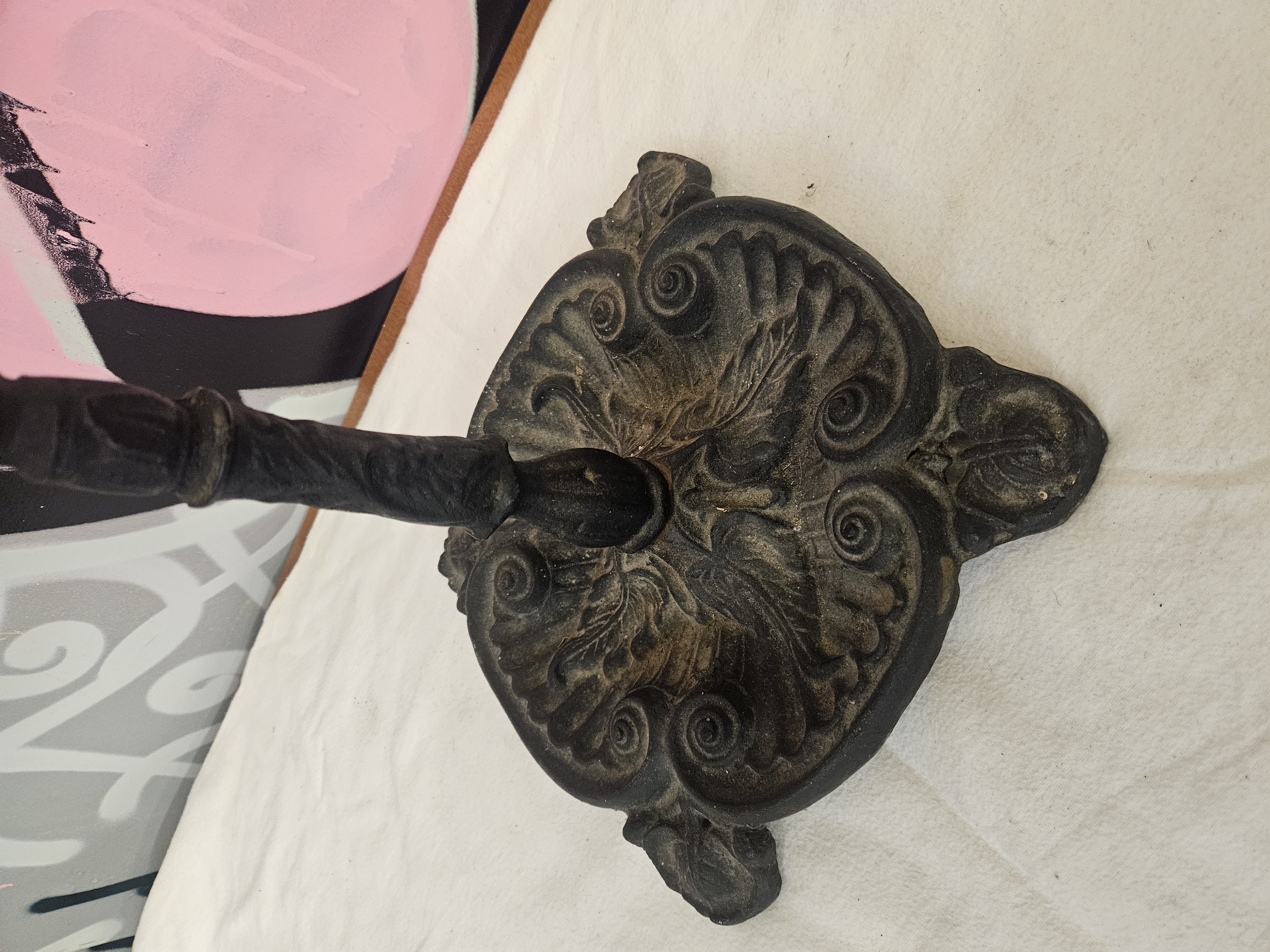 A cast iron stand in the Rococo Revival style, likely intended as a support for a fireplace companion set. The piece features a circular top ring with three internal support prongs, topped by a heart-shaped finger loop handle. The central vertical stem is knopped and textured, leading to a wide, ornate quadrilobed base. The base is decorated with cast C-scrolls, acanthus foliage, and shell motifs, resting on four integral feet. The surface retains a dark finish, possibly japanned or painted. No manufacturer marks or foundry stamps are visible.