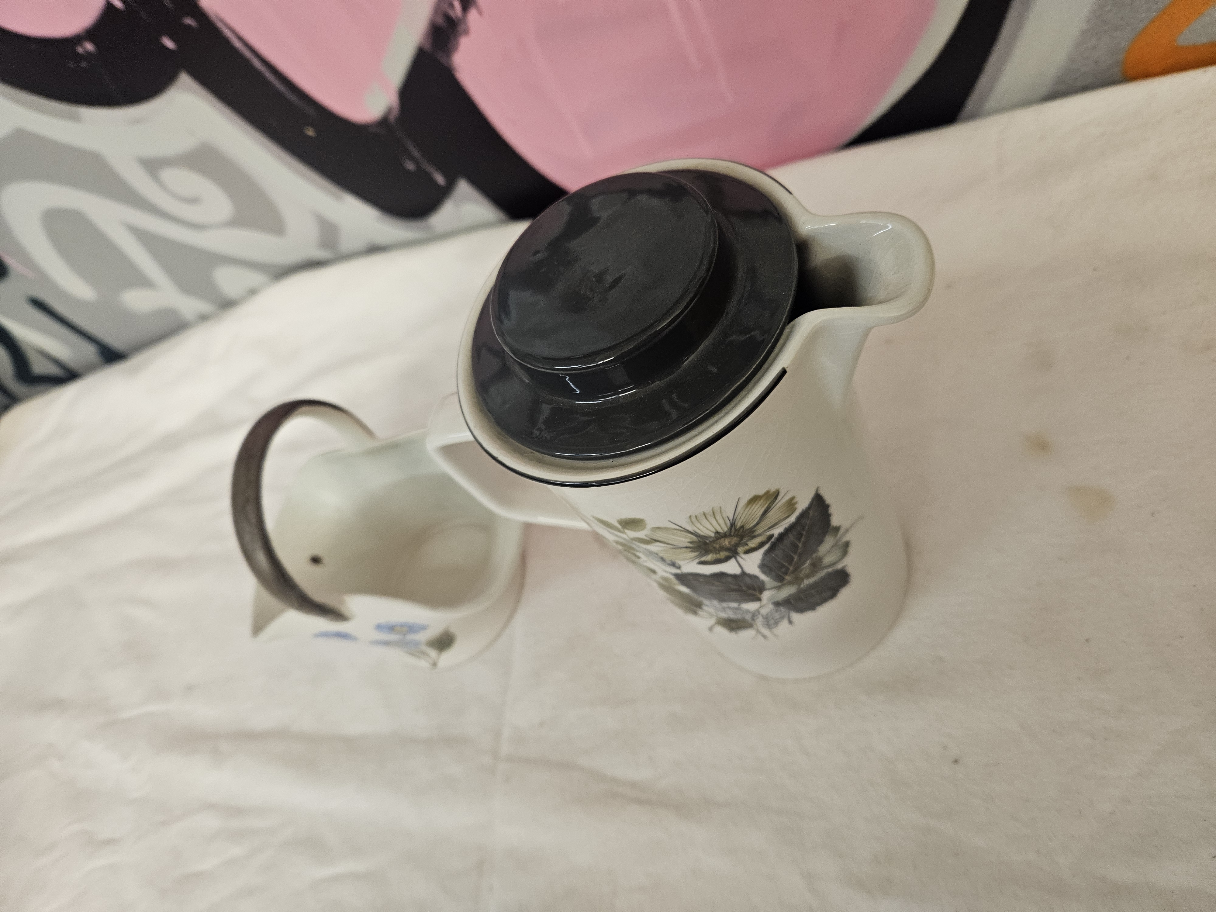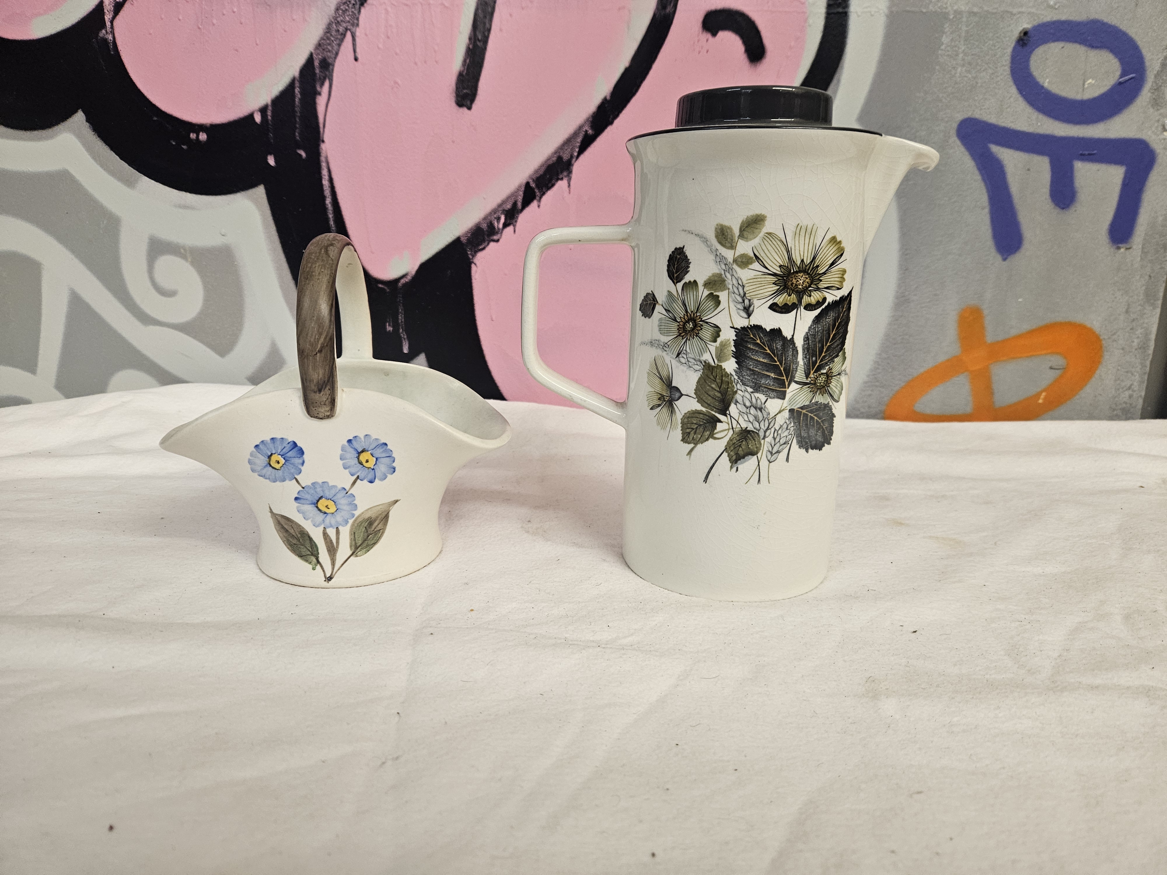 This lot consists of two items of decorative white earthenware. The first item is a tall, cylindrical coffee pot or pitcher of mid-century design. It features a square-set handle, a short pouring spout, and a fitted ceramic lid with a black glaze. The body is decorated with a transfer-printed botanical motif of large daisy-like flowers and foliage in a palette of muted greens, greys, and ochre. The second item is a miniature ceramic vessel modelled in the form of a garden trug or basket with an overhead handle. It is hand-painted with a spray of three blue flowers with yellow centres and green leaves. The handle is finished with a textured, sponged, or brushed dark grey pigment. No maker’s marks are visible on the exterior or base of either piece.