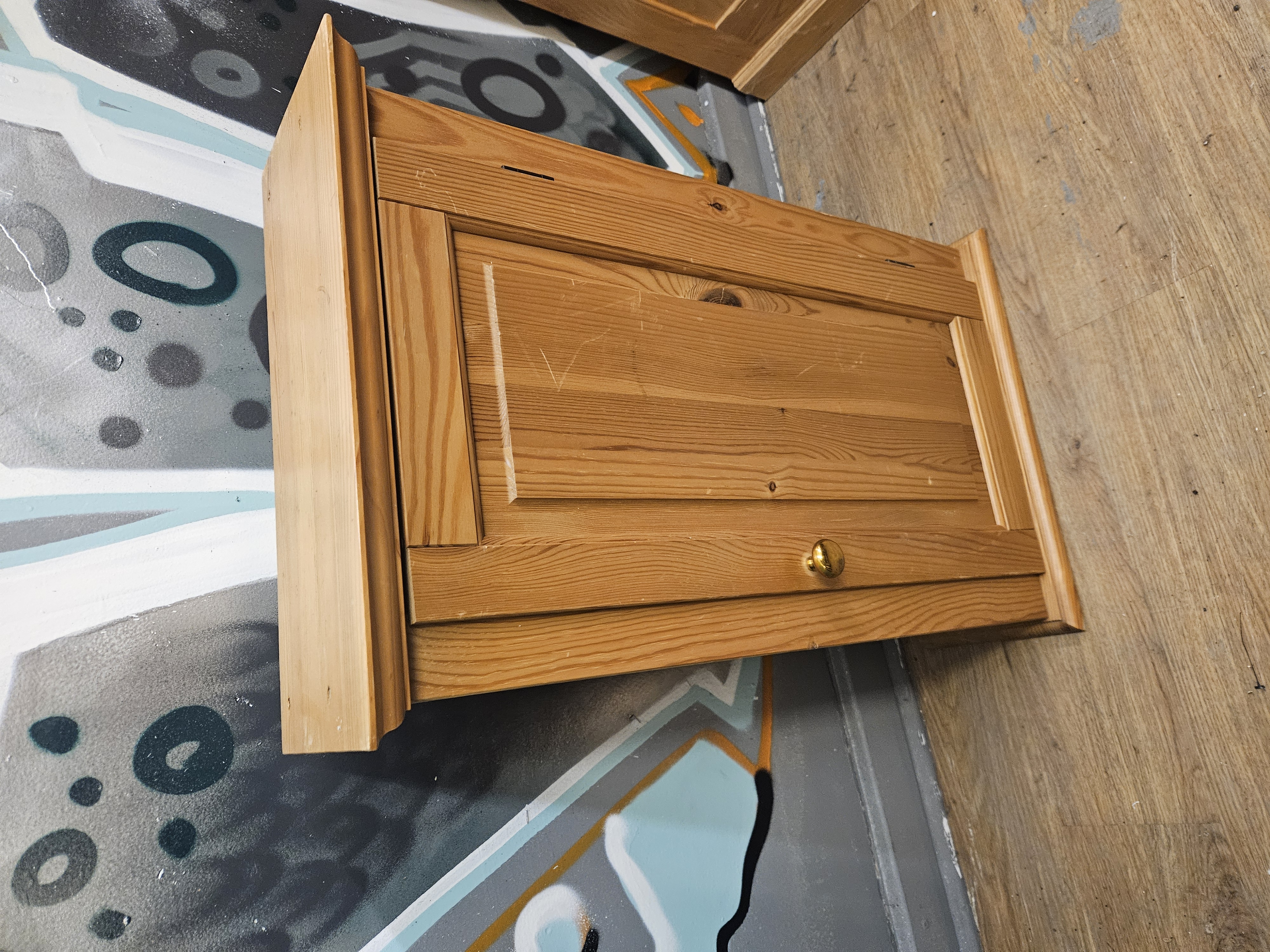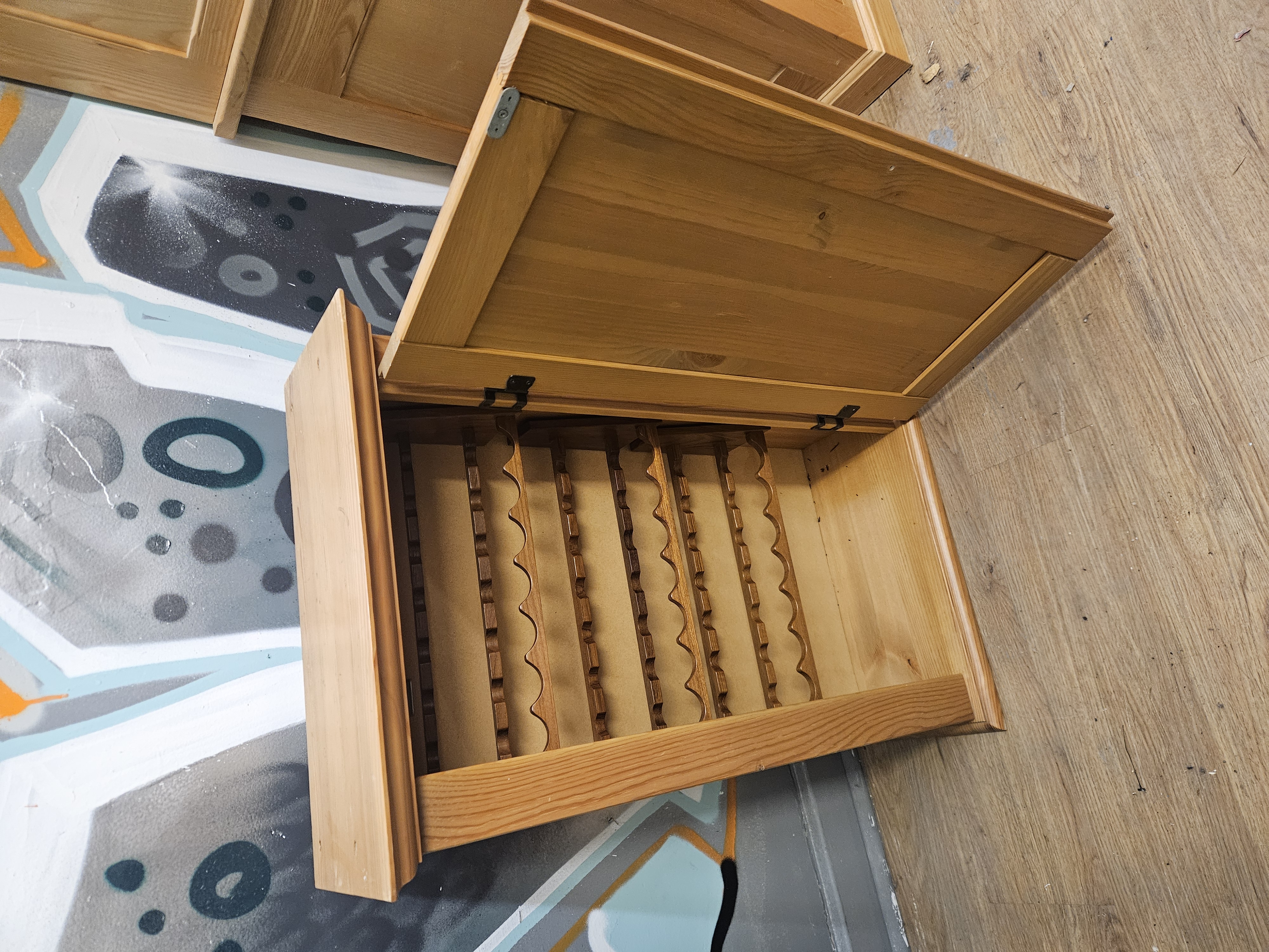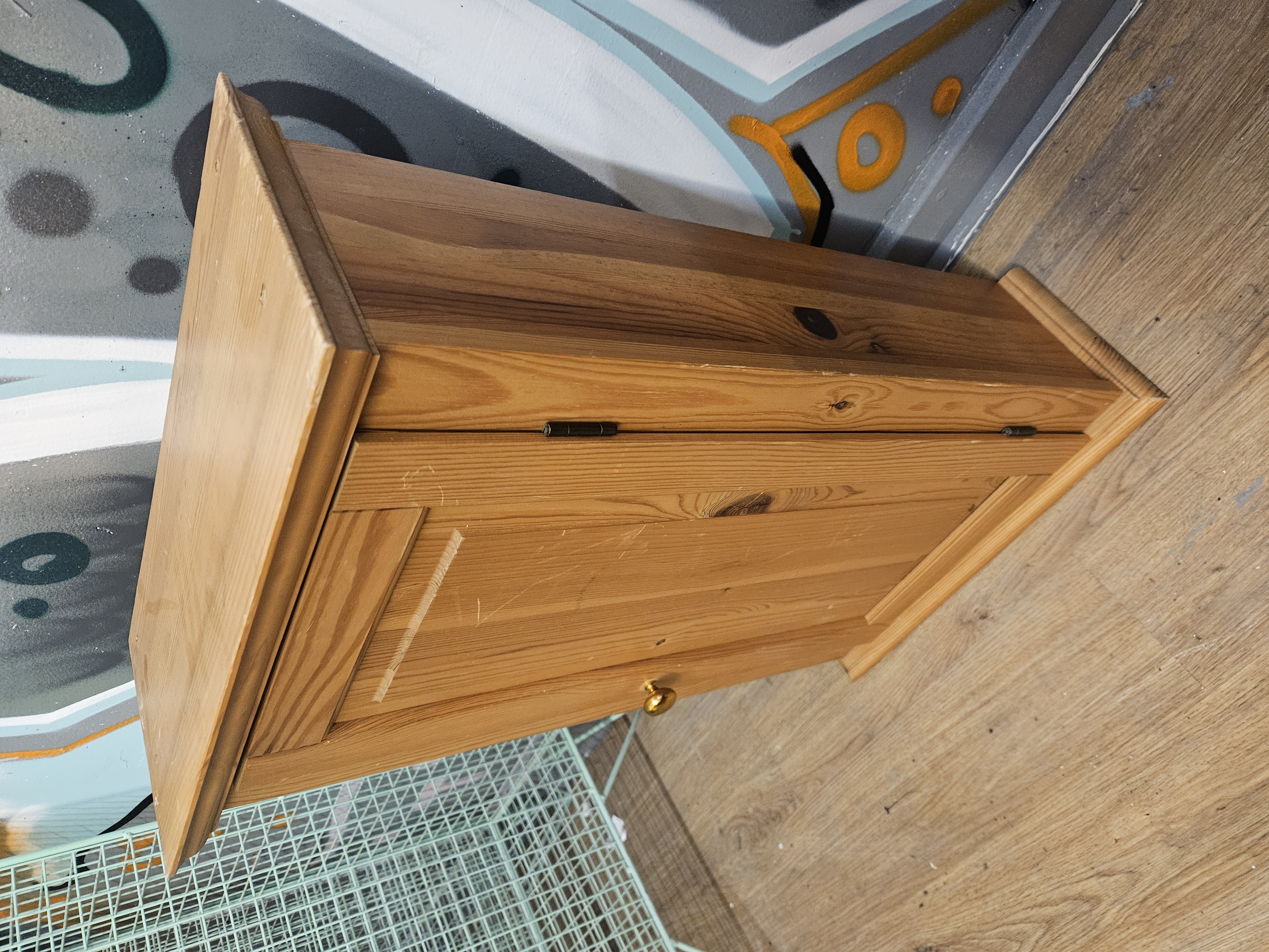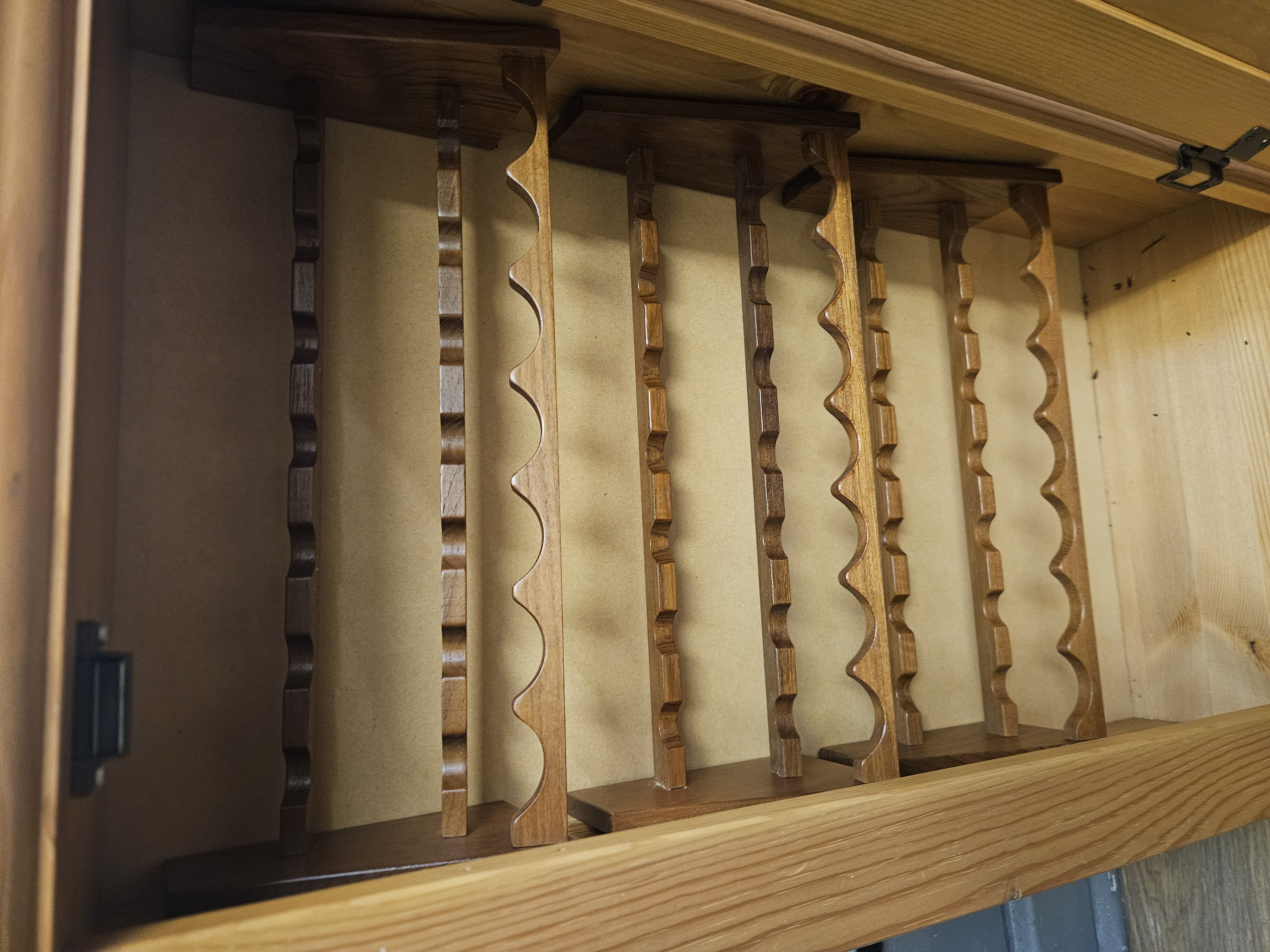 A late 20th-century country-style wall-mounted plate cupboard of single-piece construction. The unit is constructed from solid pine with a light natural finish and a secondary wood back panel. It features a single solid raised-panel door. The interior is fitted with six scalloped vertical dividers, providing seven slots for the upright storage of plates. Hardware comprises two black-finished external butt hinges, a single brass-toned circular knob handle, and an internal black magnetic catch. No maker’s marks, stamps, or labels are visible.