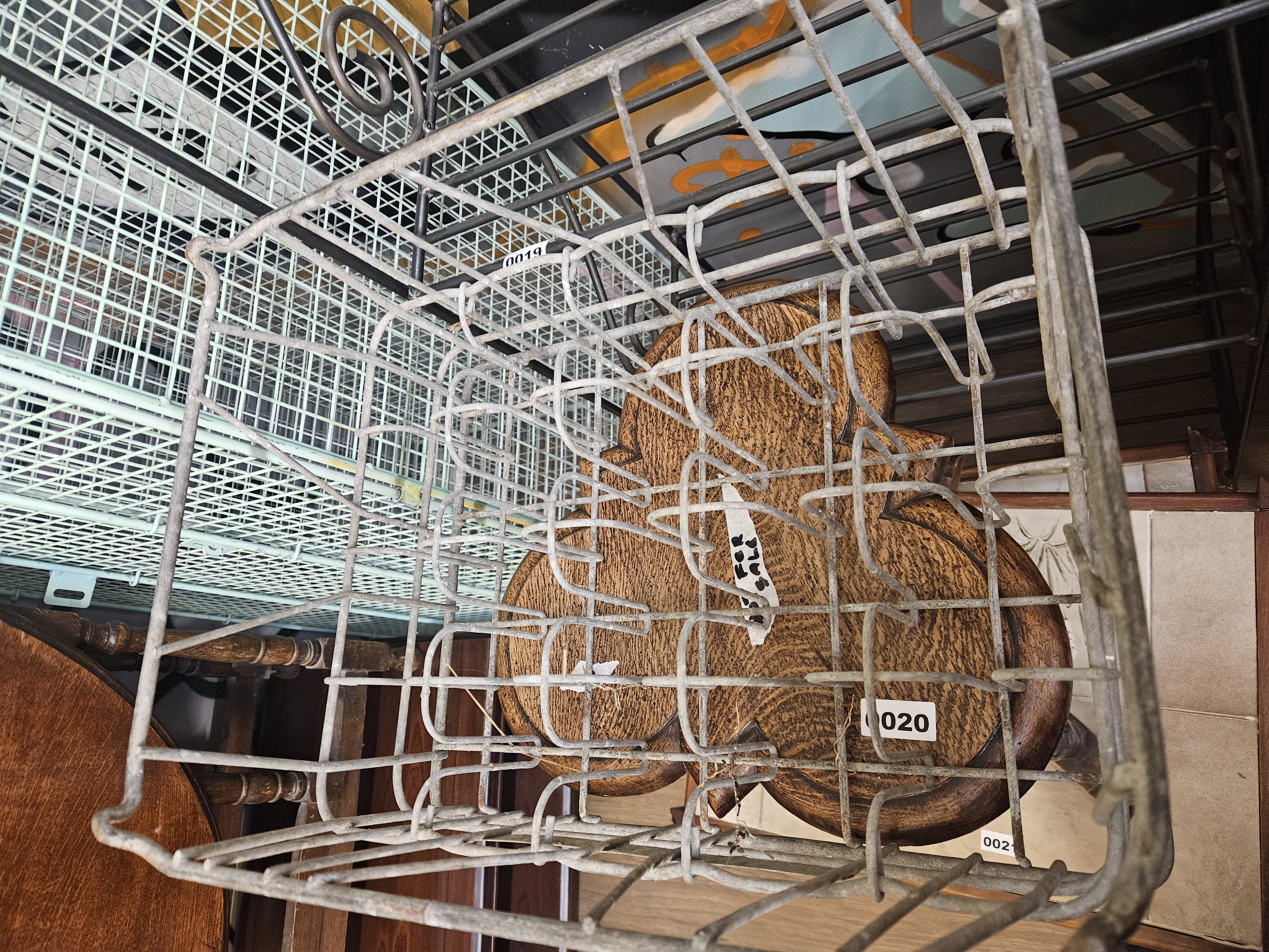 Terry’s Dairies milk bottle crate. This mid-20th century industrial item is manufactured from heavy-gauge galvanised steel wire. The crate features a welded wire frame with an integrated interior grid divider designed to hold twenty standard milk bottles. A rectangular metal plate is embossed with the name Terry’s Dairies and is attached to the front of the structure. The construction consists of a thick-gauge outer frame with thinner wire dividers forming the internal compartments. The design includes integrated handles formed by the top rail of the wire structure.
