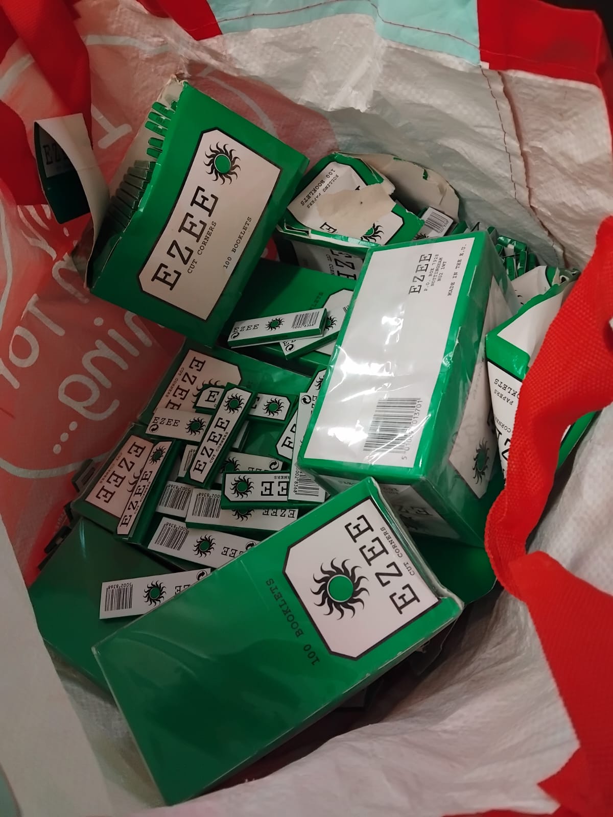 A collection of EZEE Green Cut Corners rolling papers presented in a red reusable carrier bag. The lot comprises several outer display cartons and a volume of loose individual booklets. The outer cartons are marked as containing 100 booklets each and feature the manufacturer address P.O. BOX 7928 Nottingham NG2 1WT and are stated as Made in the E.U. The packaging displays the brand name EZEE and the specific product type Cut Corners. The outer display cartons bear the barcode 5010046013701 and the individual booklets bear the barcode 50028368. The items are finished in green and white branded packaging.