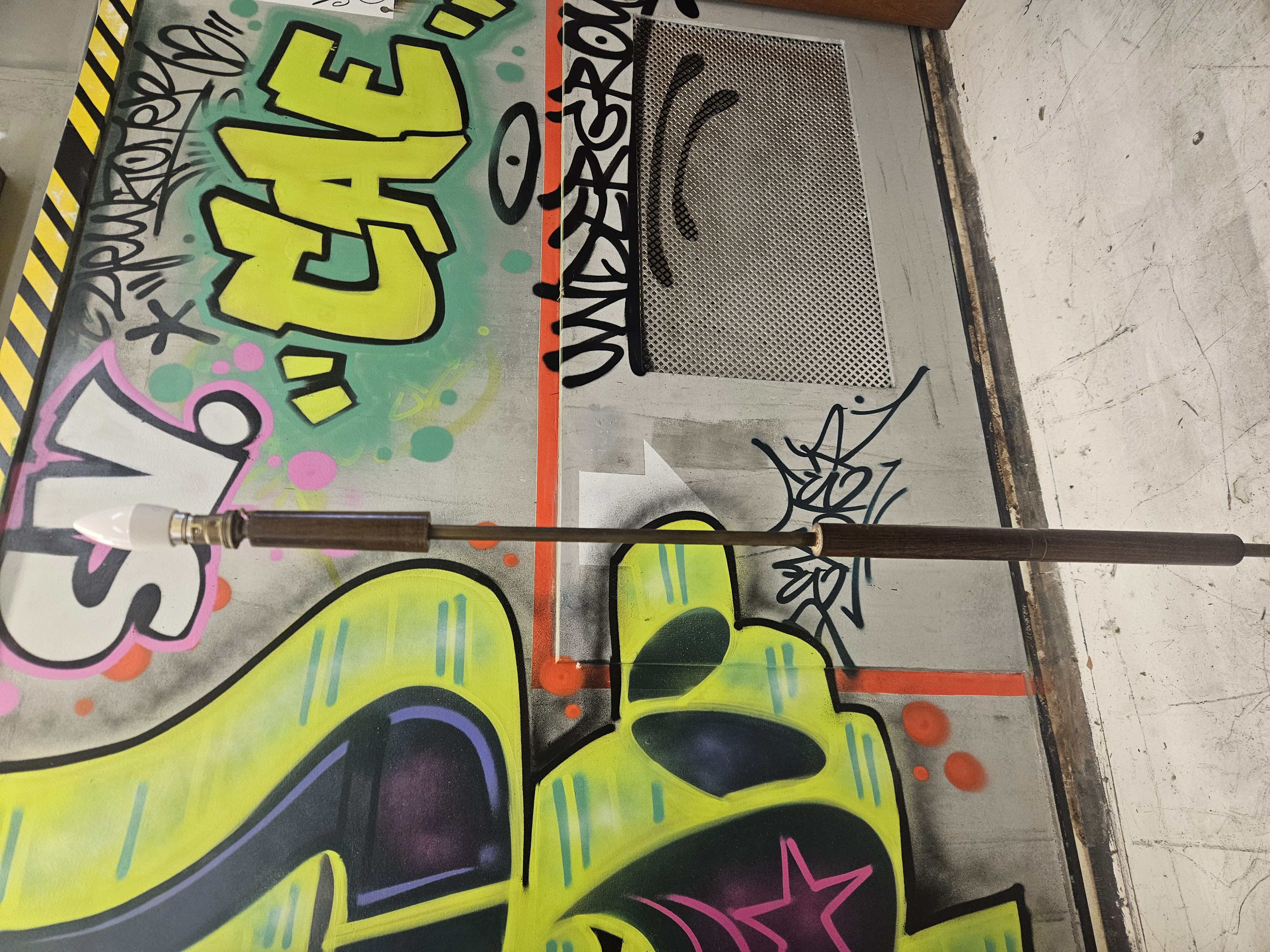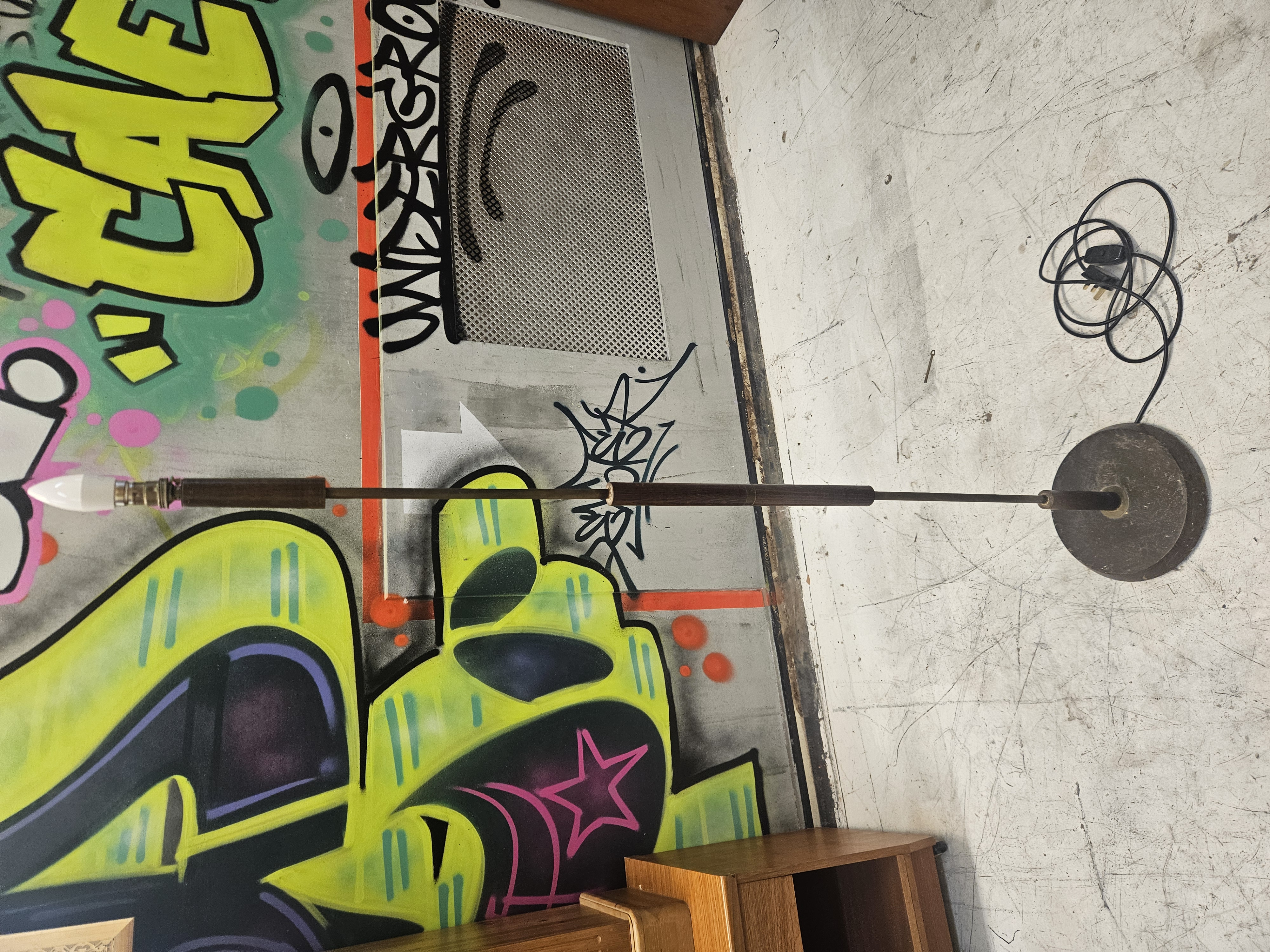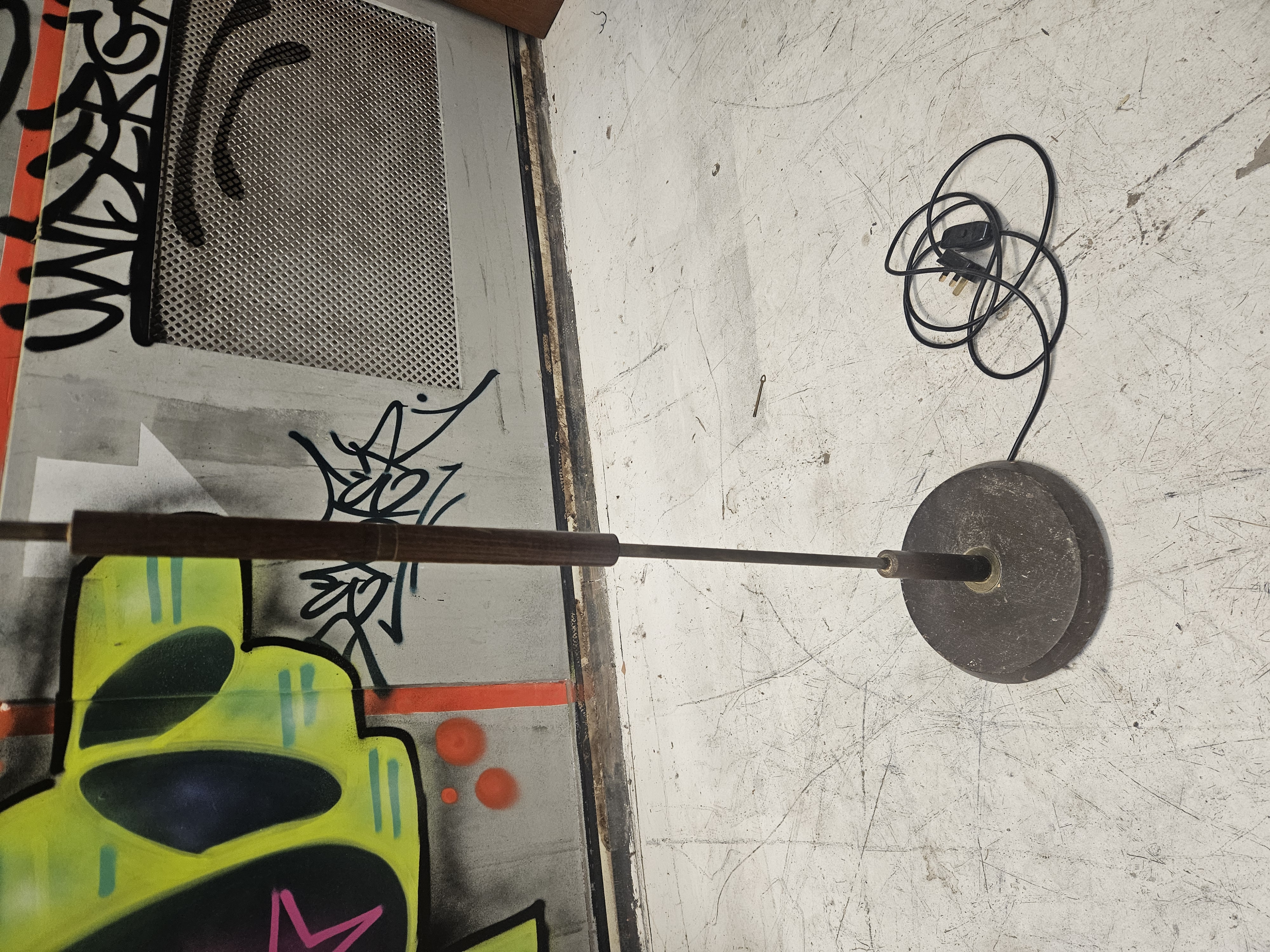 A Mid-Century Modern floor lamp featuring a slender stem constructed from alternating sections of dark-stained wood, likely teak, and brass-toned metal. The lamp is supported by a circular, weighted metal base with a textured finish. It is fitted with a single bayonet-mount bulb holder and currently contains a decorative flame-tip bulb. The electrical components include a modern black plastic-coated cable, an inline on/off switch, and a standard UK three-pin plug. This item is sold as a decorative object and should be PAT tested by a qualified electrician before use. No maker’s marks or signatures are visible on the base, stem, or socket.