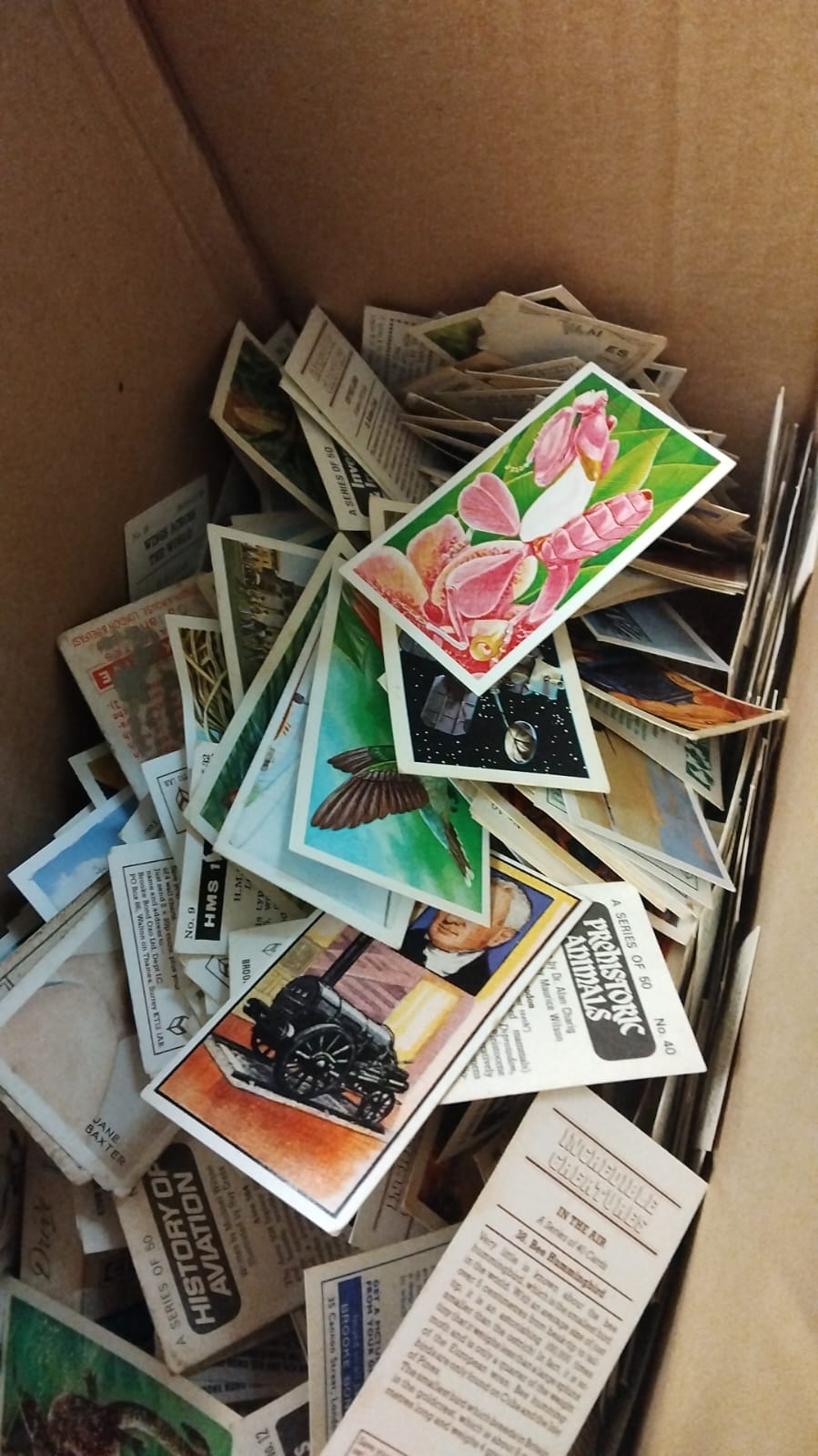 A significant quantity of loose collectible trade cards, estimated to be in the hundreds, primarily issued by Brooke Bond and Co. and Brooke Bond Oxo Ltd. The collection dates from the mid to late 20th century, circa 1960s to 1980s, and originated in the United Kingdom. The cards encompass a wide variety of educational and natural history themes. Specific series identified include Prehistoric Animals, featuring illustrations by Maurice Wilson and text by Dr. Alan Charig, History of Aviation, and Incredible Creatures. Notable individual cards include No. 40 from the Prehistoric Animals set and No. 38 Bee Hummingbird. Other visible subjects include botanical studies, space exploration, steam-powered machinery, and various wildlife. Printed marks on the reverse include Brooke Bond Oxo Ltd. Dept P.C. PO Box 88, Walton on Thames Surrey and Brooke Bond 35 Cannon Street, London.