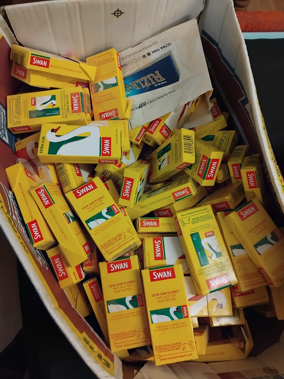 A large collection of smoking accessories, primarily comprising retail-ready packets of Swan brand filter tips and Rizla+ rolling papers. The Swan products include various formats such as 102 Pre Cut Filter Tips, 120 Filter Tips, and Extra Slim variants. Also present are Green Combi packs containing 50 papers and 50 filters. The packaging features the Swan brand logo and the slogan Britain’s Favourite Filter. The lot also includes a partial outer carton of Rizla+ Thin Blue regular rolling paper booklets. The items are housed within a single cardboard storage box.