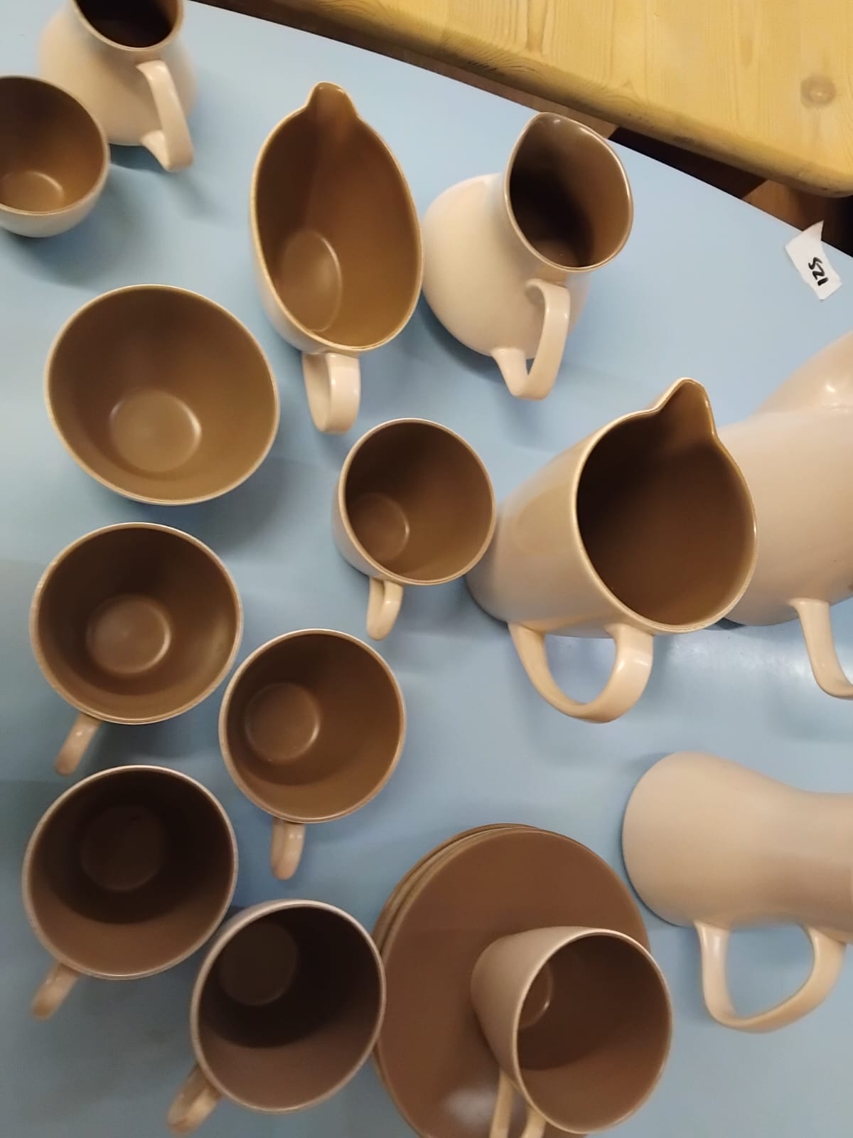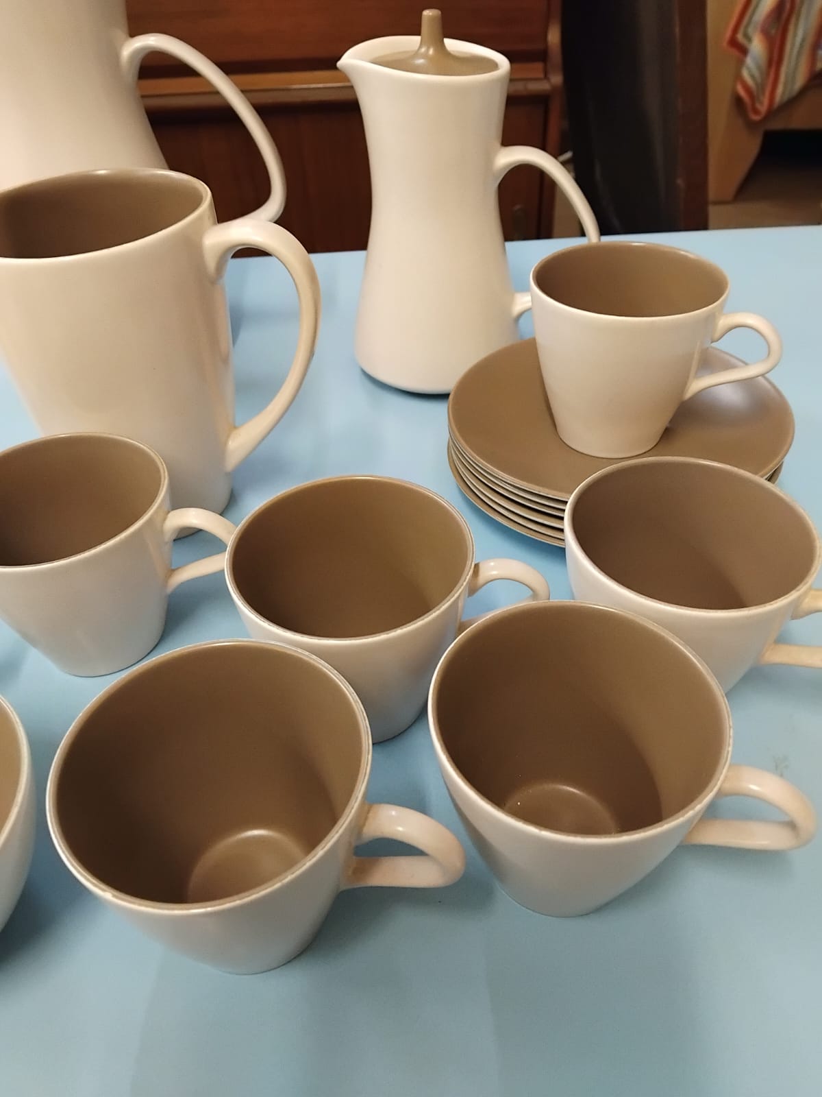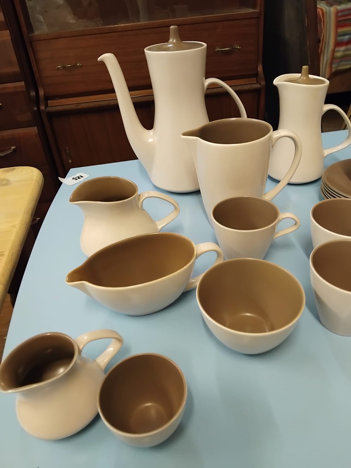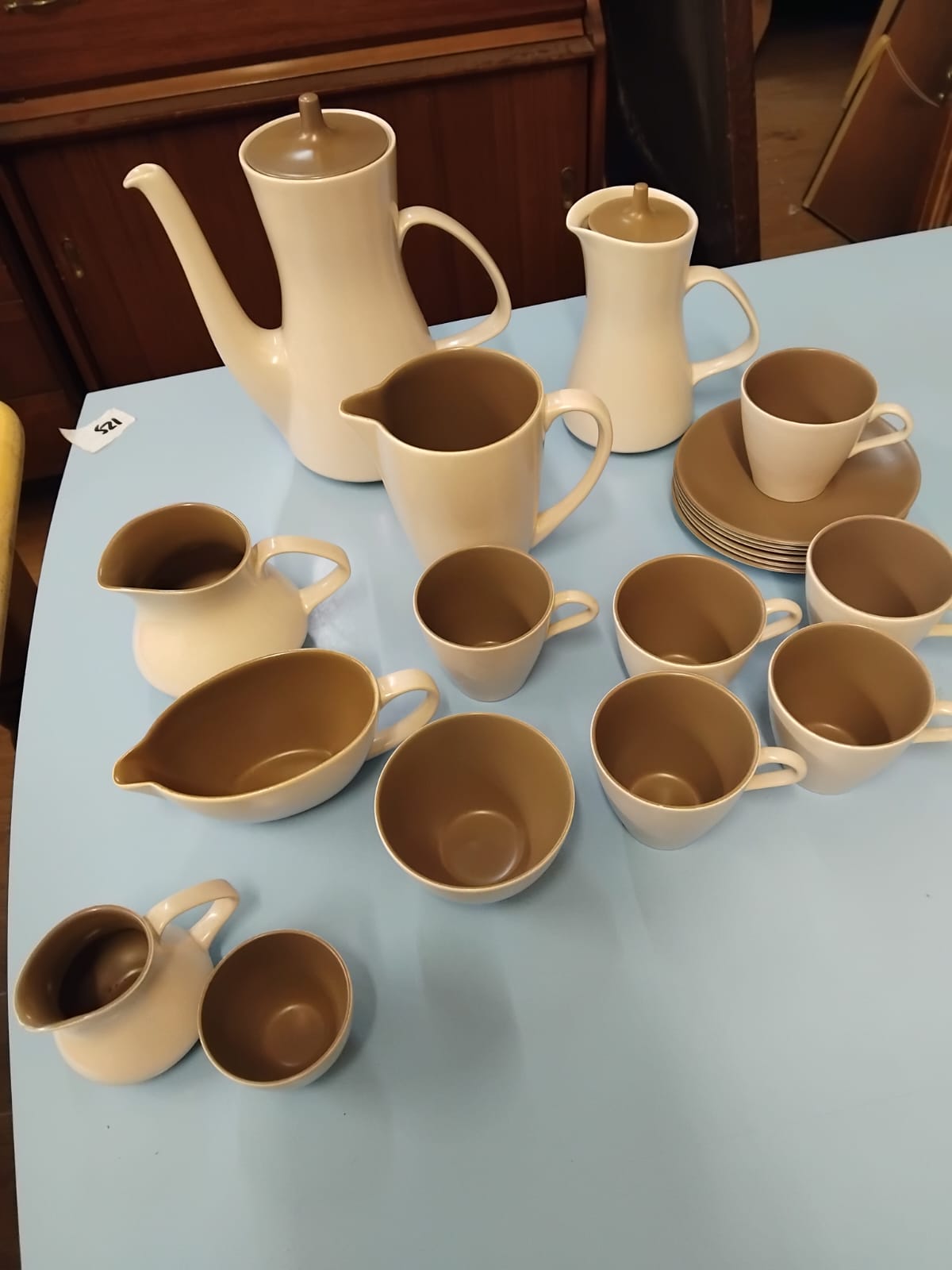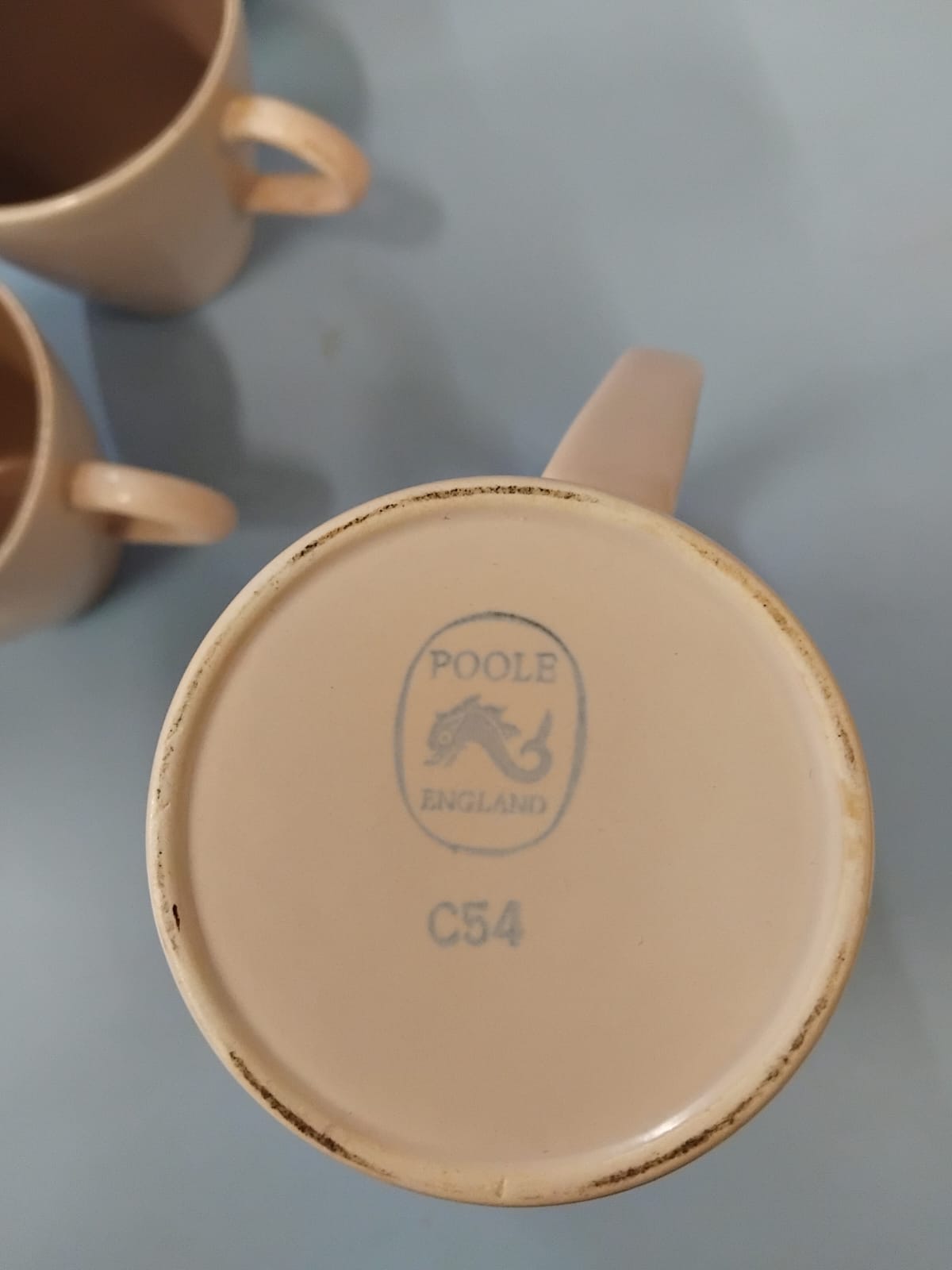 A collection of Poole Pottery earthenware tableware from the Twintone range, featuring the Sepia and Mushroom (C54) colourway. The pieces are finished with matte glazes, characterised by Mushroom cream exteriors and contrasting Sepia dark brown interiors. The set includes a tall coffee pot with a fitted lid, a smaller lidded jug with a lid, a large open milk jug, two graduated cream jugs, a sauce boat, an open sugar bowl, several cups of varying sizes, and a stack of matching saucers. The base of the pieces features a printed blue factory mark comprising the word POOLE above a central dolphin logo and ENGLAND below. The alphanumeric code C54 is stamped underneath the primary mark, identifying the specific glaze combination. This range was manufactured in Poole, Dorset, England.