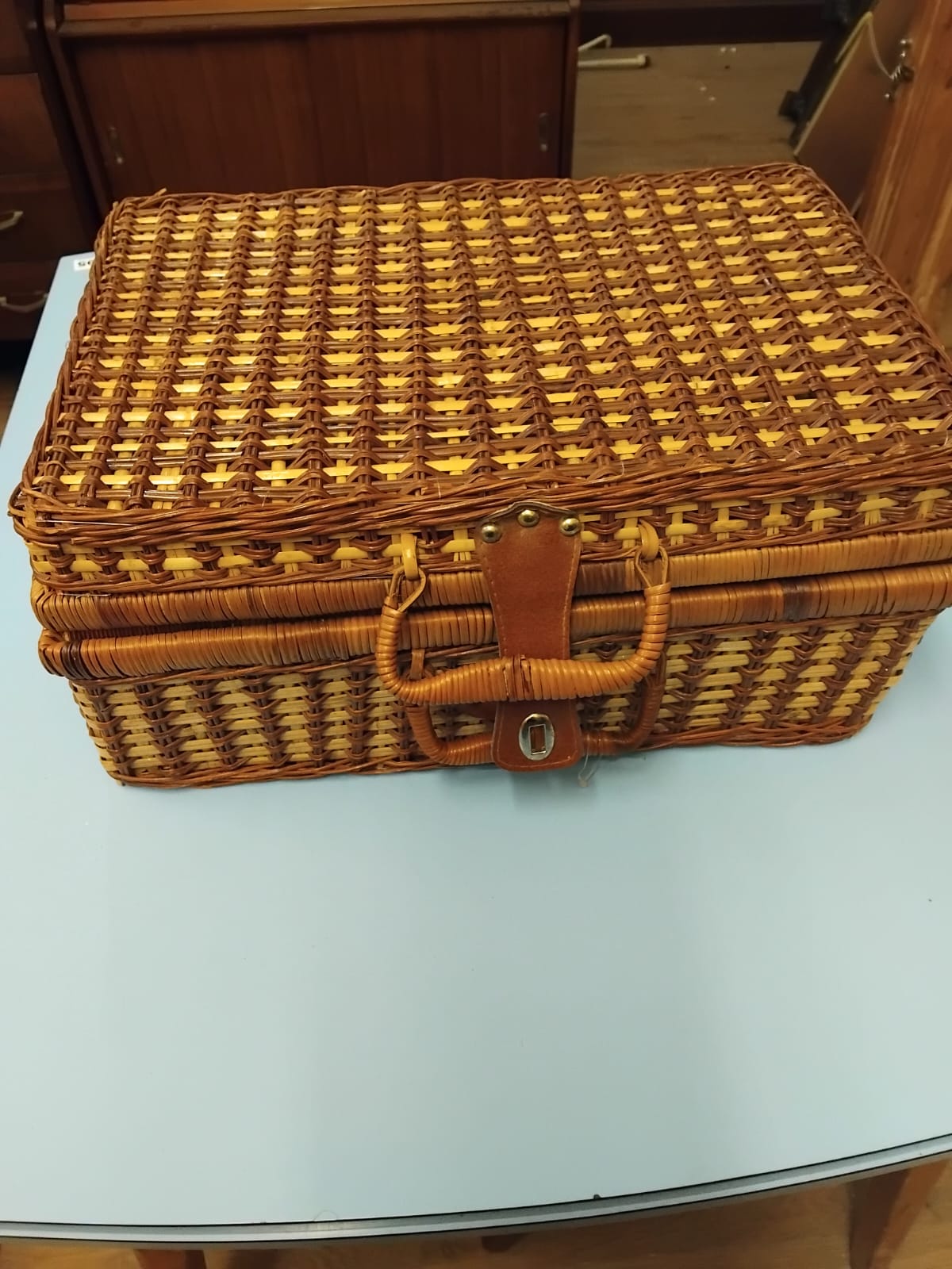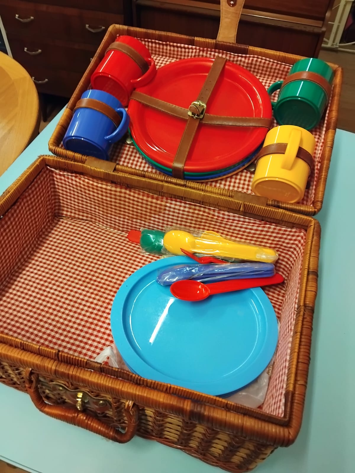 A vintage woven wicker picnic hamper of rectangular form featuring a two-tone woven design in brown and tan. The basket is constructed with a central carrying handle and a leather-effect fastening strap secured by a metal turn-lock closure. The interior is lined with a red and white gingham fabric. The hamper contains a set of plastic picnic items in primary colours including red, blue, yellow, and green. The service comprises plates, mugs, and cutlery, with several items secured to the underside of the lid by brown straps. Additional plates and cutlery are contained within the main compartment, with some pieces remaining in original plastic packaging.