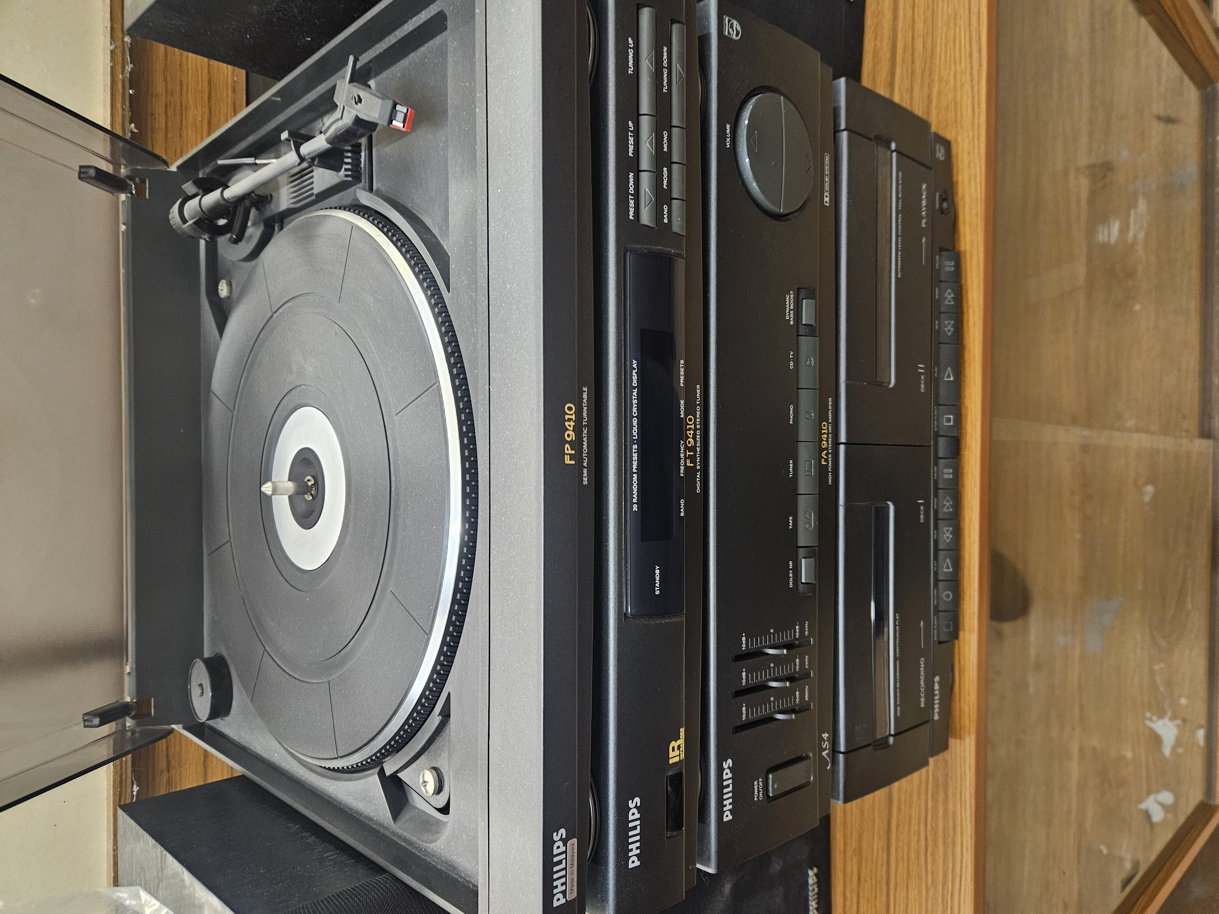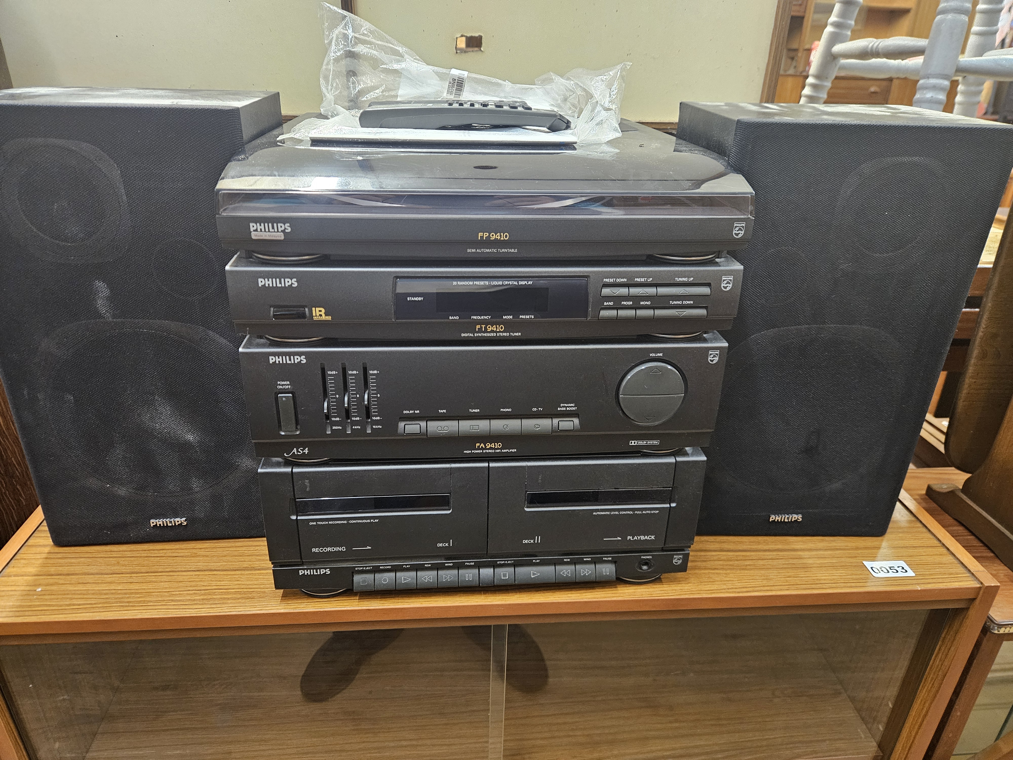 A Philips AS4 series hi-fi component system comprising several stacked units and a pair of matching speakers. The system includes a Philips FP 9410 semi-automatic turntable marked Made in Malaysia, a Philips FT 9410 digital synthesised stereo tuner with a liquid crystal display and twenty random presets, and a Philips FA 9410 high-power stereo hi-fi amplifier. The amplifier features a three-band graphic equaliser, Dolby NR, and dynamic bass boost functionality. The lower section consists of a double cassette deck with a recording deck (Deck I) and a playback deck (Deck II), featuring continuous play and auto-stop controls. All units are housed in black casings. The lot is accompanied by a pair of Philips-branded speakers with black textile grilles and a remote control. An auction lot tag numbered 0953 is attached.