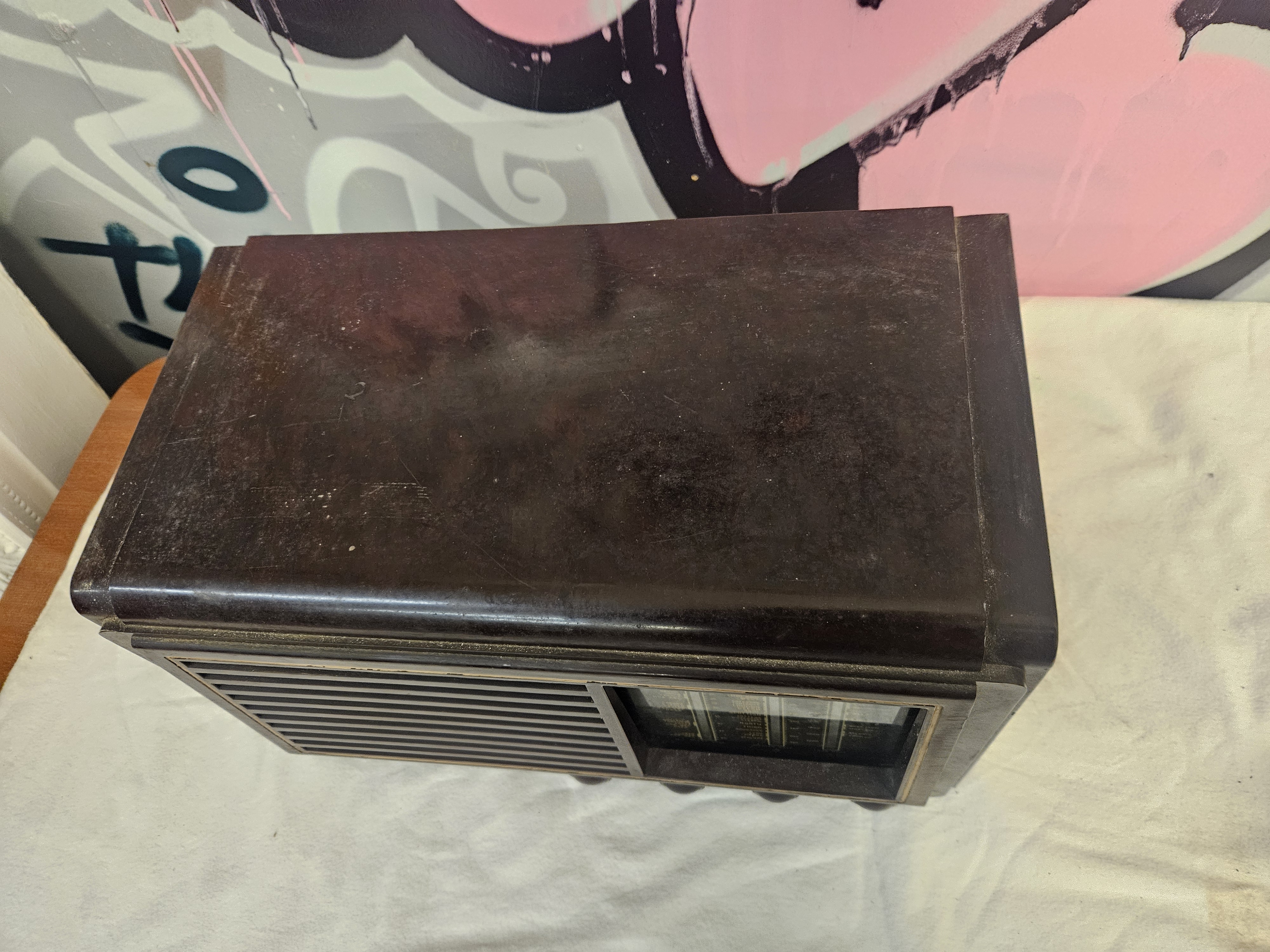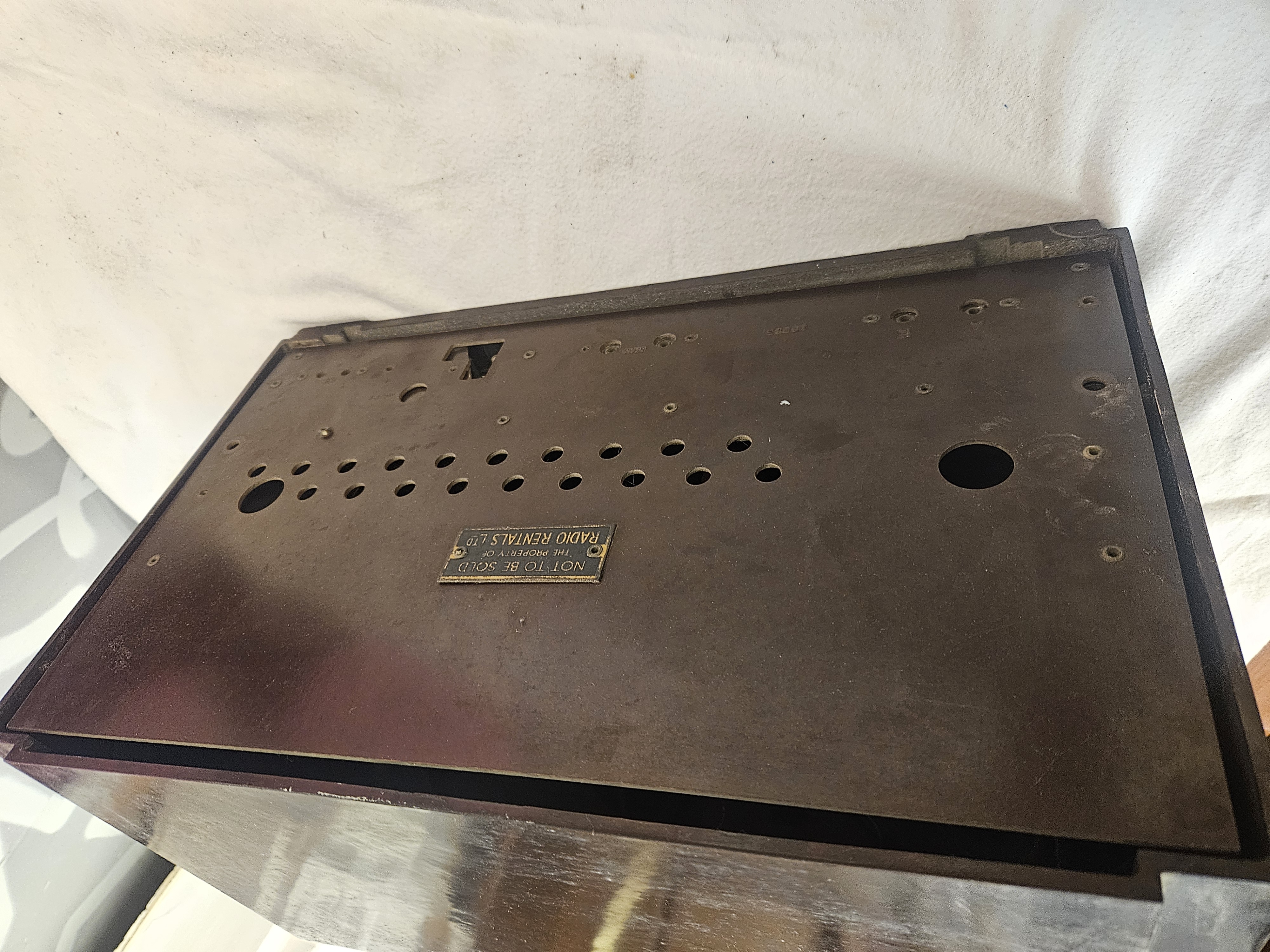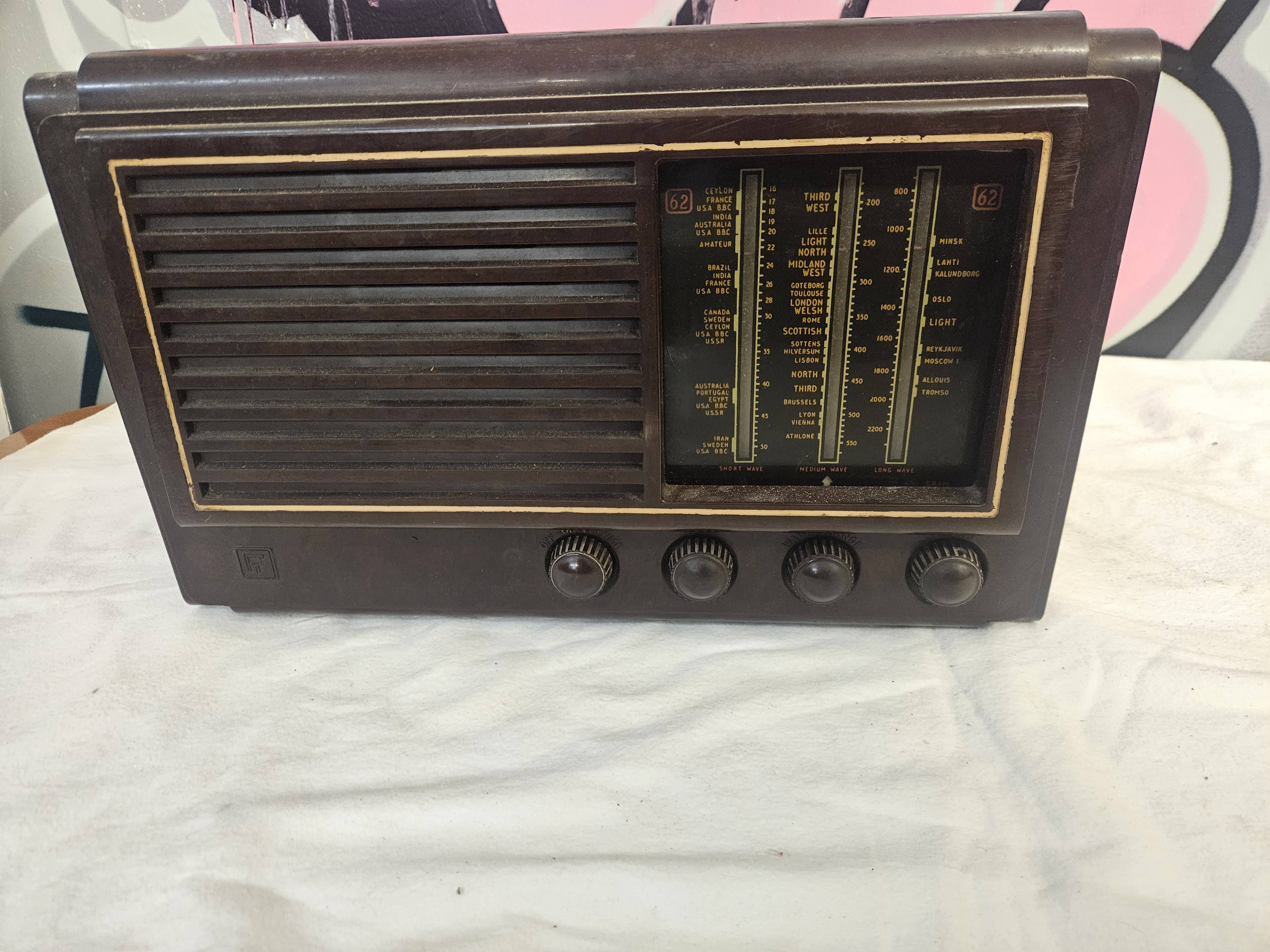 A mid-20th-century British table radio manufactured by Radio Rentals Ltd, identified as Model 62. The unit is housed in a dark brown bakelite cabinet featuring stepped Art Deco style shoulders. The front elevation consists of a horizontal louvred speaker grille to the left and a large rectangular glass tuning dial to the right. The dial displays three frequency bands: Short Wave, Medium Wave, and Long Wave, with various international and domestic station names including USA BBC, London, Scottish, and Moscow I. Below the dial and grille are four circular brown bakelite control knobs for power/volume, tuning, and wave range selection. An embossed square mark containing the stylised letters RR is located on the bottom left of the front cabinet. The number 62 is printed within decorative boxes at the top corners of the dial glass. The reverse features a secured back panel with a riveted metal plaque inscribed: