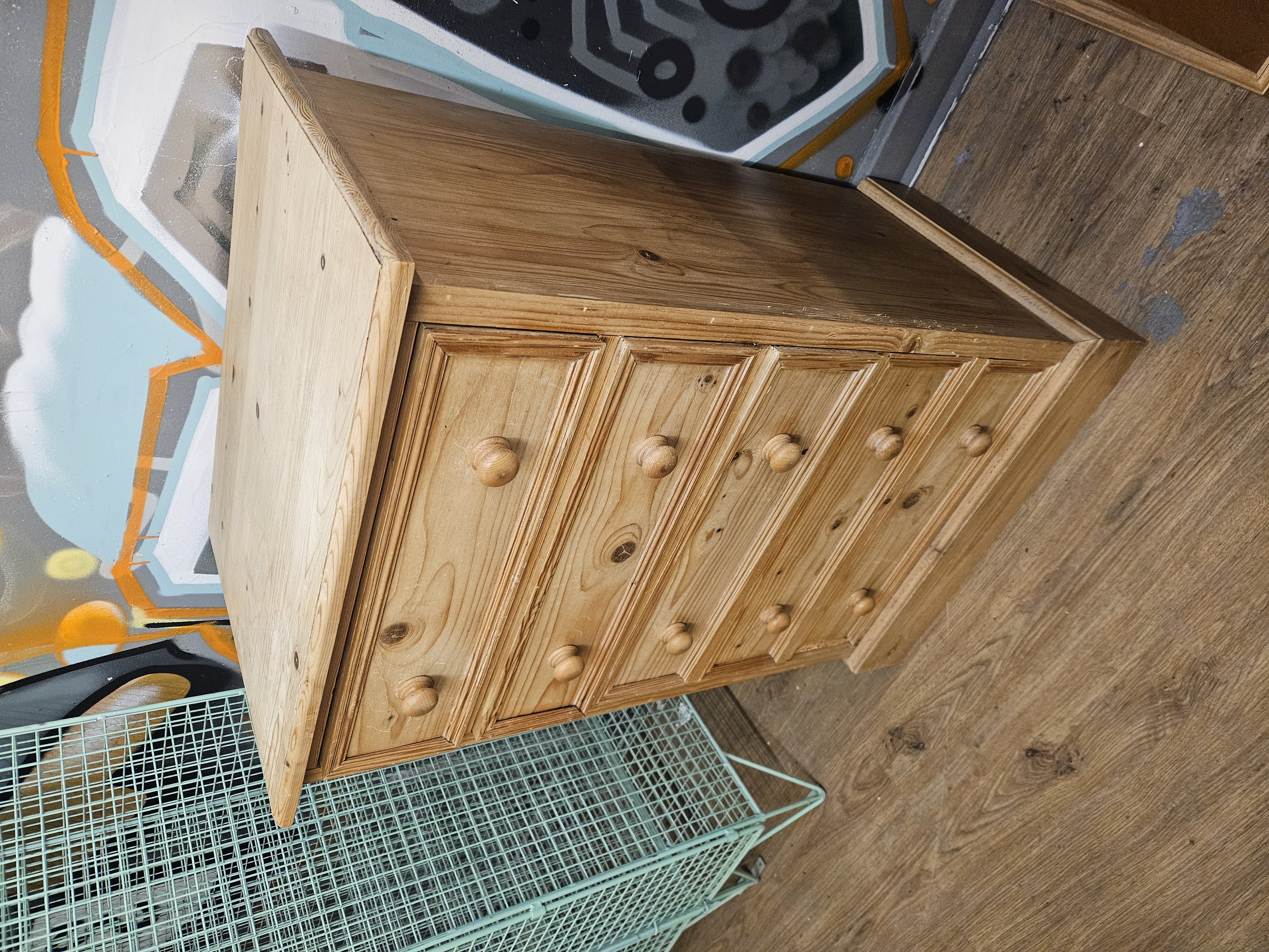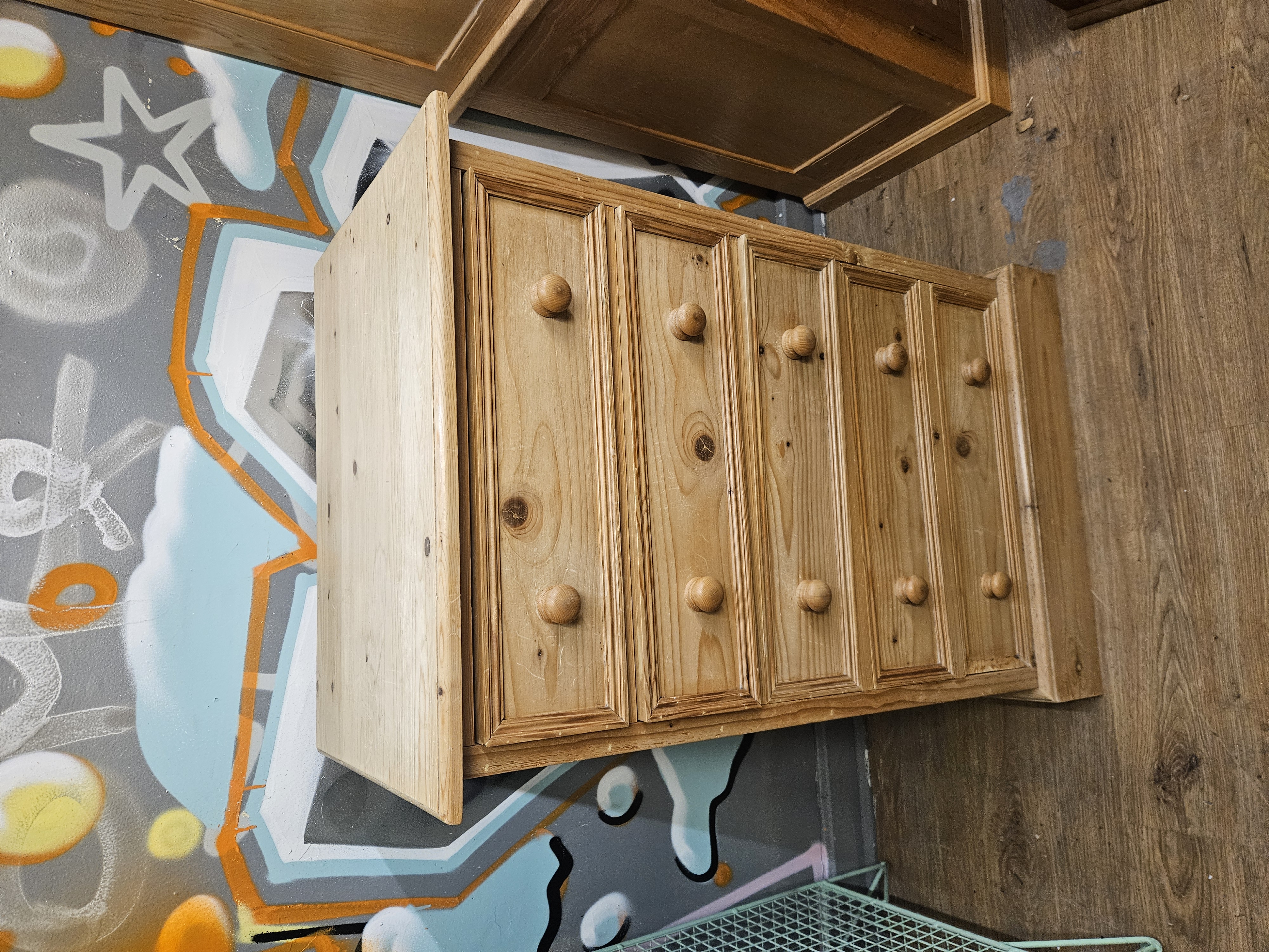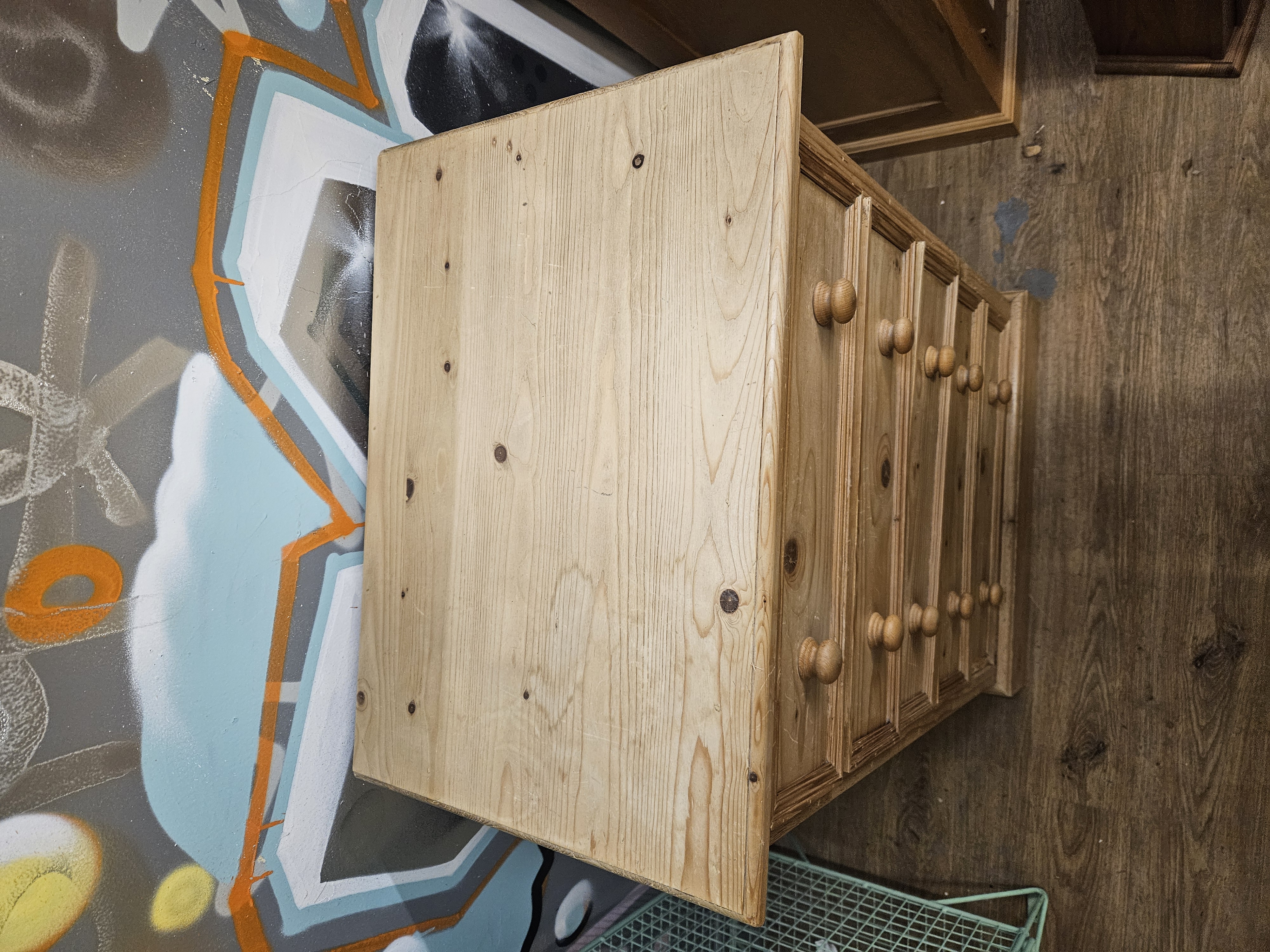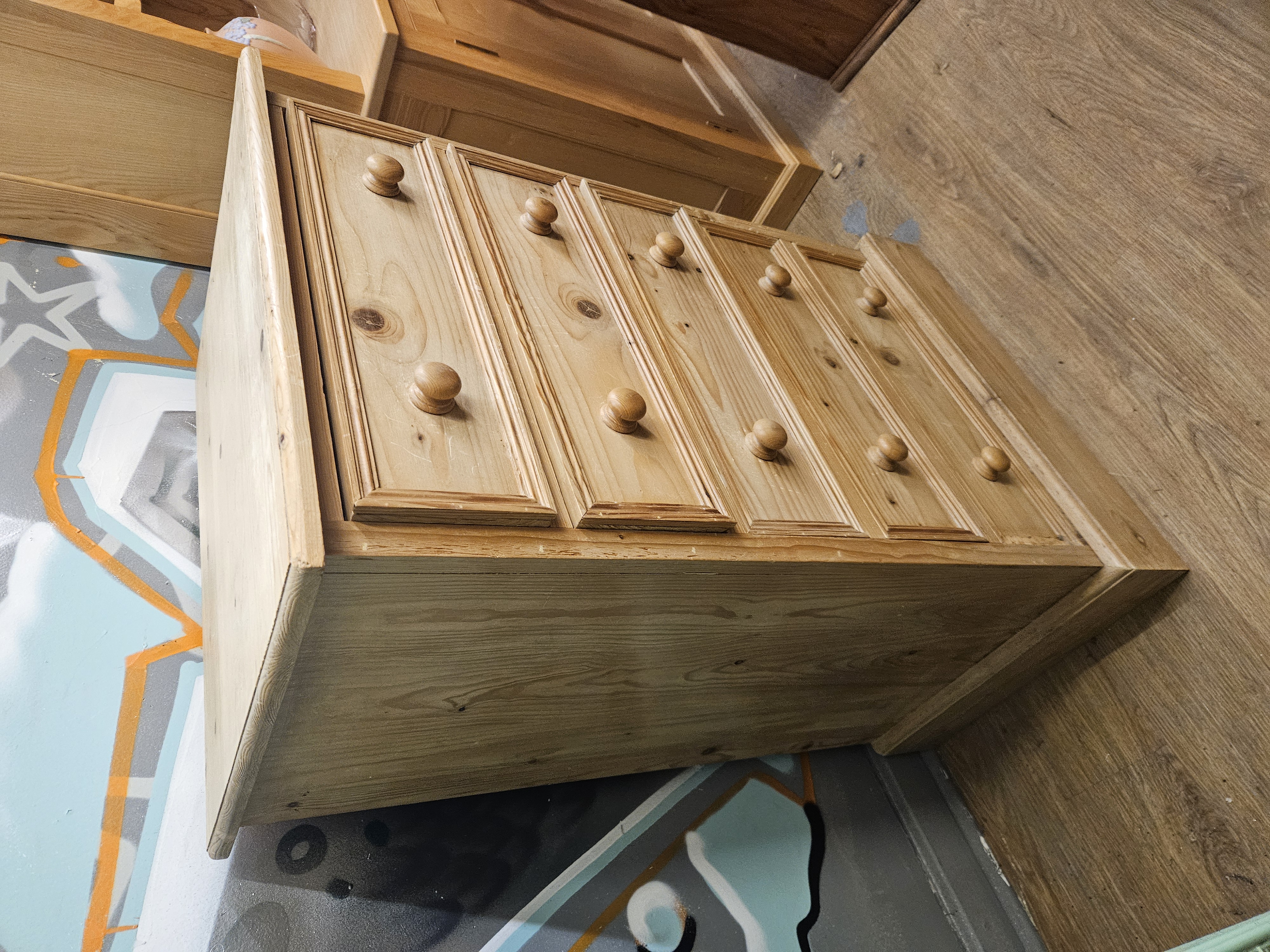 A pine chest of drawers in the Victorian country farmhouse style. The piece is constructed from knotted pine with a light waxed finish. It features a vertical arrangement of five drawers of graduated depth. Each drawer front is decorated with a simple moulded perimeter and fitted with a pair of turned wooden pine knobs. The chest is supported by a plain plinth base. No maker’s marks, labels, or stamps are visible on the exterior surfaces. Internal drawer construction, including joinery such as dovetails, and secondary woods are not visible in the provided images.
