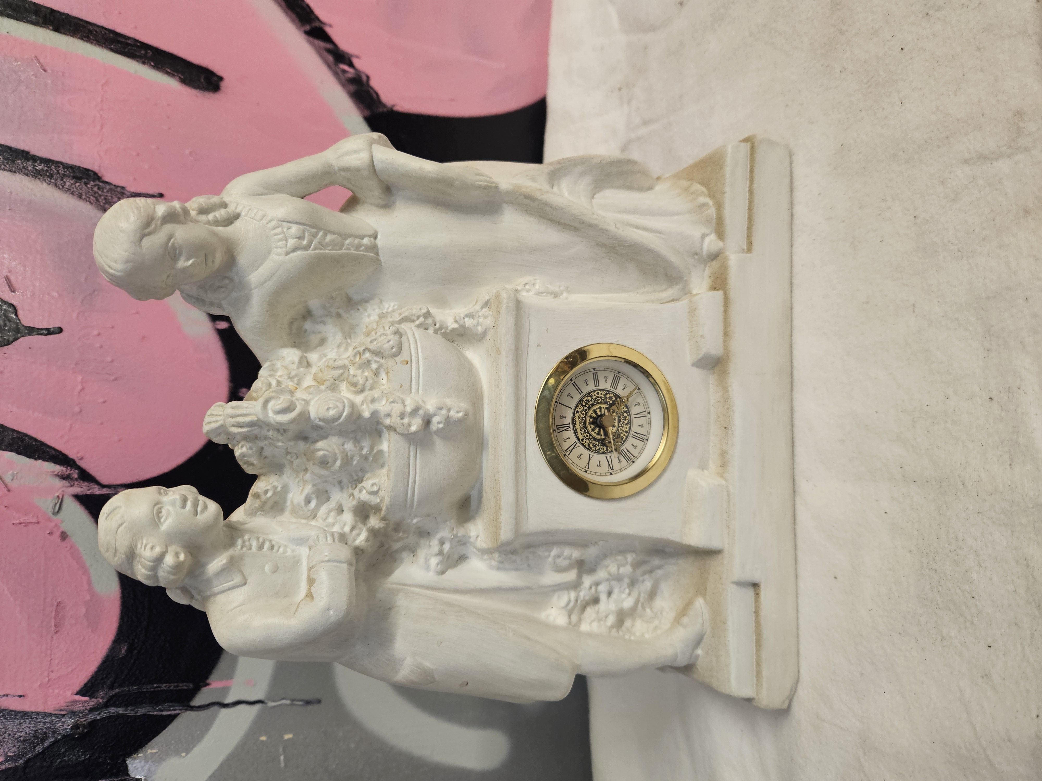 A figural mantel clock constructed from an off-white matte composite material, possibly resin or cast mineral-filled plastic. The case is designed in a Neo-classical revival style, featuring a sculptural group of a courting couple in 18th-century dress flanking a central plinth. A basket of flowers is positioned between the figures. The clock houses a small quartz insert movement with a polished gold-tone bezel. The white dial is printed with black Roman numerals and an ornate central decorative motif, with decorative gold-toned hands. No maker’s marks or signatures are present on the dial or body.