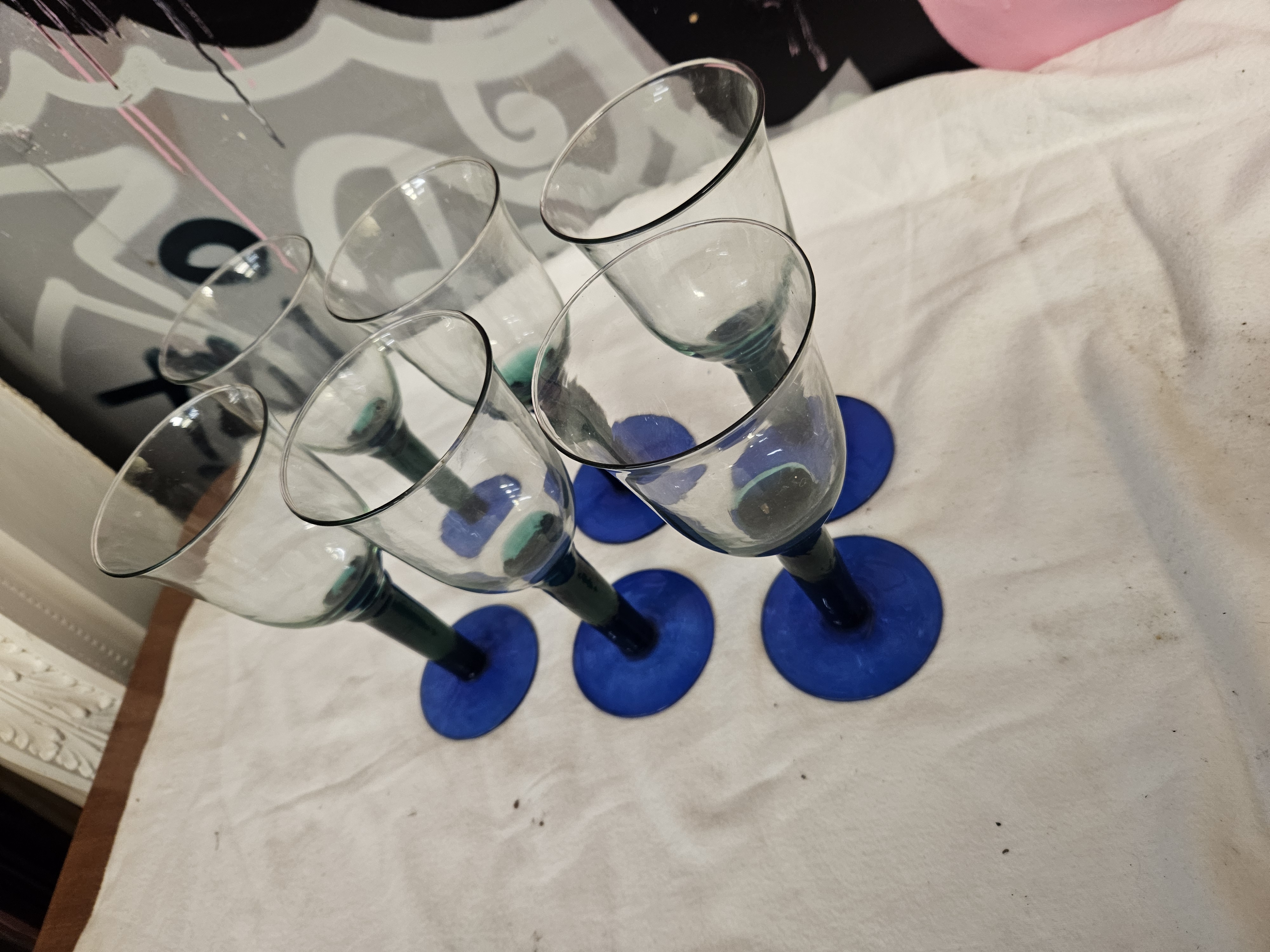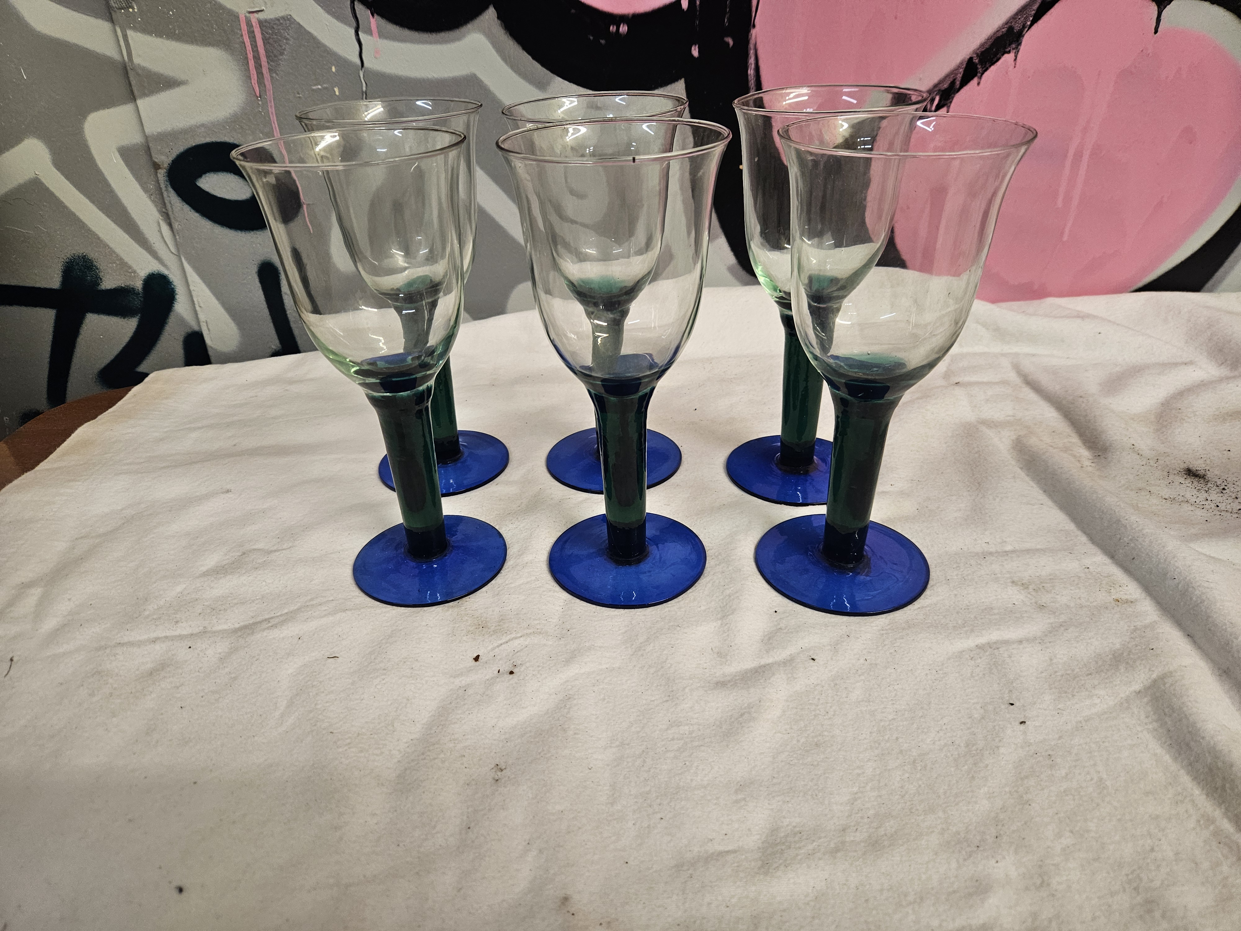A set of six contemporary hand-blown glass wine goblets. Each vessel features a clear tulip-shaped bowl with a slightly flared rim, supported by a thick, tapered stem in a dark teal-green glass. The stems terminate in vibrant cobalt blue circular feet. The handmade construction is evidenced by slight variations in the form and thickness of the glass across the set. This style of glassware is frequently associated with contemporary Mexican studio glass or Spanish manufacturers such as La Mediterranea.