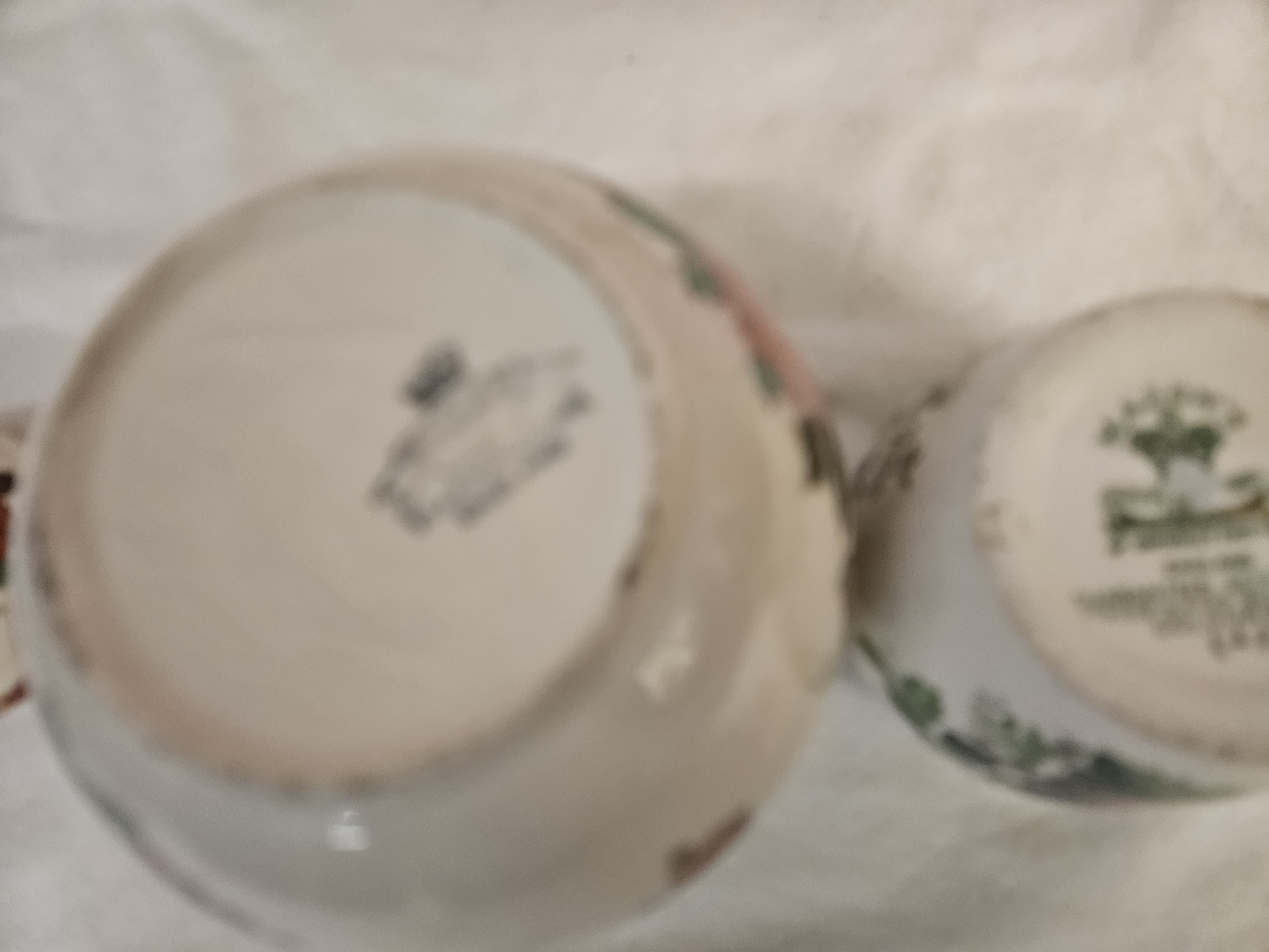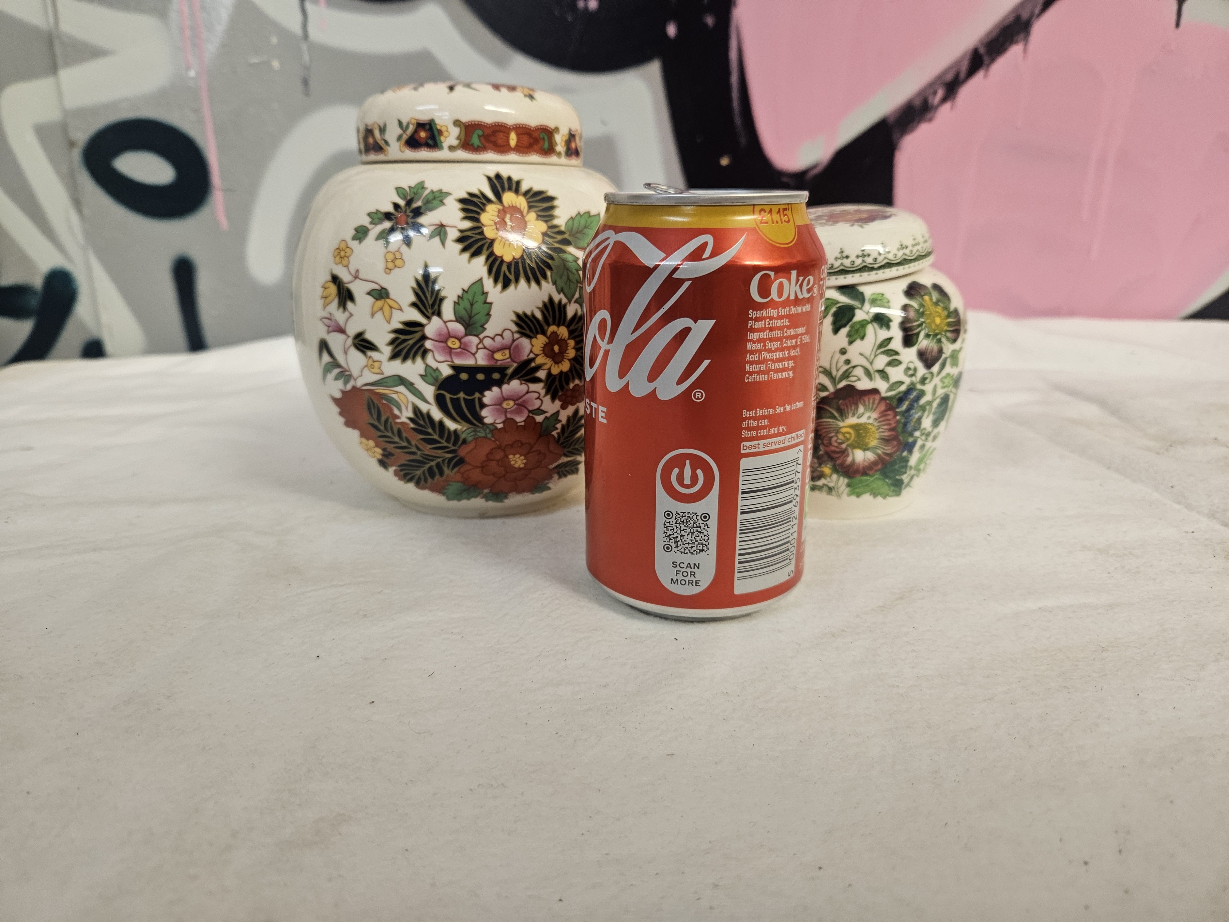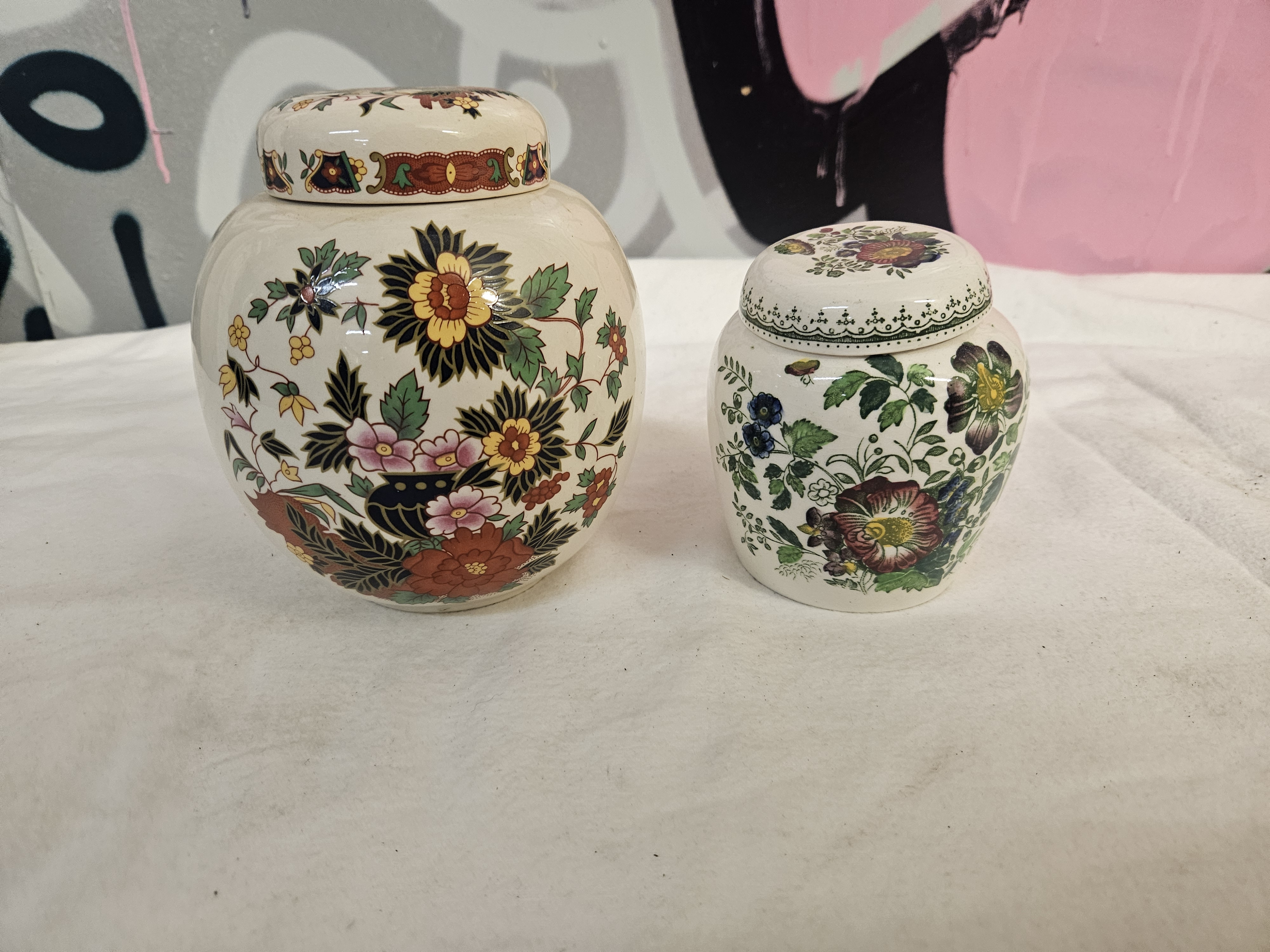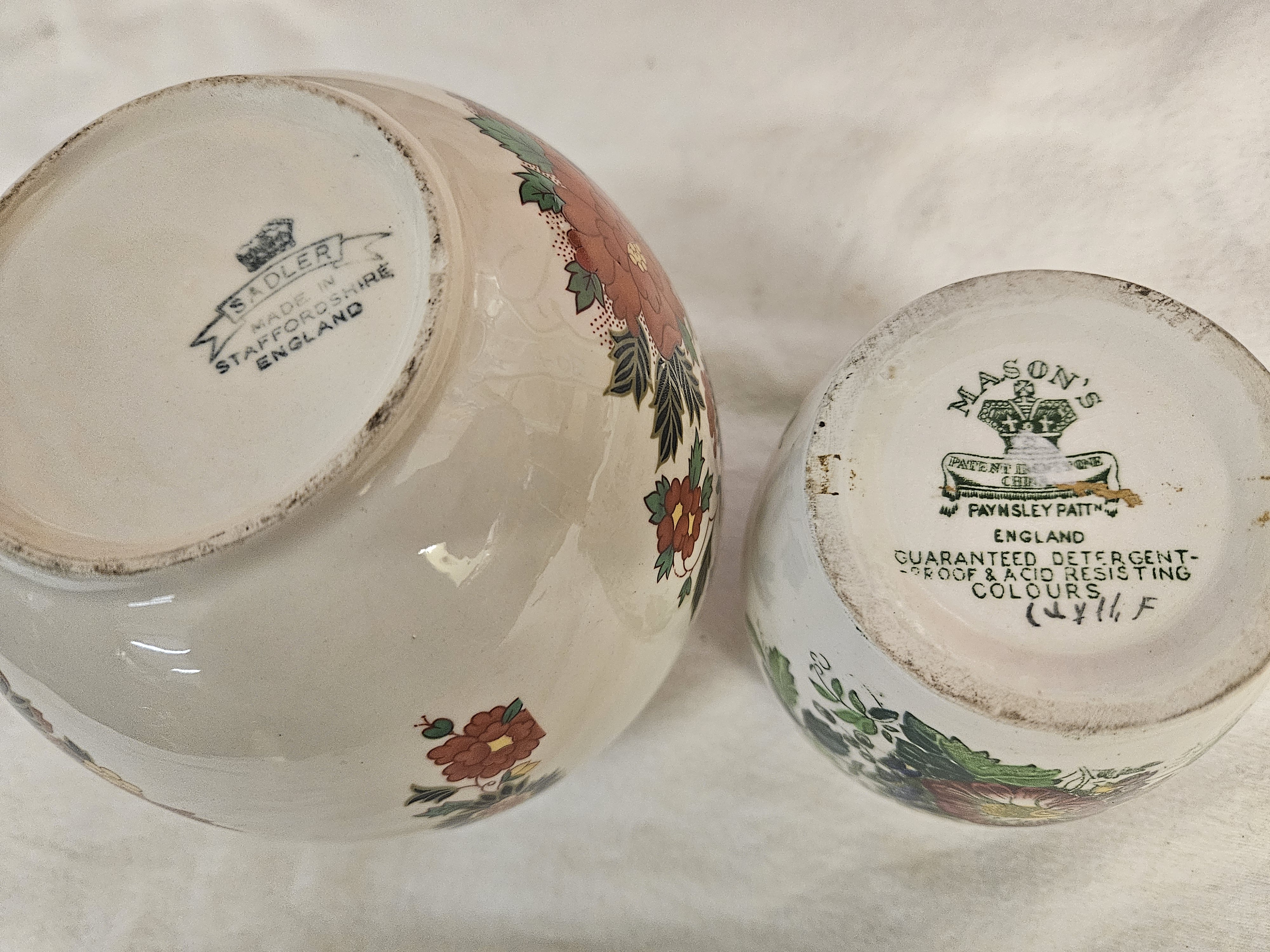 This lot consists of two English ceramic ginger jars with covers, produced in the Staffordshire pottery district. The larger jar is an earthenware vessel by Sadler, decorated with a transfer-printed and hand-enamelled floral pattern featuring stylised chrysanthemums and peonies in yellow, pink, and red tones on a cream ground. The domed cover displays a central floral motif and a geometric border. The base carries a blue printed mark with a crown and banner for Sadler, Staffordshire. The smaller jar is a Mason’s Patent Ironstone piece in the Paynsley pattern, featuring transfer-printed floral sprays on a white ground. The cover is decorated with a matching floral spray and a green lace-effect border. The base features a green printed Mason’s mark including the pattern name and detergent-proof guarantee, along with a hand-painted reference (CY11 F.