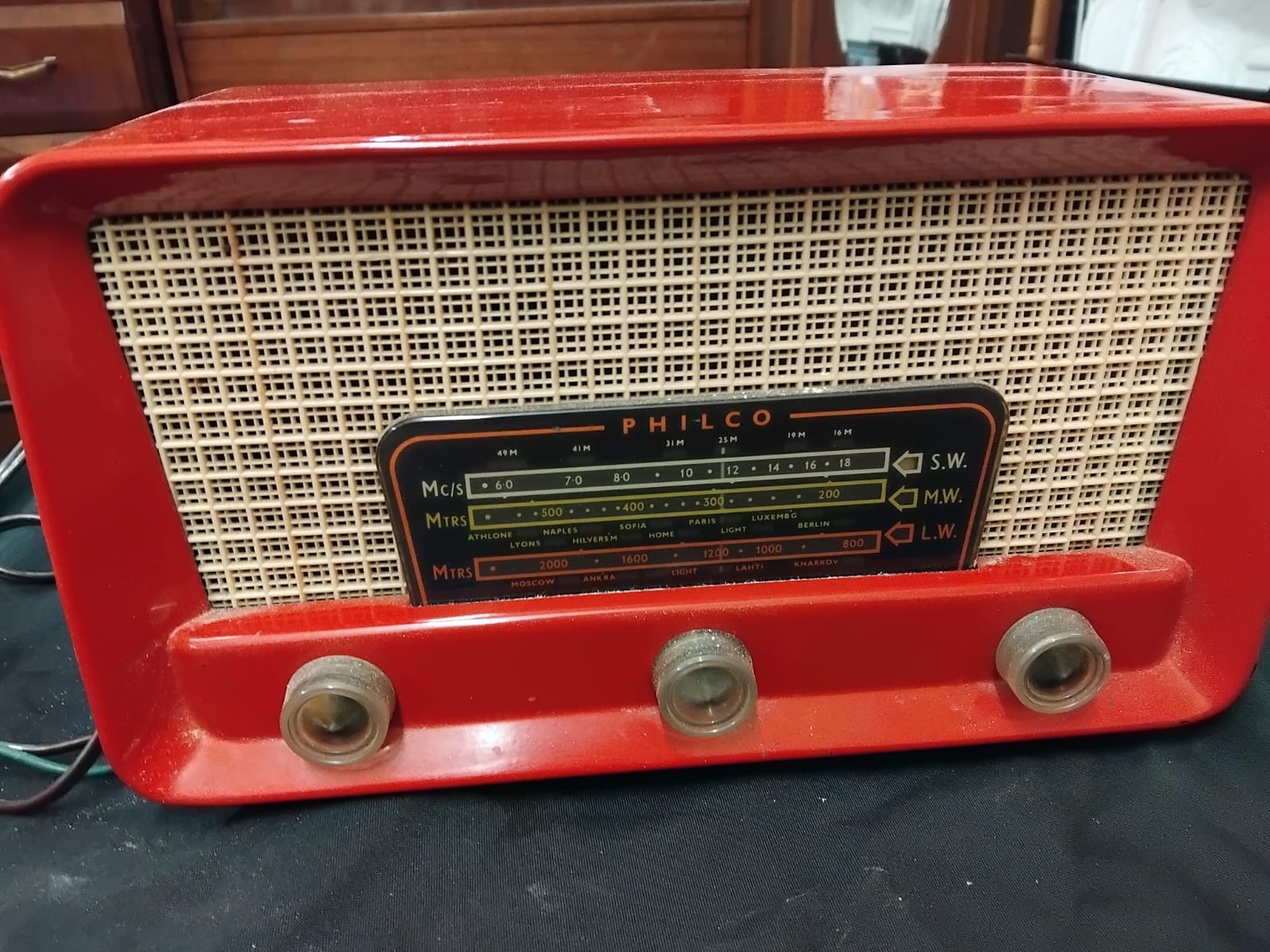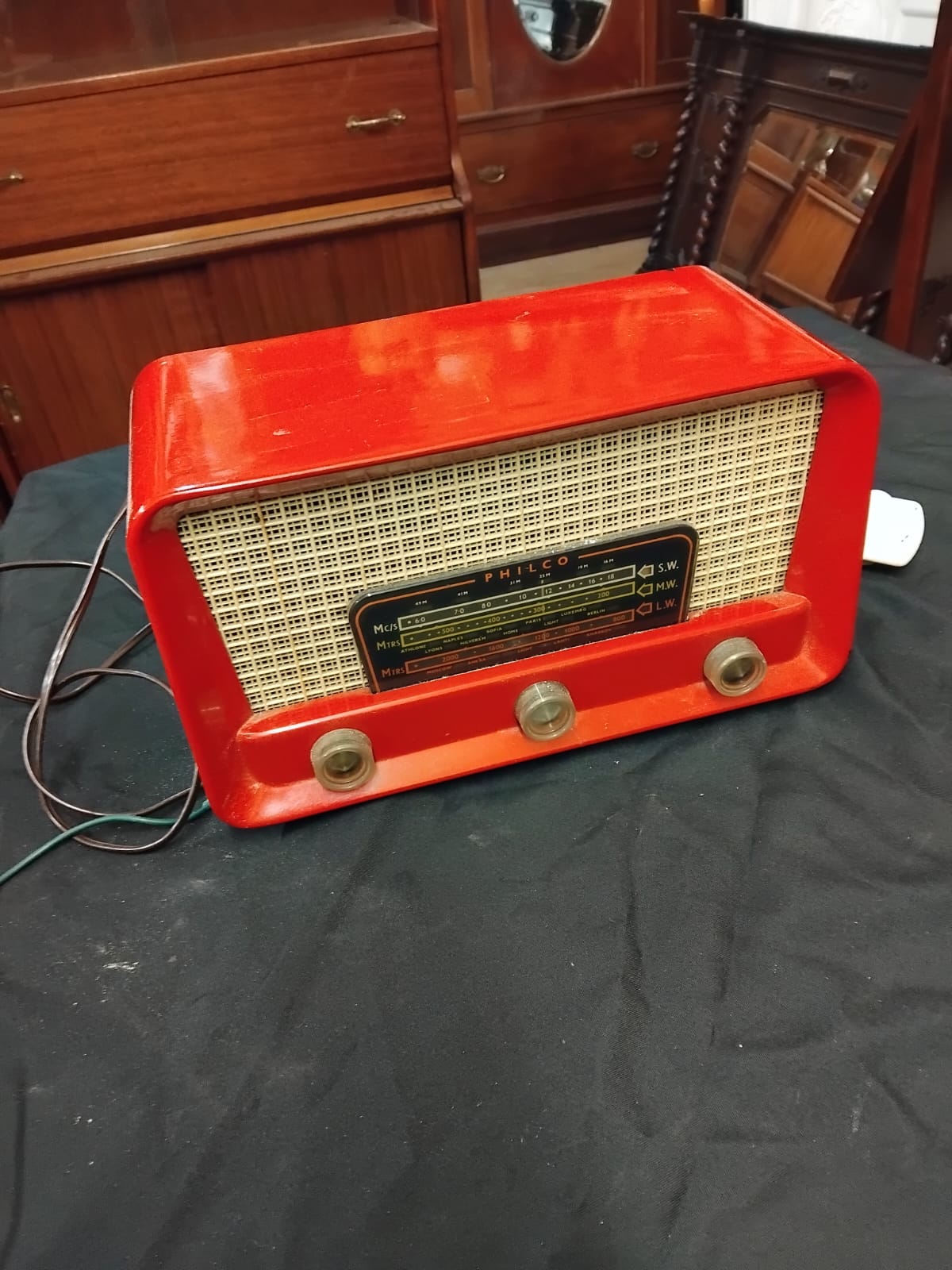 A Philco Red Plastic Tabletop Radio Receiver working