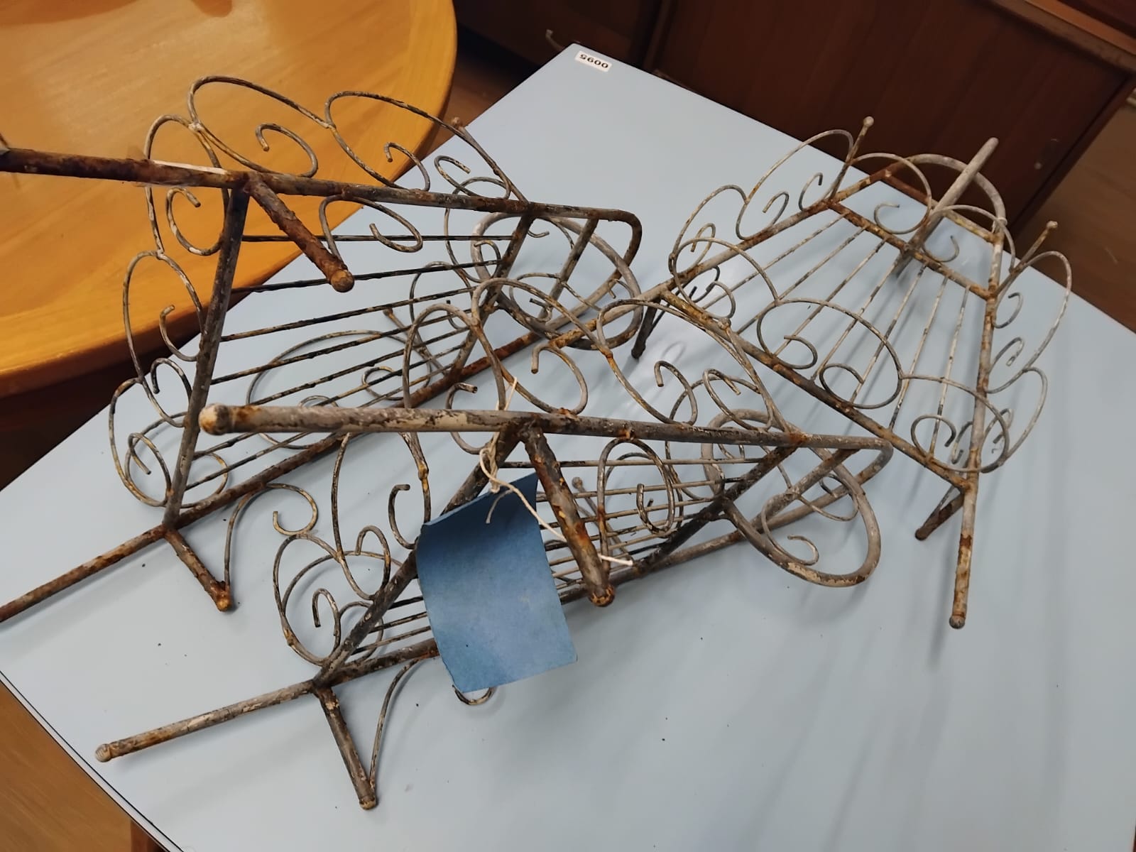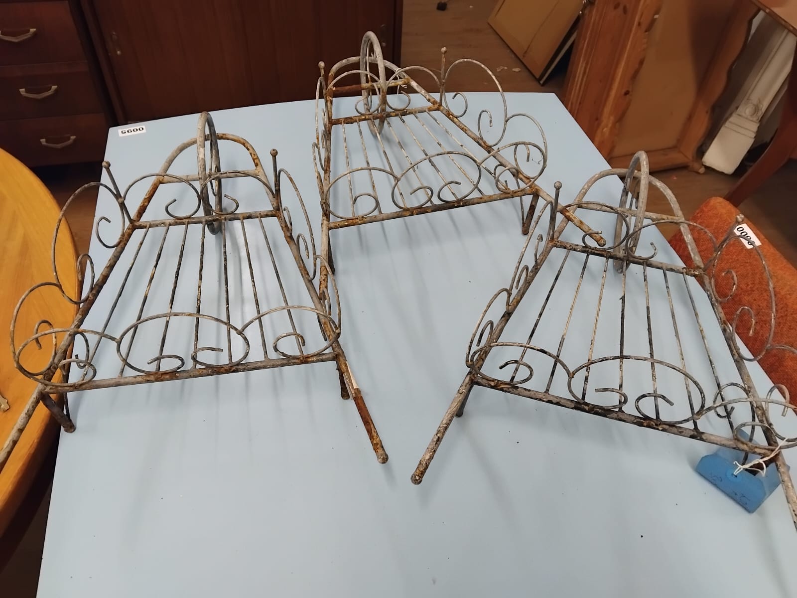 A trio of metal garden plant stands or shelves. Each stand is constructed from welded steel wire and features a wedge-shaped base with a slatted surface. The units are supported by three straight legs. The sides and back are decorated with scrolling wirework borders, with the rear section rising to a central arched crest. The items show remnants of a white painted finish. No maker marks or manufacturer identifications are present on the frames or legs.