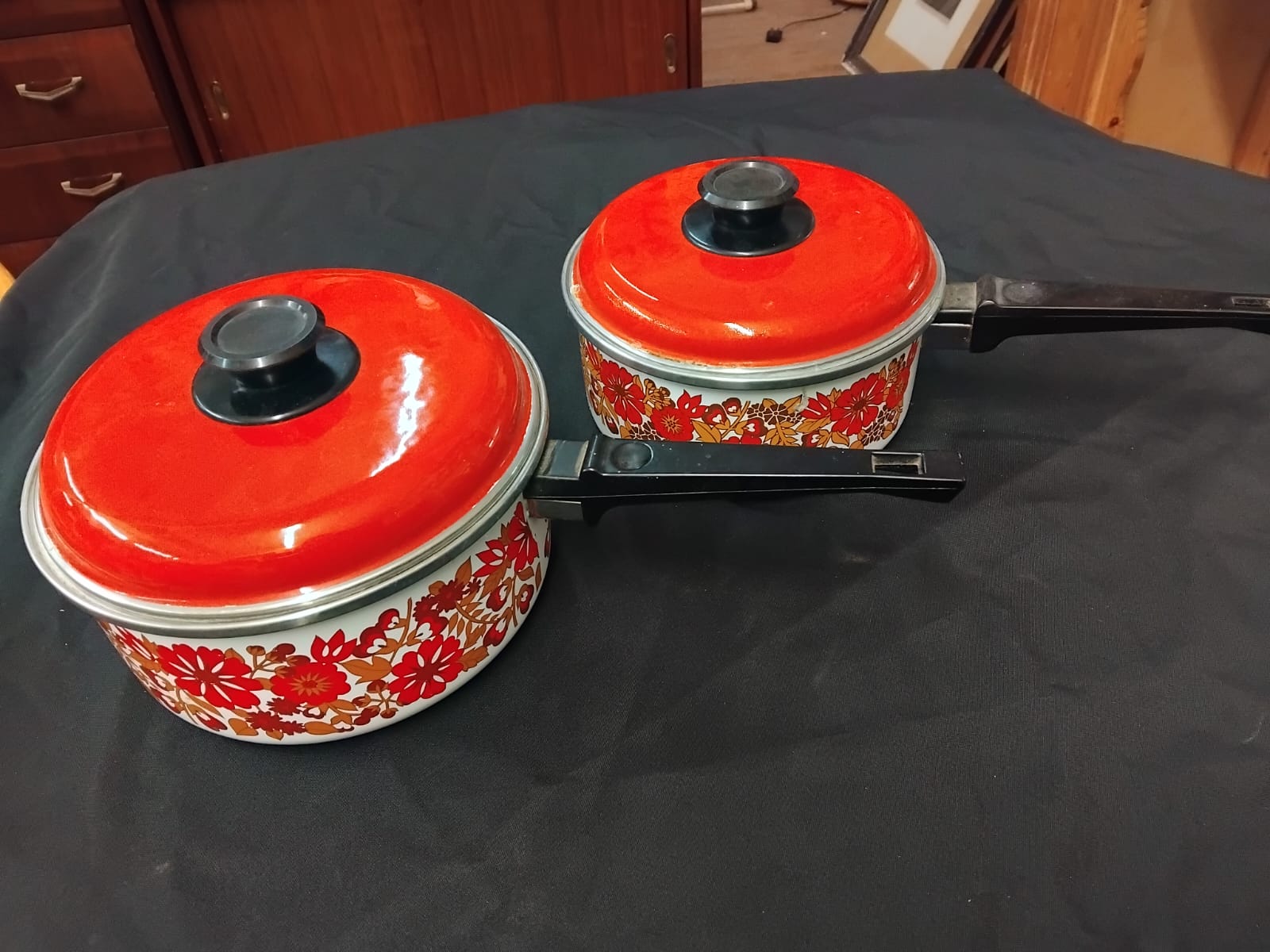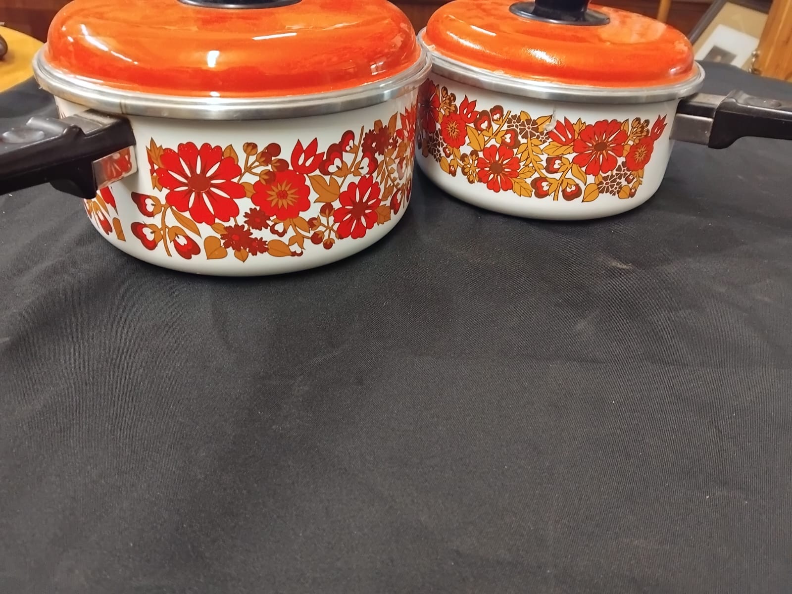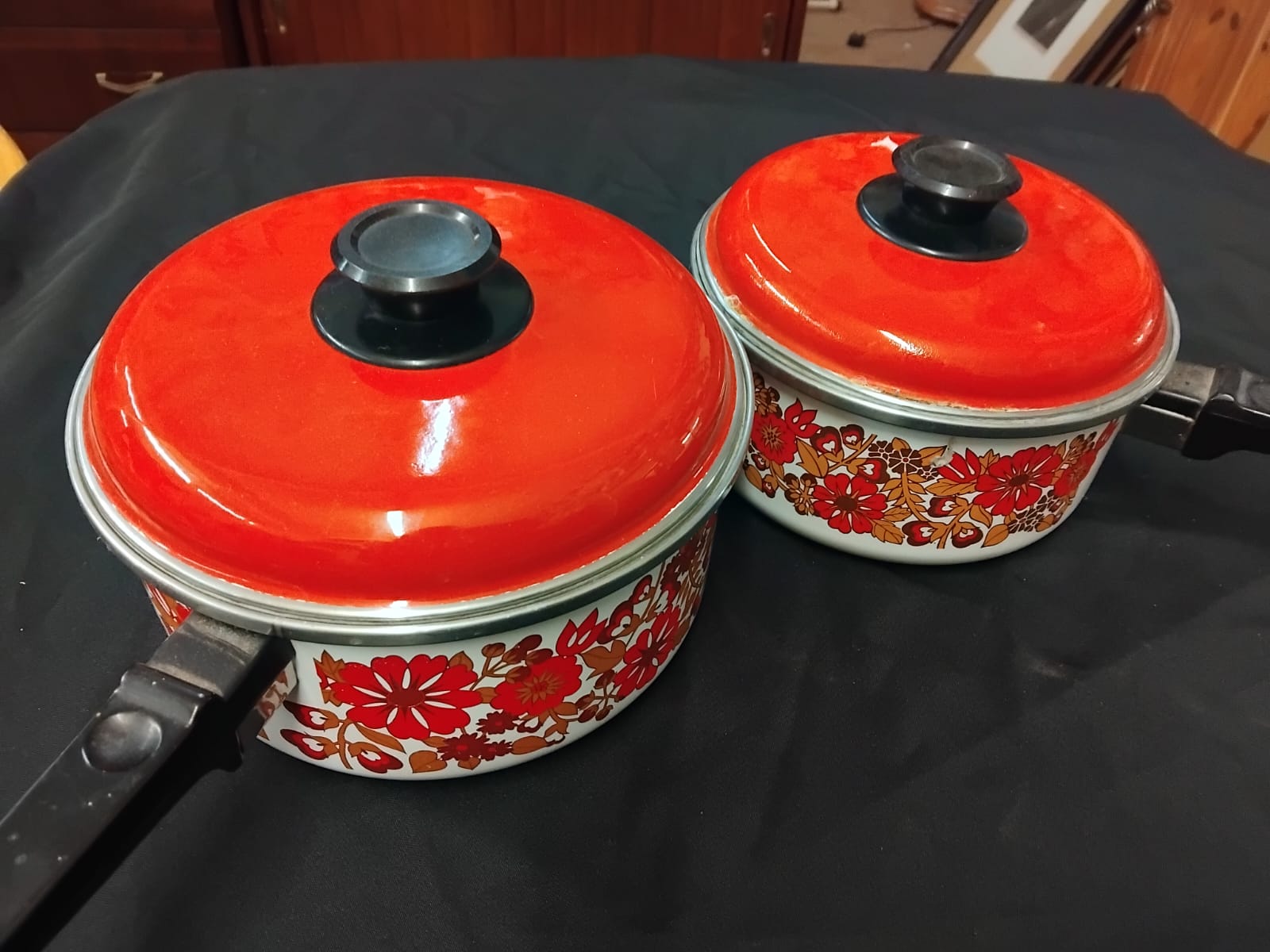 A pair of graduated lidded saucepans constructed from enamelled steel. The bodies are finished in white enamel decorated with a repeating 1970s stylised floral pattern in tones of red, orange, and brown. Each pan is accompanied by a matching orange-red enamelled lid featuring a black synthetic circular knob. The pans are equipped with fixed black heat-resistant synthetic handles. The design and colour palette are characteristic of mid-century modern kitchenware from the 1970s, frequently attributed to European manufacturers such as Austria Email. No maker marks are visible on the exterior or handles of the items.
