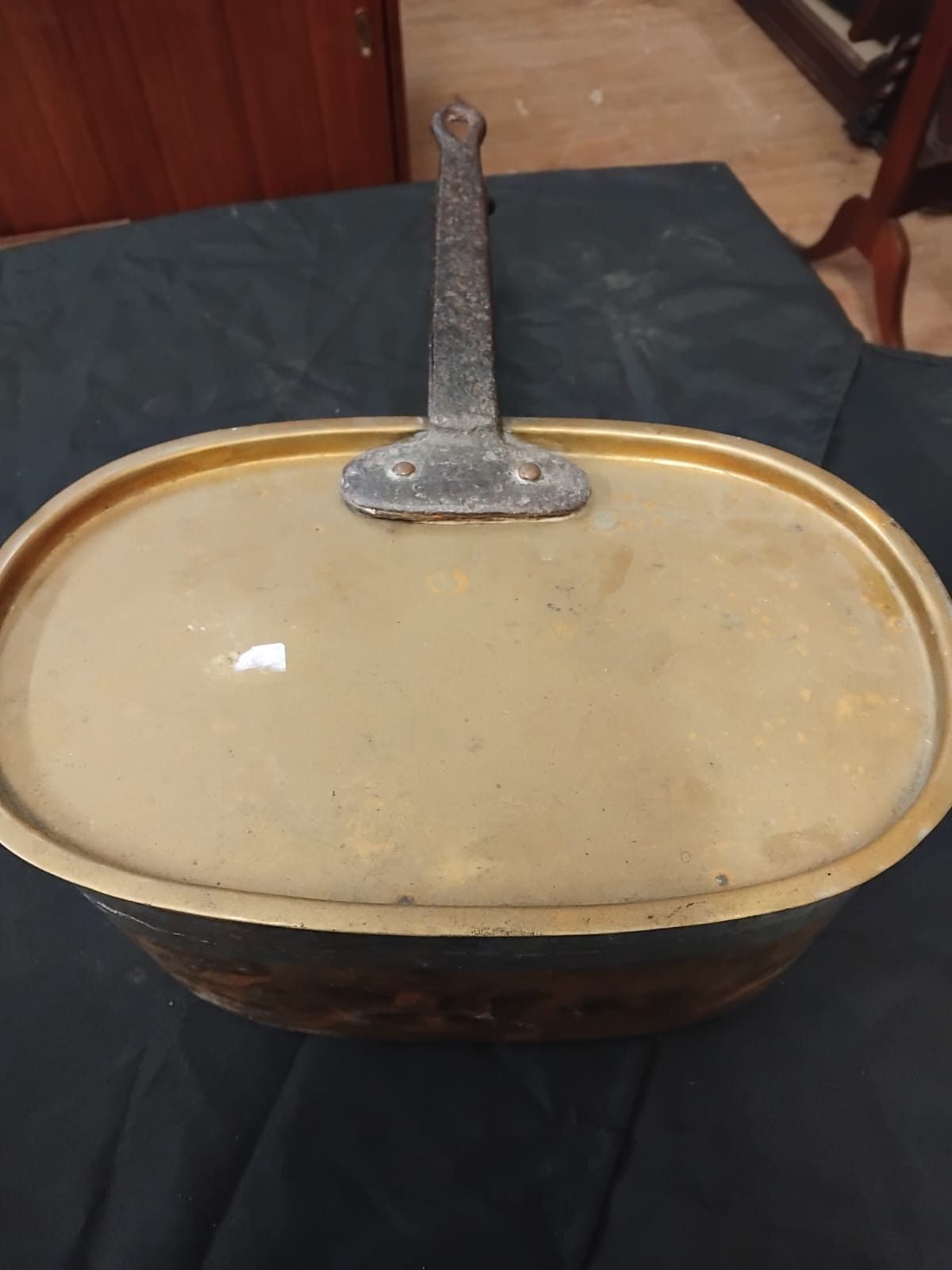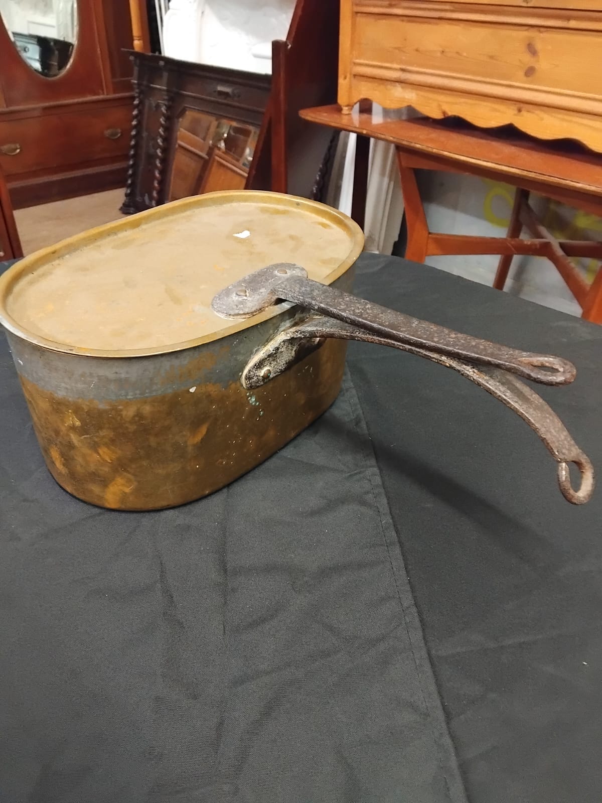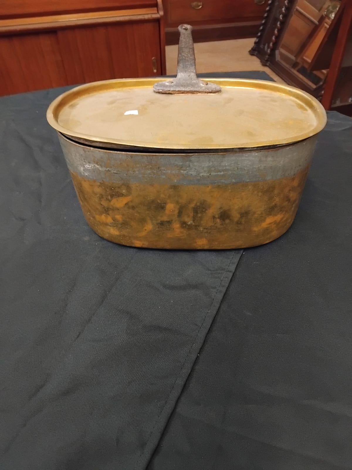 A 19th-century style D-shaped cooking pot with a fitted lid and integrated handle. The body and lid are constructed from sheet brass, featuring a tinned grey-tone metal band around the upper rim of the body for reinforcement. The long, split-fork handle is made of forged iron and is secured to the lid with two copper rivets. A corresponding iron bracket is riveted to the side of the body to facilitate the handle attachment. The utilitarian design is characteristic of British military or travel equipment from the Napoleonic or Victorian eras. No maker marks, stamps, or inscriptions are visible on the item.