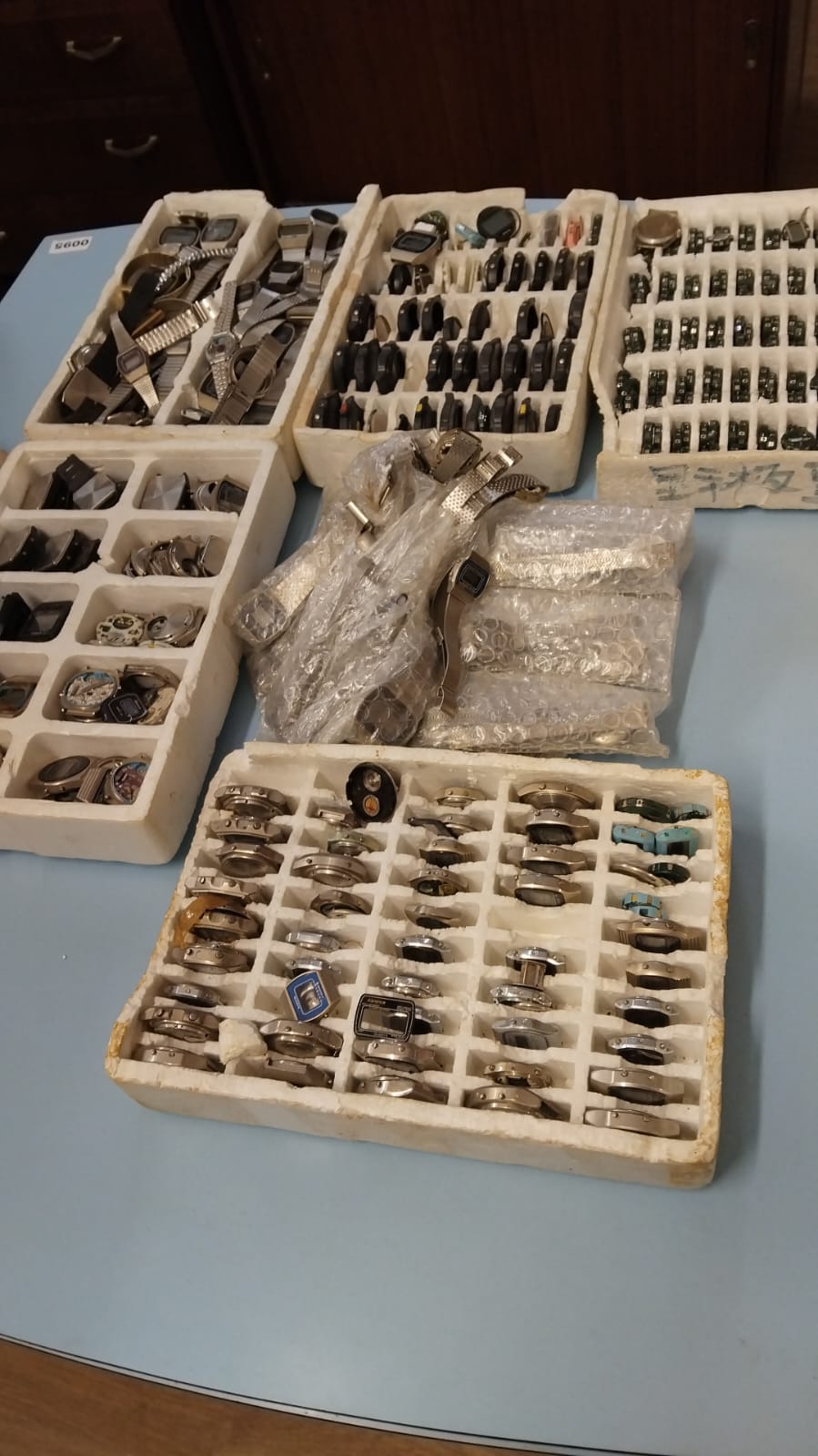 This lot comprises a substantial trade collection of vintage digital wristwatches, movements, and horological components, primarily dating from the late 20th century. The collection is organised across five polystyrene storage trays and several bubble-wrapped bundles. The assortment contains several hundred individual items, featuring a variety of digital watch heads, complete watches with metal bracelets, and internal LCD modules. Case materials include stainless steel, chrome-plated base metal, and black resin. The styles present are consistent with digital watch designs from the 1970s through the 1990s, including those produced by manufacturers such as Casio, Seiko, and Citizen, alongside various generic brands. One tray is marked with an inventory label numbered 5600, and another tray bears handwritten characters in an East Asian script. The collection includes a variety of black-cased resin watches, numerous silver-toned watch heads without straps, and disassembled internal modules.