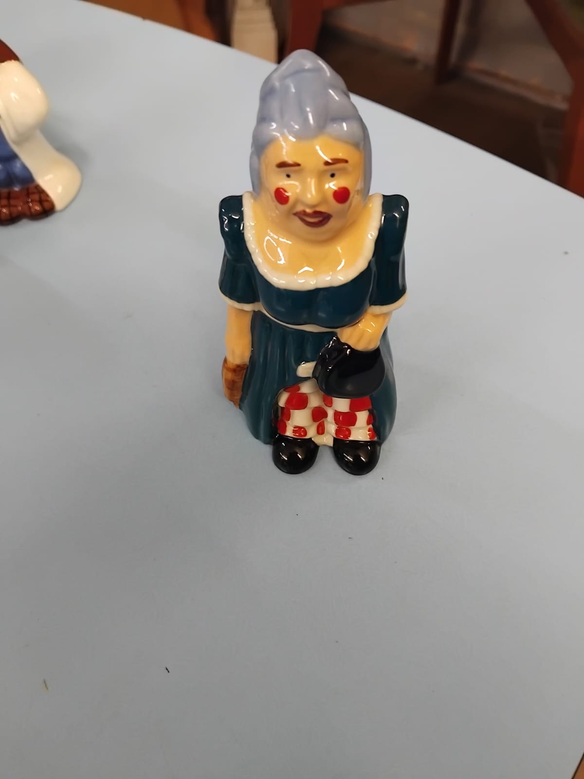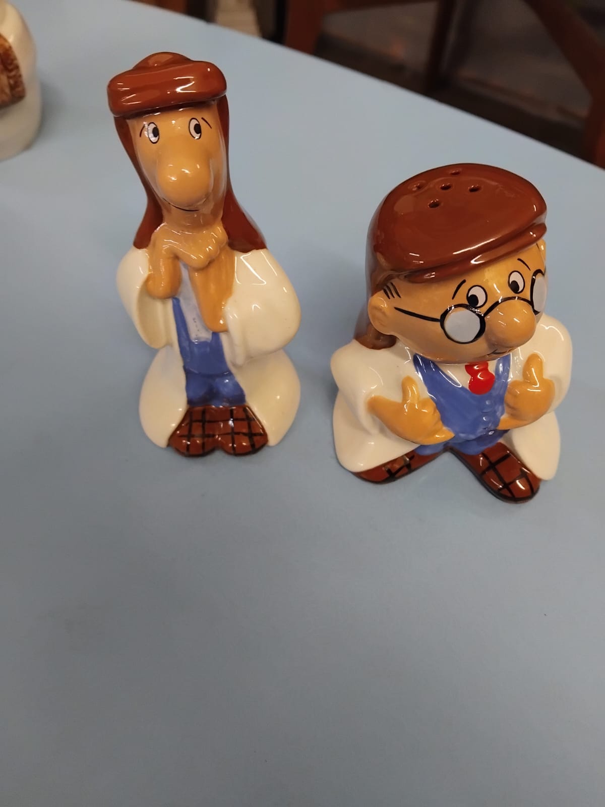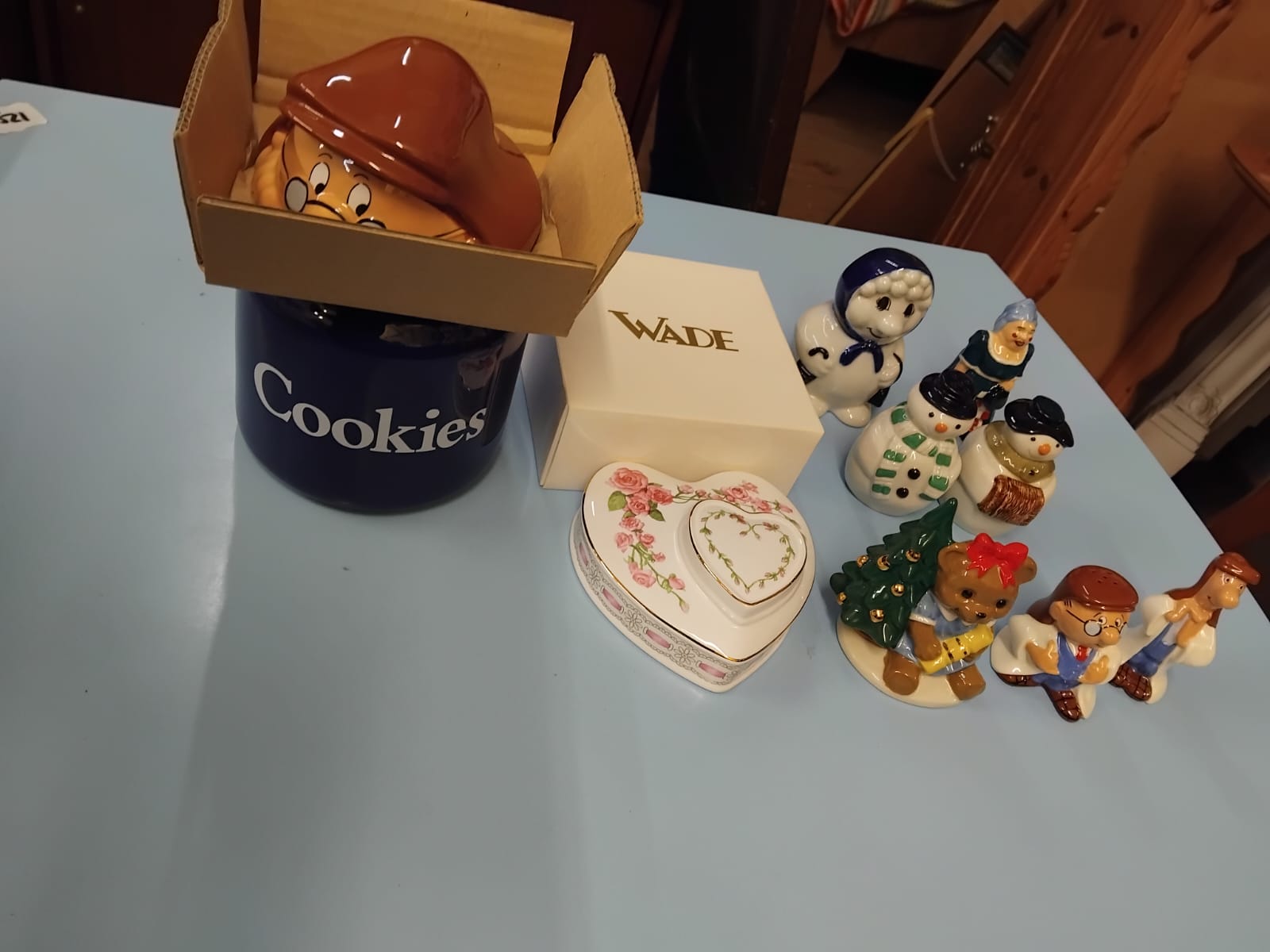 A collection of glazed ceramic items primarily produced by Wade Ceramics, Stoke-on-Trent. The lot features a large cylindrical cookie jar in cobalt blue with white lettering, topped with a lid modelled as the comic strip character Andy Capp wearing a brown flat cap and spectacles. Also included is a heart-shaped trinket box with a tiered lid, decorated with pink rose sprays and gilt rims, accompanied by its original cream-coloured presentation box marked WADE in gold lettering. The collection contains several figurines, notably a character modelled as Aunt Sally from the Worzel Gummidge series in a teal dress and chequered apron, and a smaller figure in a blue bonnet. Two pairs of salt and pepper shakers are present: one pair as snowmen with black top hats and scarves, and another pair as male characters in white laboratory coats and blue waistcoats. A decorative figurine depicts a seated teddy bear with a red bow next to a Christmas tree.