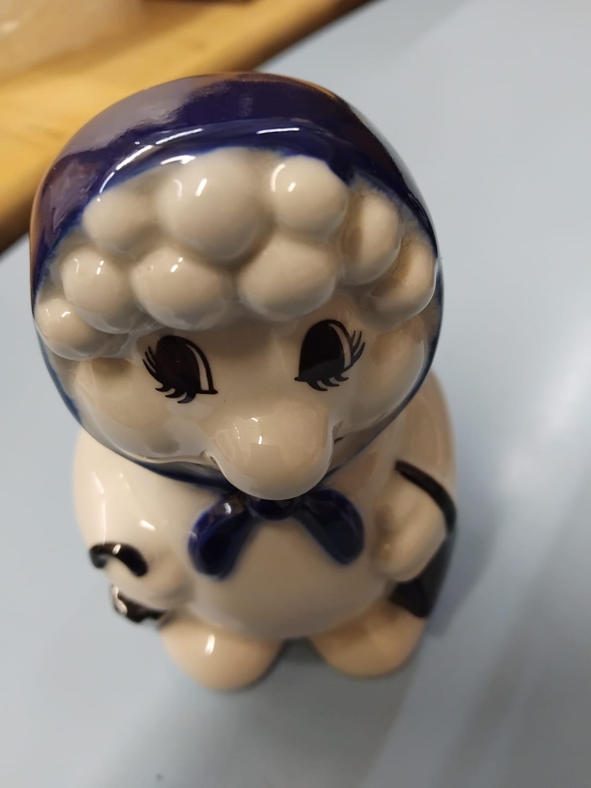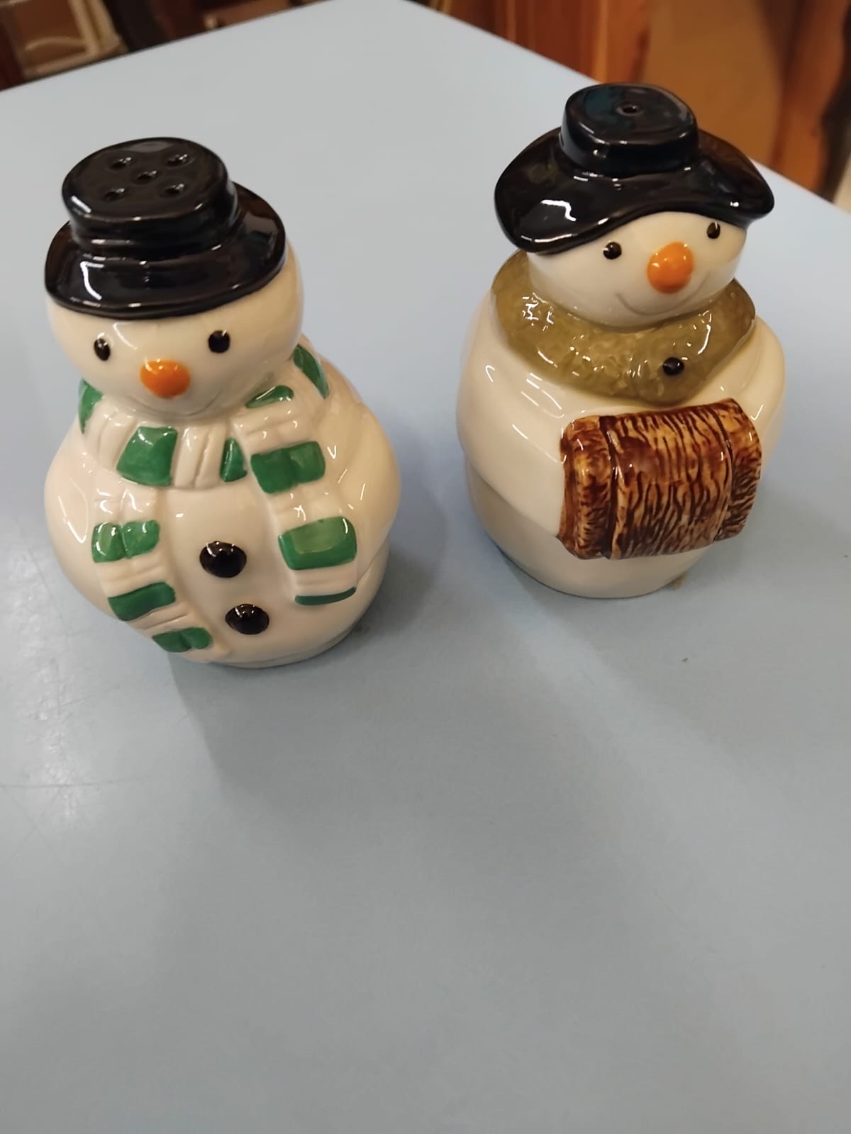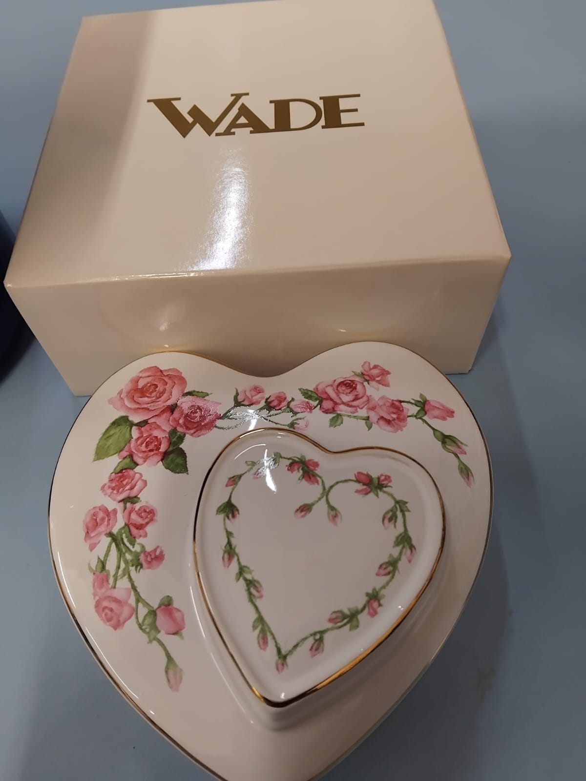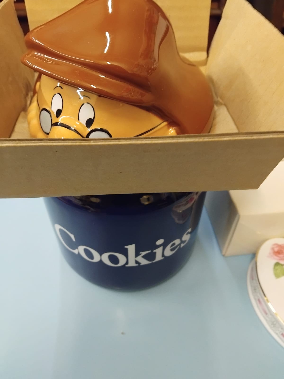 A collection of glazed ceramic items primarily produced by Wade Ceramics, Stoke-on-Trent. The lot features a large cylindrical cookie jar in cobalt blue with white lettering, topped with a lid modelled as the comic strip character Andy Capp wearing a brown flat cap and spectacles. Also included is a heart-shaped trinket box with a tiered lid, decorated with pink rose sprays and gilt rims, accompanied by its original cream-coloured presentation box marked WADE in gold lettering. The collection contains several figurines, notably a character modelled as Aunt Sally from the Worzel Gummidge series in a teal dress and chequered apron, and a smaller figure in a blue bonnet. Two pairs of salt and pepper shakers are present: one pair as snowmen with black top hats and scarves, and another pair as male characters in white laboratory coats and blue waistcoats. A decorative figurine depicts a seated teddy bear with a red bow next to a Christmas tree.
