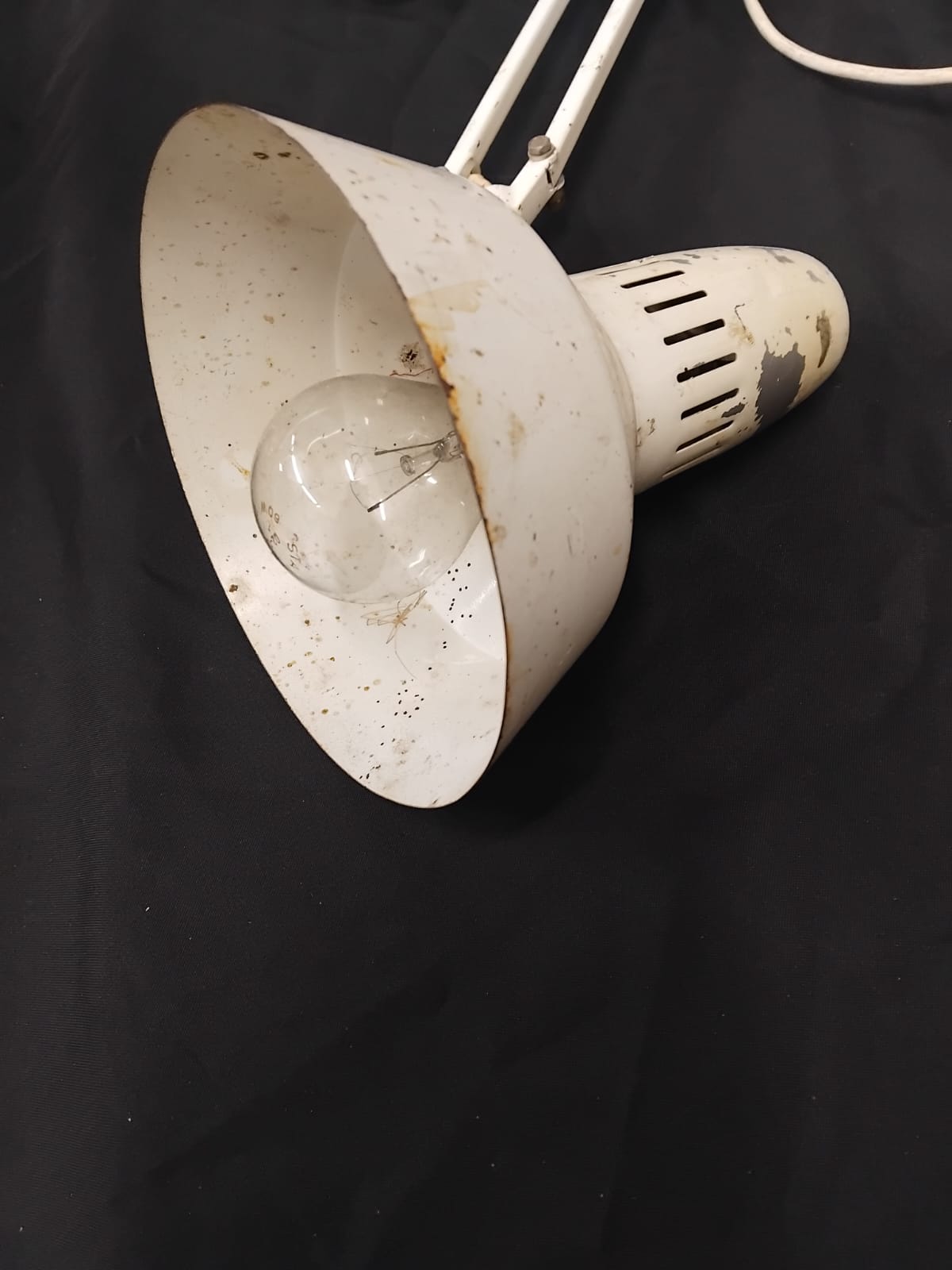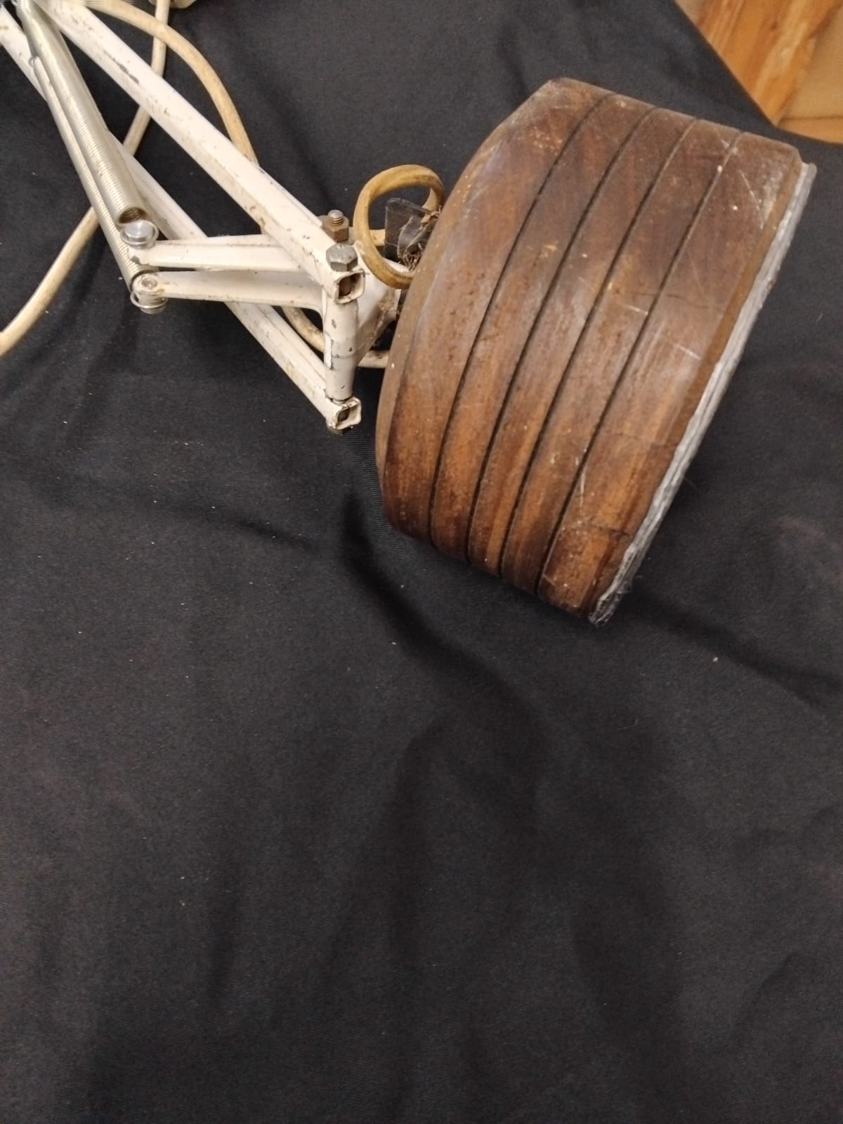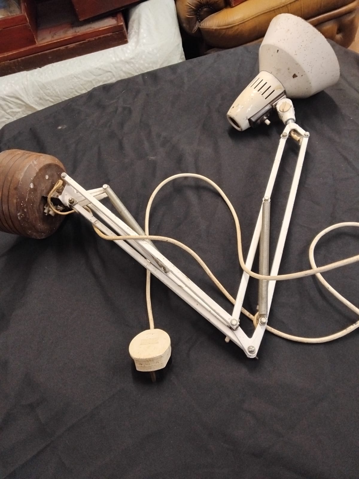 A mid-20th century industrial style spring-balanced articulated desk lamp. The lamp features a white-painted conical metal shade with integrated linear cooling vents and a black toggle power switch. It is constructed with a twin-arm articulated frame supported by four exposed steel tension springs, allowing for multi-directional positioning. The unit is currently mounted to a non-standard, tiered circular wooden base with a dark stained finish, which appears to be a later adaptation. The lamp is fitted with a white plastic-coated flex and a standard UK three-pin plug. No manufacturer marks are present on the frame or shade.