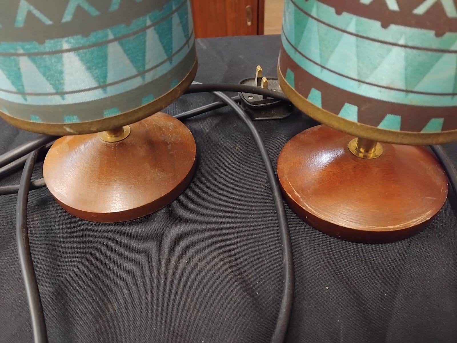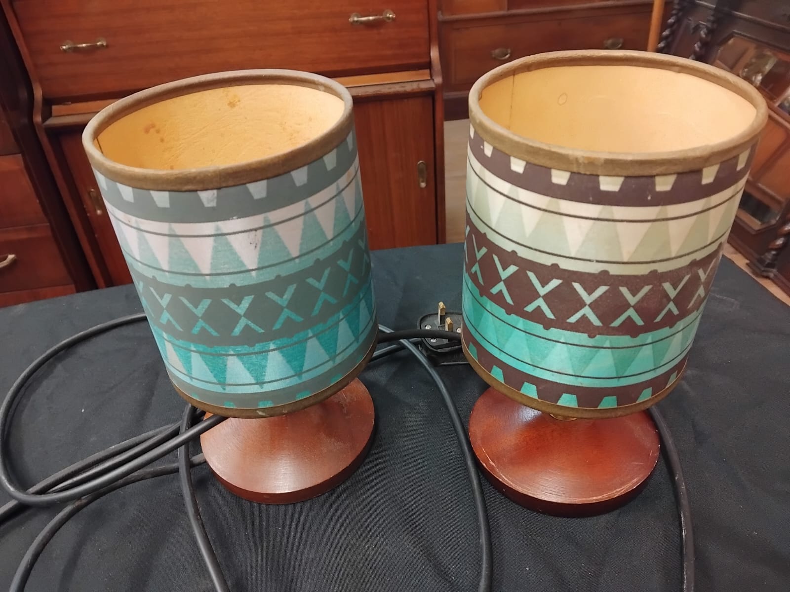 A pair of mid-century modern table lamps featuring turned wooden bases with a teak-effect stain. Each lamp is constructed with a circular tapered wooden base and a brass-finished metal support. The cylindrical shades feature a repeating geometric pattern of triangles and crosses in shades of teal, blue, brown, and white, finished with a dark-toned binding to the top and bottom rims. The lamps are wired with modern black plastic-coated flex and fitted with standard UK three-pin plugs. No maker’s marks or signatures are visible on the bases or bodies of the items.
