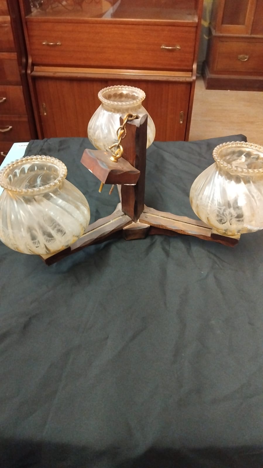 A three-branch ceiling light fixture featuring a central dark wood column with three square-profile radiating arms. Each arm supports a globular glass shade with swirled ribbing and a ruffled rim. The glass shades have an iridescent, frosted finish and are decorated with etched floral patterns. The fixture is accompanied by a brass-toned metal hanging chain and a corresponding wooden ceiling rose. The original wiring is visible along the top of the arms.