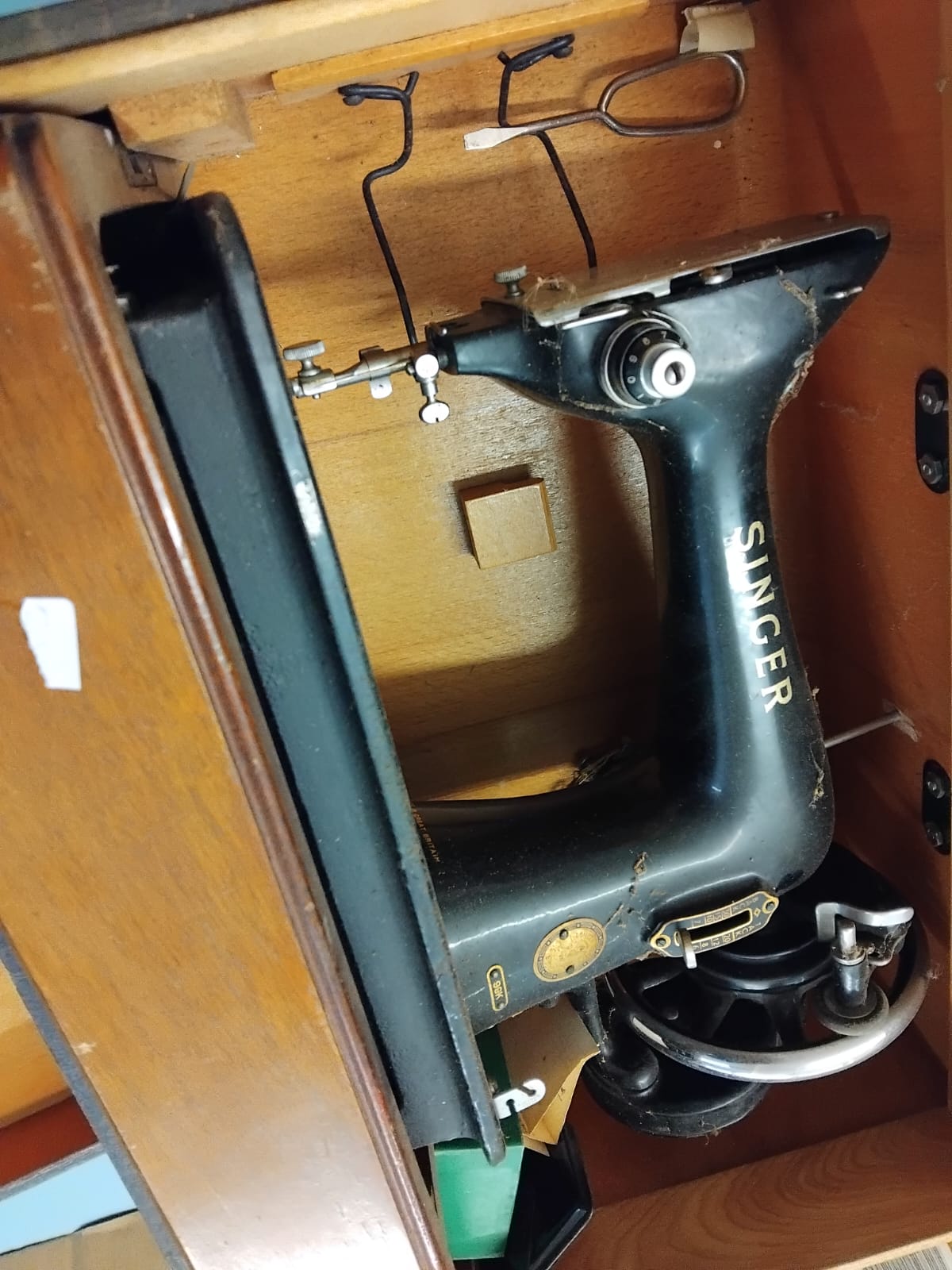 A vintage Singer 99K sewing machine featuring a black-lacquered cast metal body. The machine is marked with the brand name SINGER in white lettering on the arm and includes a small brass-toned plate on the base identifying the model as 99K. The base edge is inscribed with GREAT BRITAIN. A circular brass badge is affixed to the pillar. The machine is equipped with a stitch length adjustment plate displaying numerical increments from 6 to 30 and the text BACK TACK. The unit is housed within a wooden cabinet and is mounted on hinges allowing it to tilt back for access to the underside.
