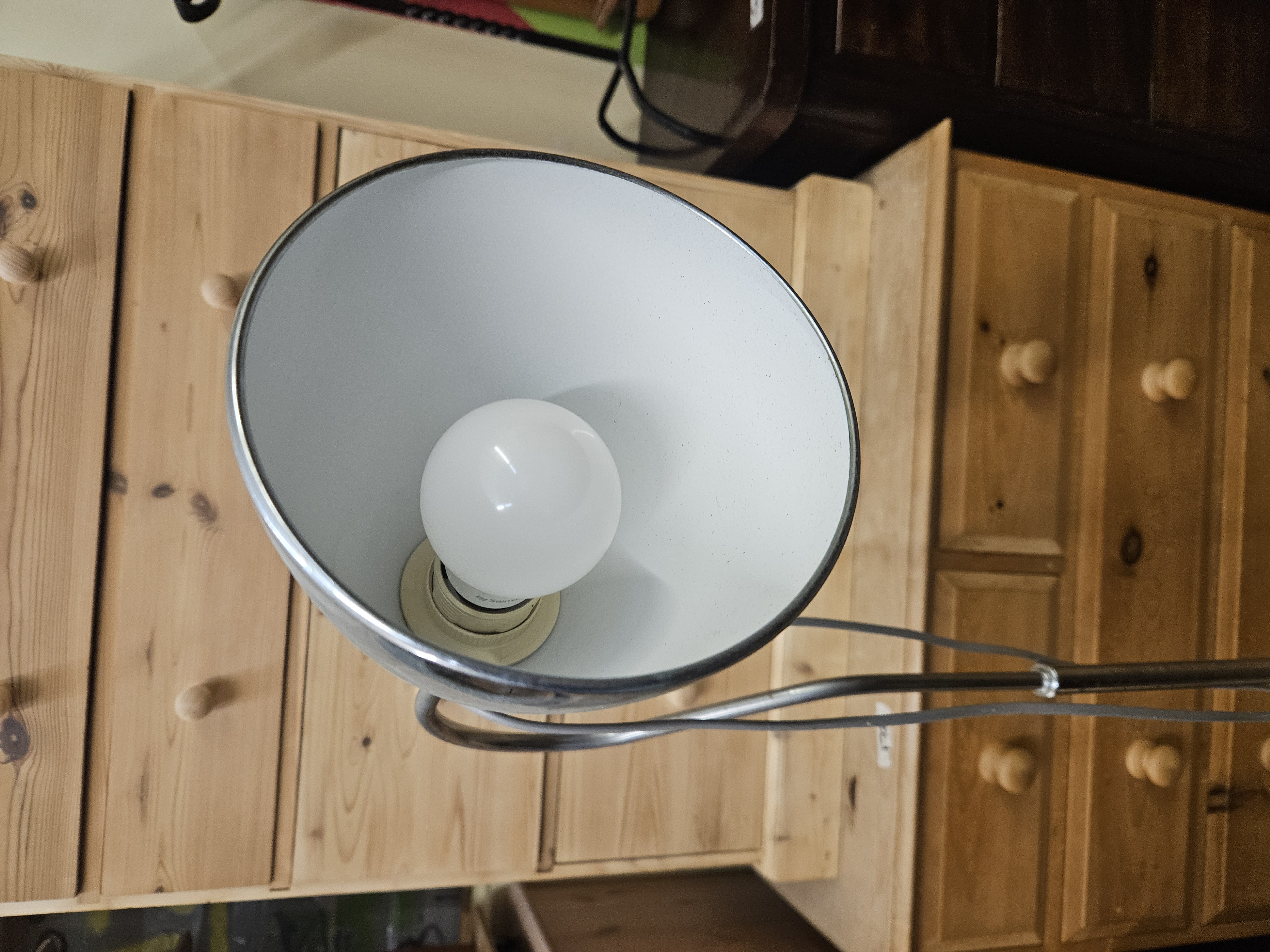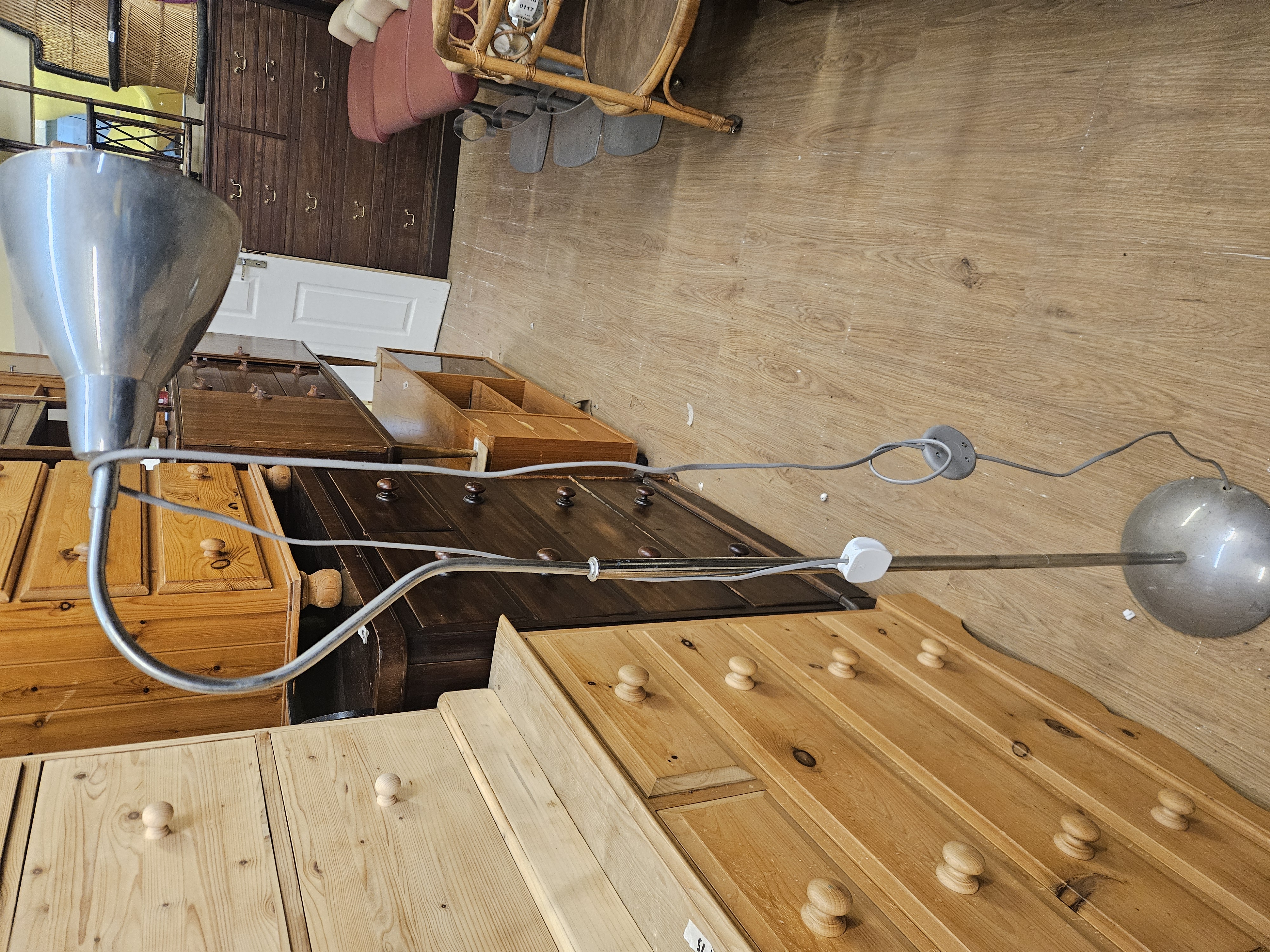 A modernist style adjustable floor lamp dating from the mid-to-late 20th century. The lamp is constructed with a chrome-plated tubular steel stem and a curved upper arm. It features a conical metal spotlight-style shade and a circular weighted base, both with a brushed metal finish, likely aluminium or steel. The interior of the shade is finished in white reflective enamel. The shade is adjustable via a swivel joint at the terminal of the curved arm. The fixture is fitted with a grey flexible power cord, a white plastic inline rocker switch, and a grey UK three-pin plug. No maker’s marks, labels, or stamps are visible on the base, stem, or shade.
