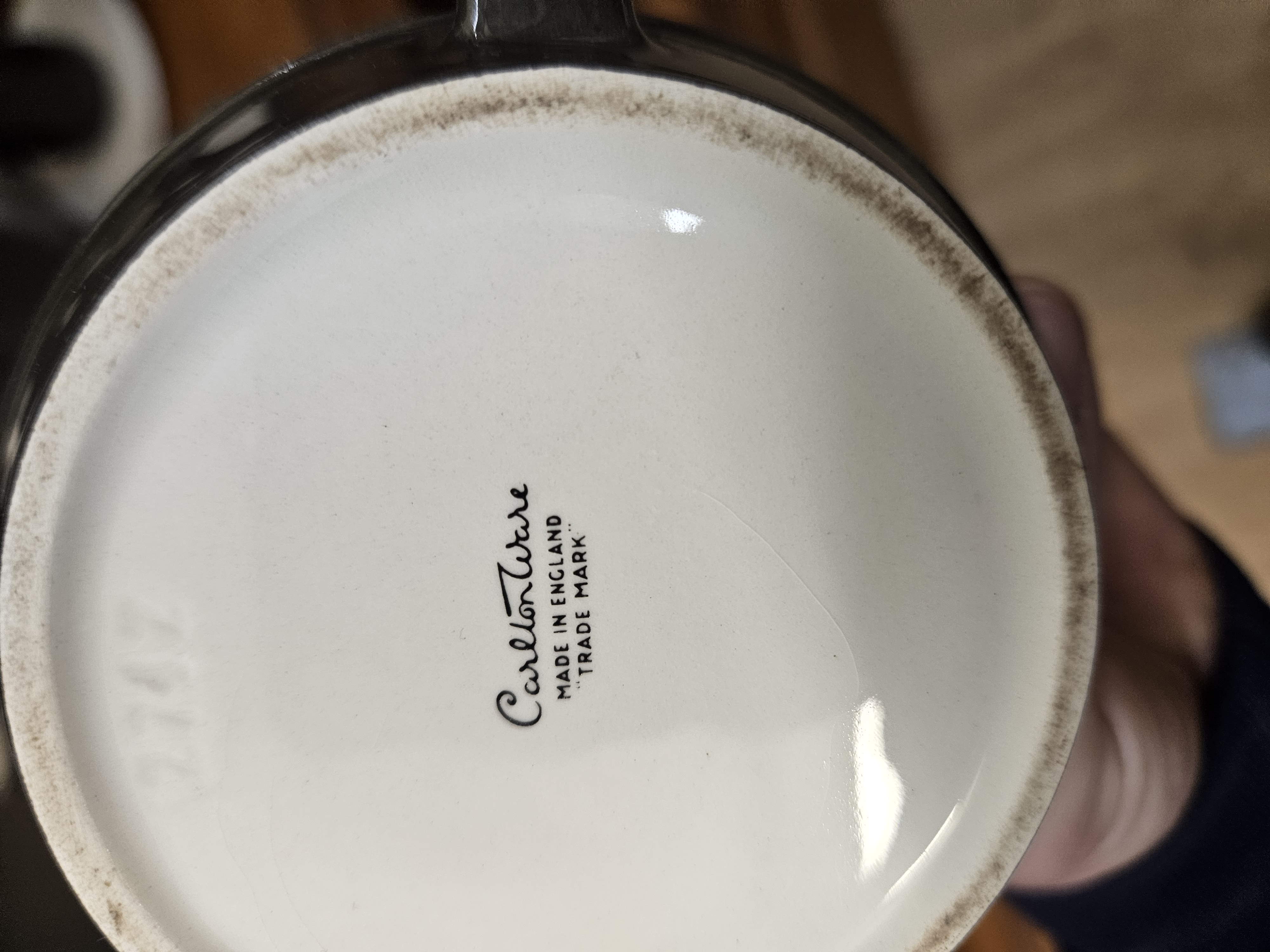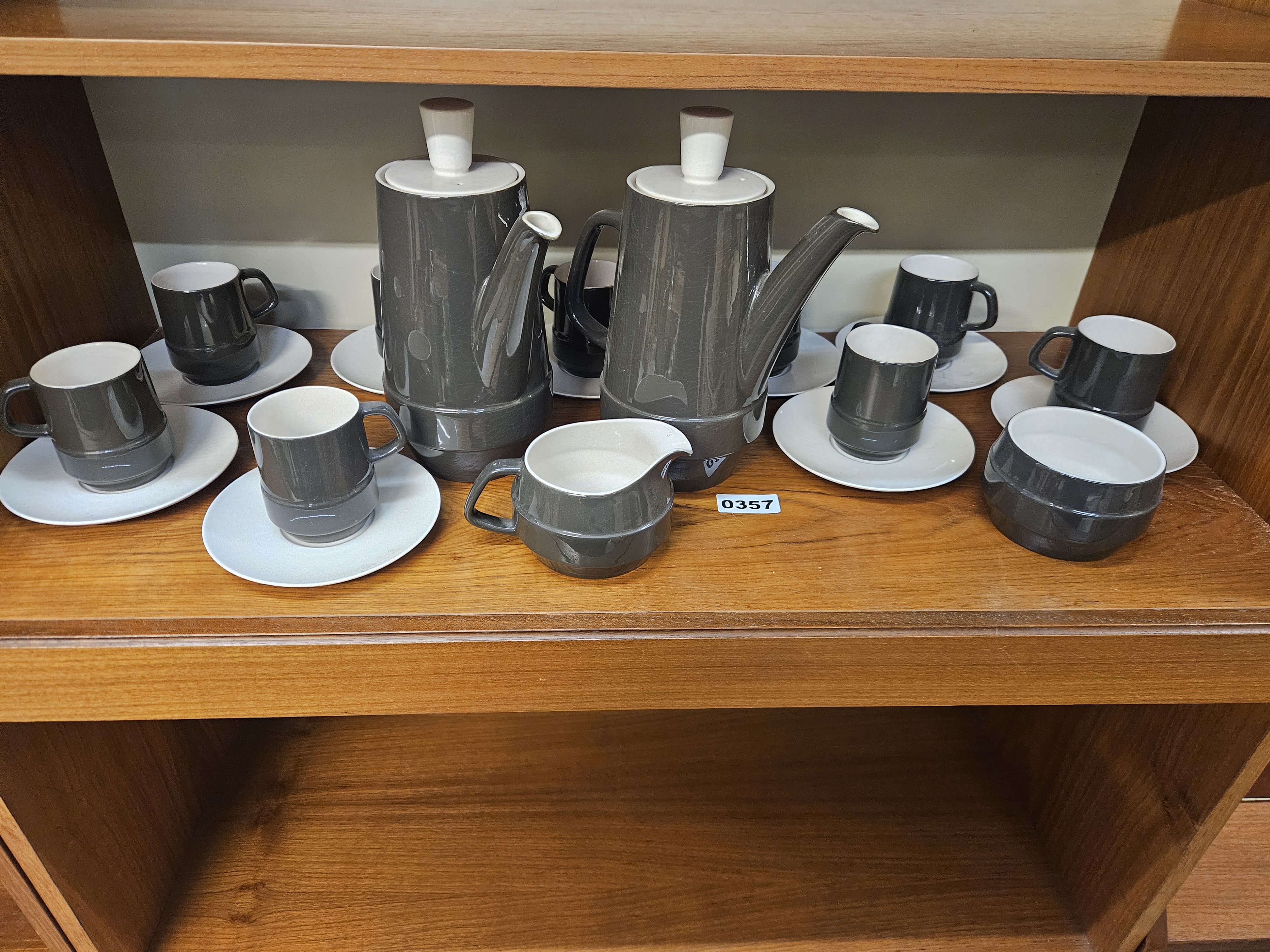 A Carlton Ware earthenware coffee service featuring a modernist design, shape number 2747. The set comprises two tall, cylindrical lidded coffee pots with elongated spouts and circular finials, one creamer, one open sugar bowl, six coffee cups, and six saucers. The design is characterised by clean lines and a weighted, stepped base to the hollowware. The service is finished in a dual-colour glaze with a high-gloss charcoal grey exterior and a contrasting white interior. The underside of the pieces bears a printed black script mark for Carlton Ware, Made in England, Trade Mark, alongside an impressed shape number 2747.