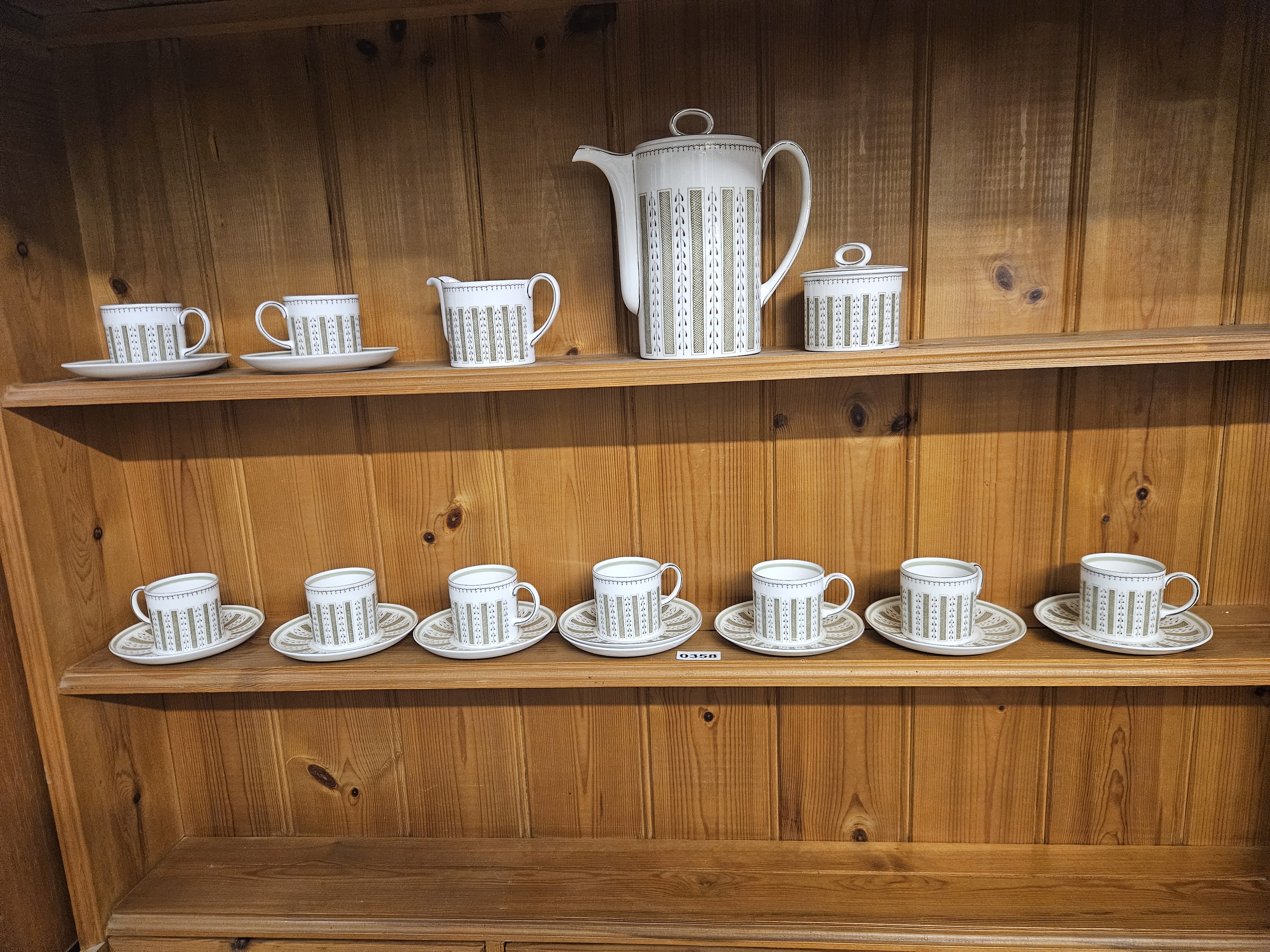A bone china coffee service designed by Susie Cooper in the Persia pattern. The set features a transfer-printed design consisting of vertical bands of stylised foliate and wheat motifs in olive green and sepia tones against a white ground. The service comprises a tall cylindrical lidded coffee pot with a loop handle and curved spout, a matching cream jug, a lidded sugar bowl, and a set of coffee cups and saucers. The underside of the pieces bears a printed mark in dark brown including the Susie Cooper script signature, an asterisk symbol, and the text BONE CHINA, ENGLAND, PERSIA, C 2018. This pattern was introduced in the late 1950s or early 1960s.
