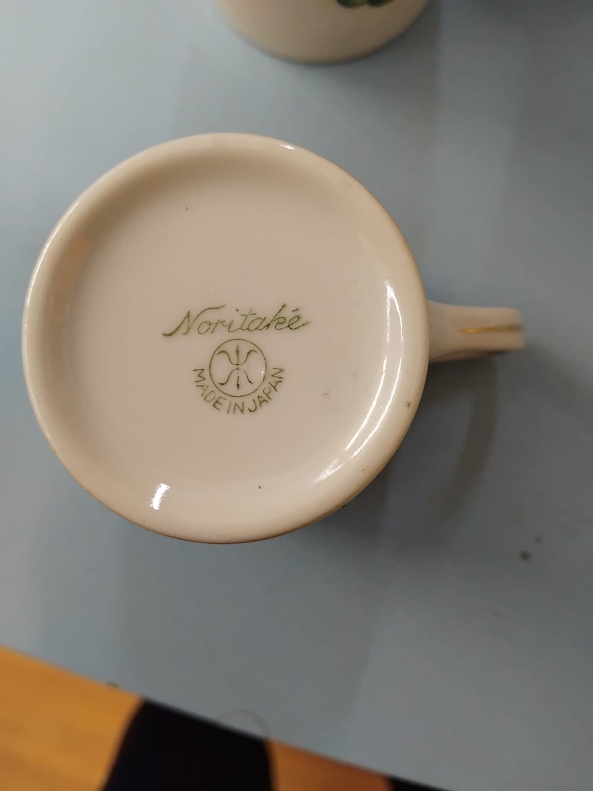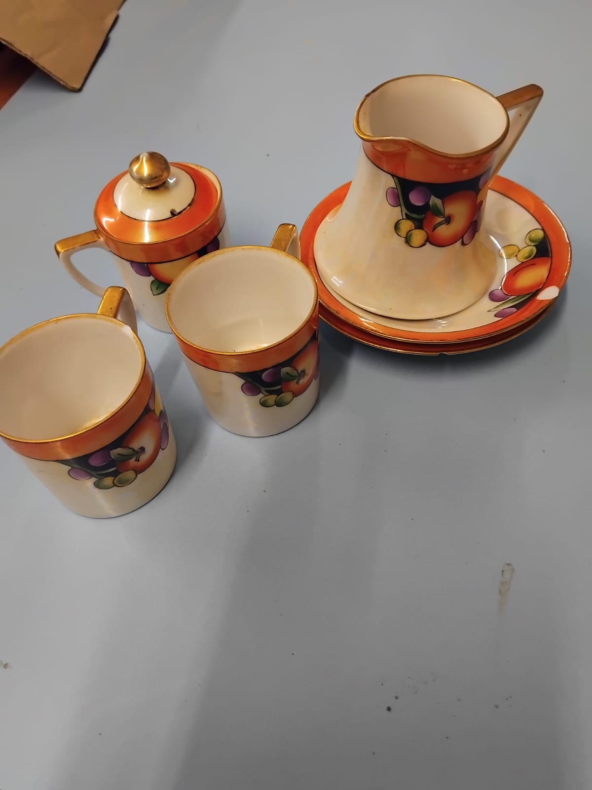 A set of Noritake fine porcelain lustreware produced in Japan for the export market. The set comprises two cylindrical coffee cans, two matching saucers, a cream jug with a high-swept handle, and a small lidded pot with a circular gilt finial, possibly for mustard or preserves. The decoration features a central transfer-printed and hand-painted fruit motif depicting apples and purple grapes set against a pearlescent cream lustre ground. The pieces are finished with vibrant orange-to-peach lustre borders and gilt accents on the handles, rims, and finials. The base of the pieces bears a green printed mark featuring the name Noritake in cursive script above a circular Maruki symbol and the text MADE IN JAPAN. This mark indicates production during the early to mid-20th century, specifically the Art Deco period circa 1920s-1930s.