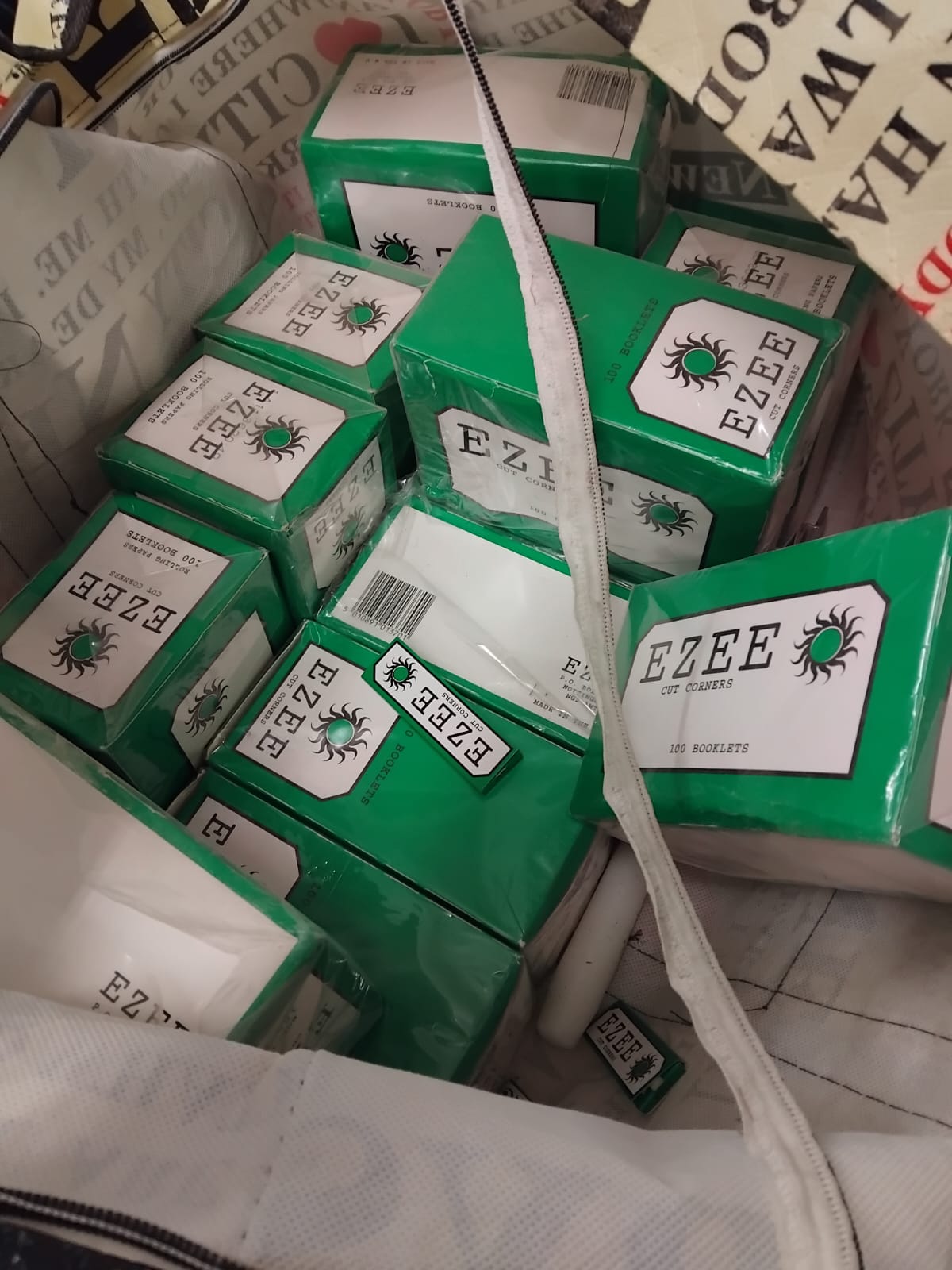 A collection of EZEE brand Green Cut Corners rolling papers. The lot consists of multiple wholesale display boxes, each printed with the EZEE brand name, a stylized sun logo, and the text 100 BOOKLETS and ROLLING PAPERS. These are standard size cigarette rolling papers featuring cut corners. The individual booklets are housed within cardboard wholesale display cartons, the majority of which remain factory-sealed in clear plastic film. A visible barcode on the packaging bears the number 5010891013701. The items are contained within a large white woven carrier bag.