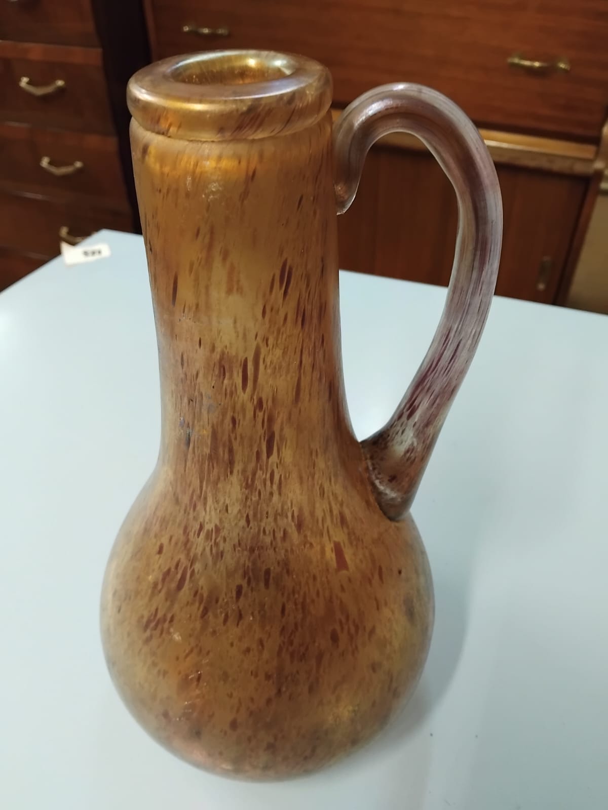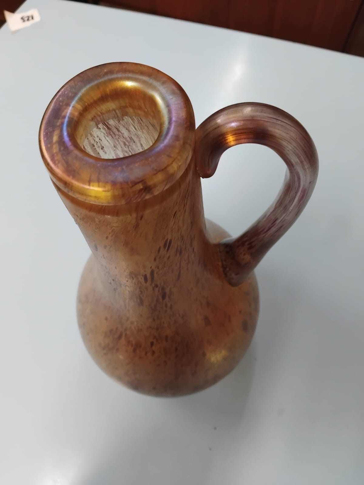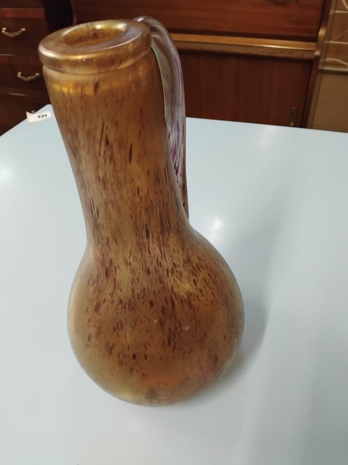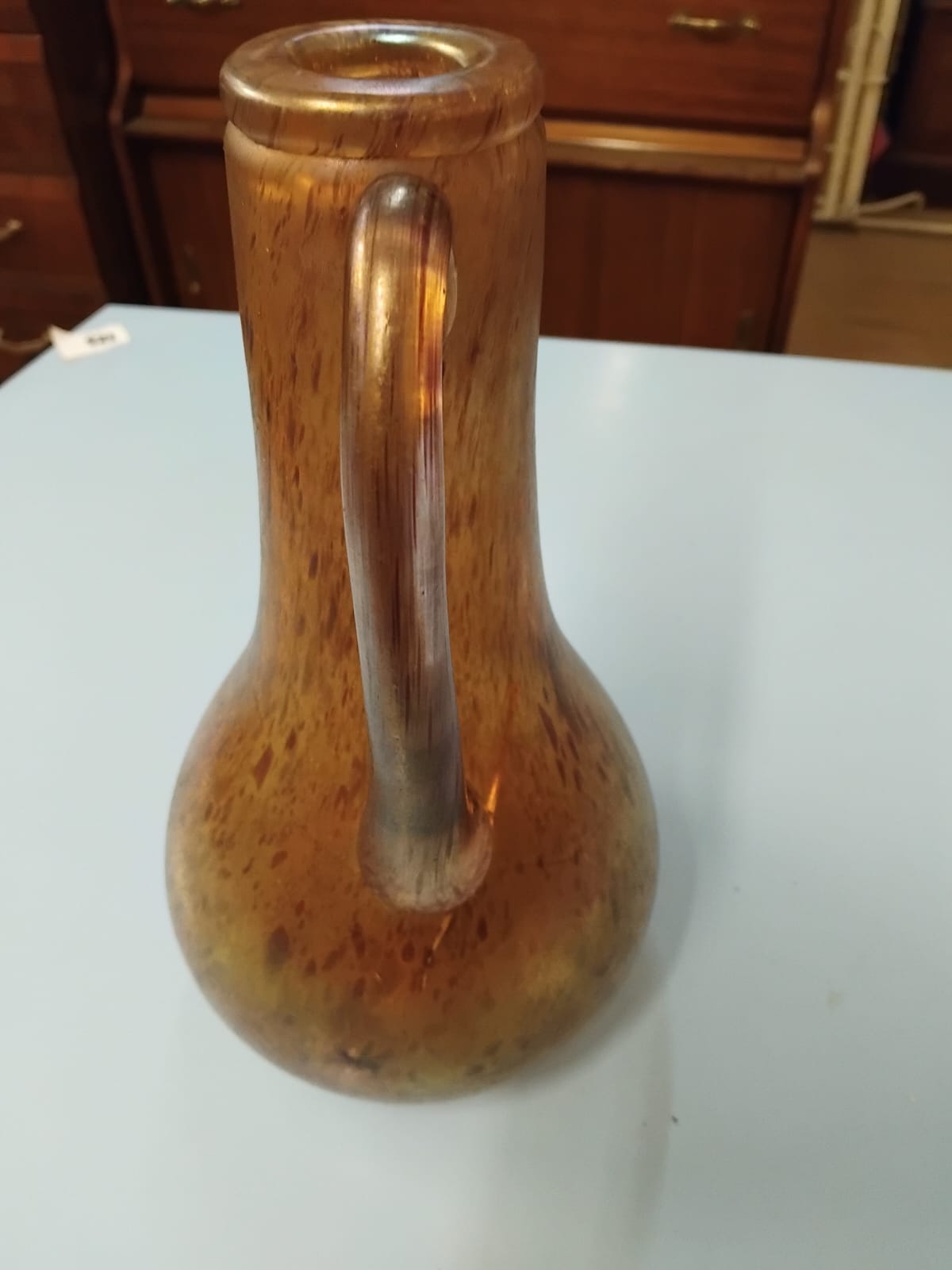 A contemporary hand-blown studio glass ewer or handled vase. The piece features a bulbous lower body tapering to a tall, cylindrical neck with a slightly thickened rim and a single, thick applied glass handle. The body is decorated with an internal mottled pattern of amber and reddish-brown tones. The exterior surface is treated with a metallic lustre, creating a strong iridescence with flashes of purple, blue, and gold, most prominent on the handle and around the rim. The style is characteristic of late 20th-century studio glass production, such as that from the Isle of Wight or Mdina, although no maker marks or signatures are visible.