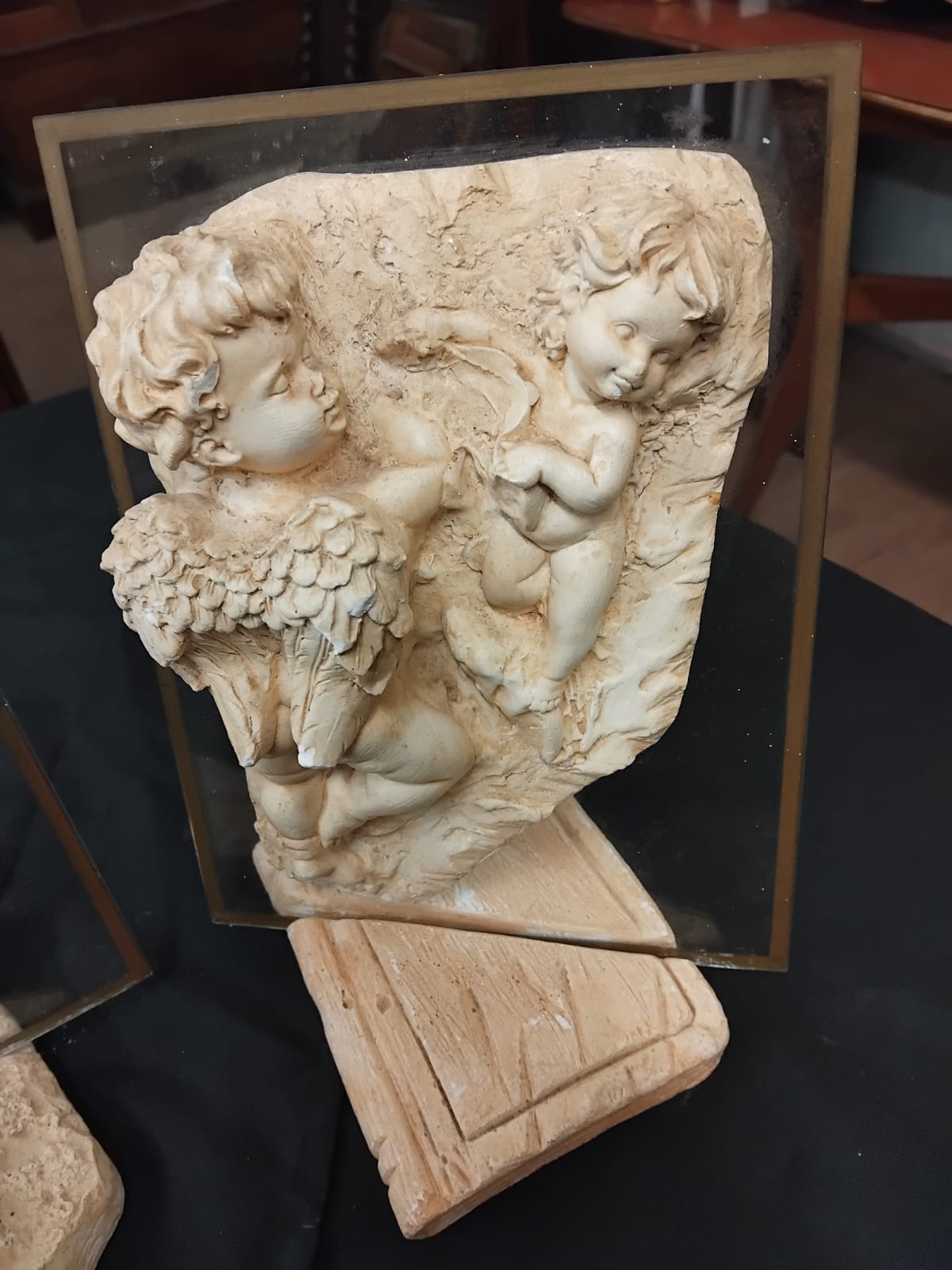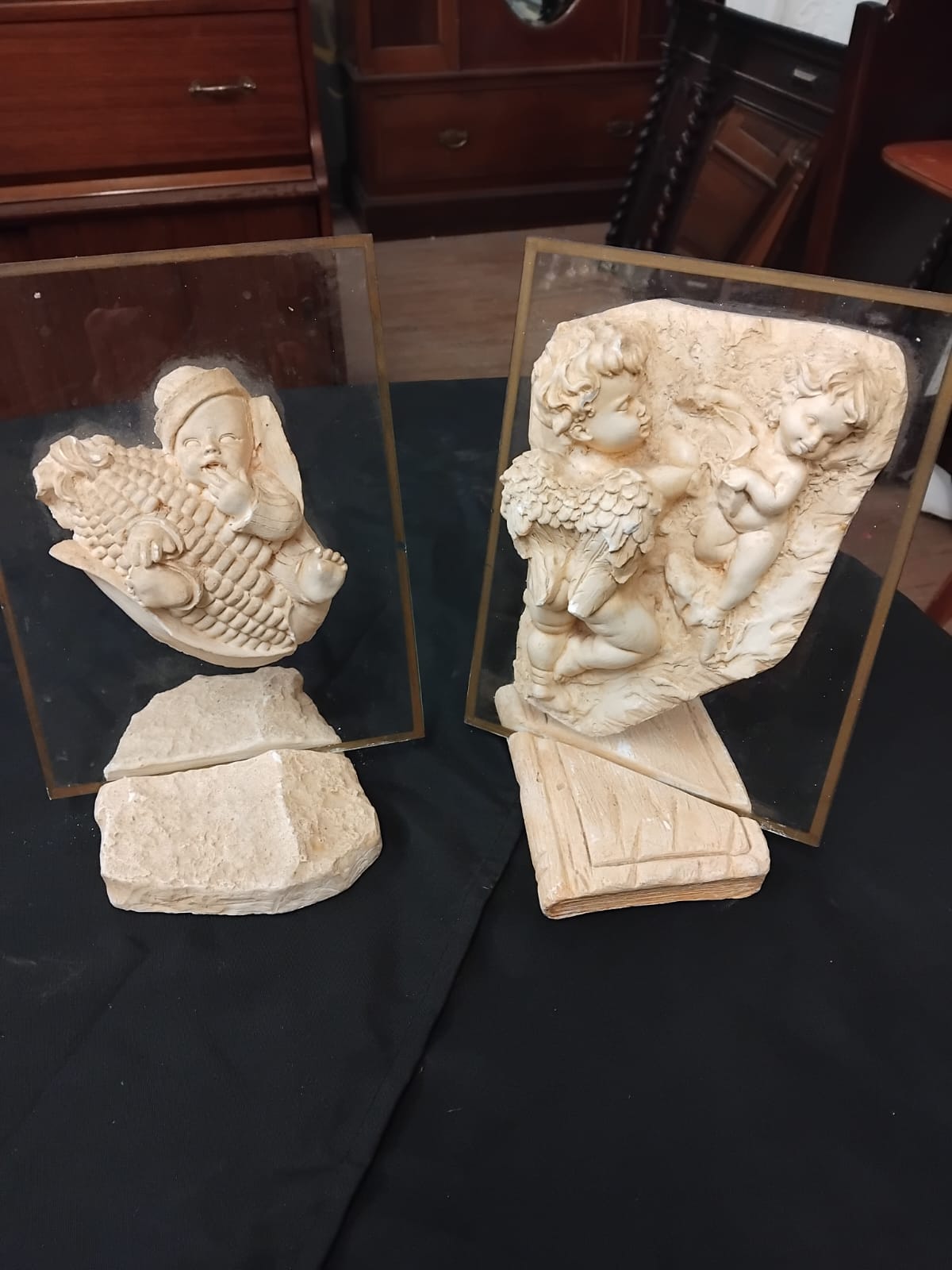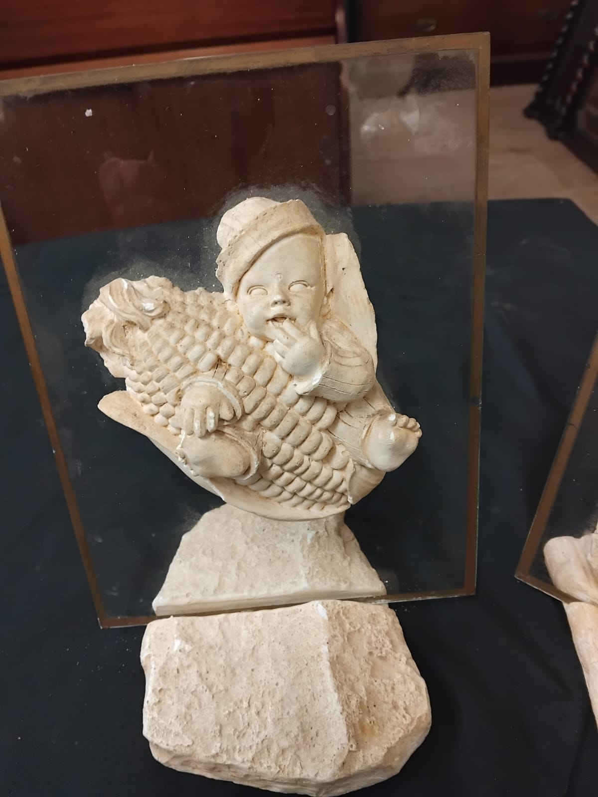 A pair of contemporary high-relief decorative sculptures, each mounted through a rectangular pane of clear glass and set into a matching composite base. The figures are constructed from a cast resin or stone-based composite material with an antiqued, ivory-coloured finish. The glass panes are held within thin metallic-painted frames. The first sculpture depicts two cherubs or putti in high relief against a textured, rugged background, mounted on a base fashioned to resemble an open book. The second sculpture depicts an infant wearing a cap nestled inside a large corn husk, set into a base shaped like a rough-hewn stone block. This piece is attributed to Mark Klaus, resembling designs from the Treasure of the Corn series. These items are consistent with late 20th-century interior decorative giftware.