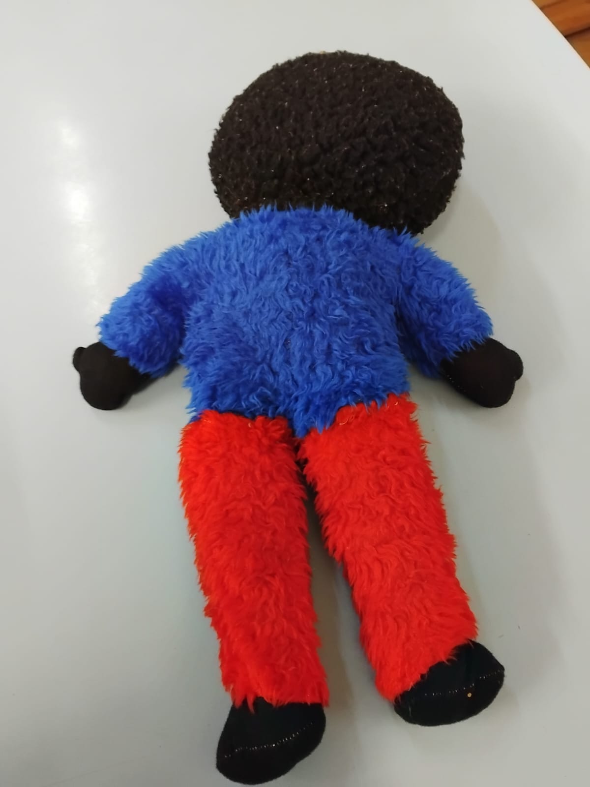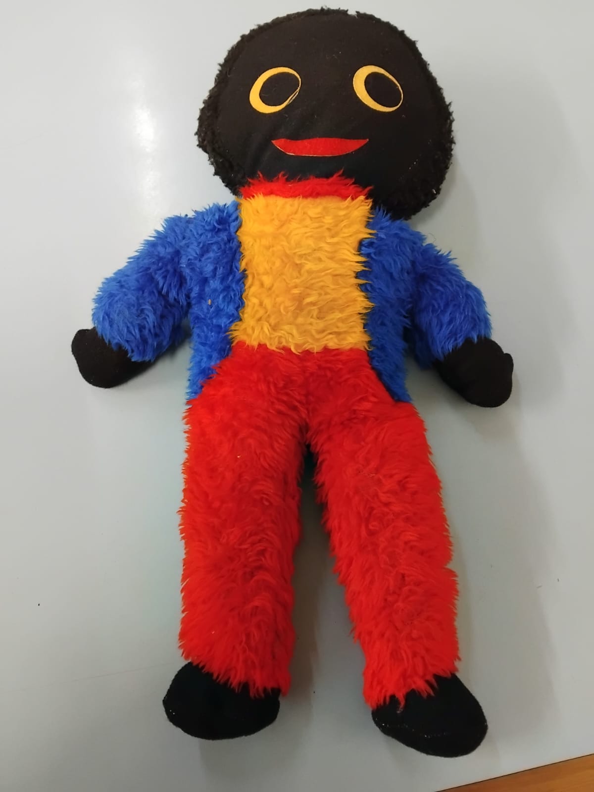 A vintage soft plush doll of a golly character, constructed from mixed synthetic fabrics. The torso and limbs are made from long-pile plush in blue, yellow, and red. The head features a black fabric face with applied white and black circular eyes and a red fabric mouth. The hair is made of dark, curly synthetic fibre. The hands and feet are finished in black flat-weave fabric. No manufacturer labels or tags are present. The construction style is consistent with late 20th-century examples, including those attributed to Diane Jones or produced as promotional items.