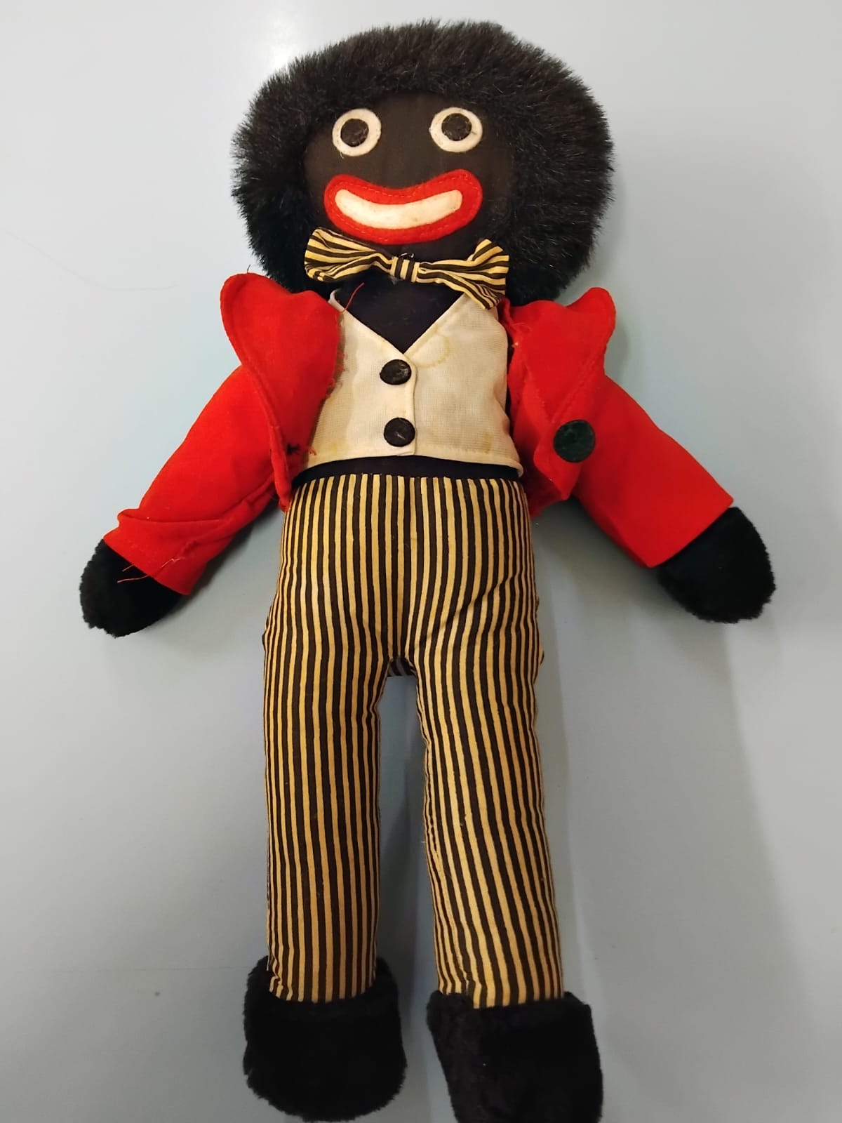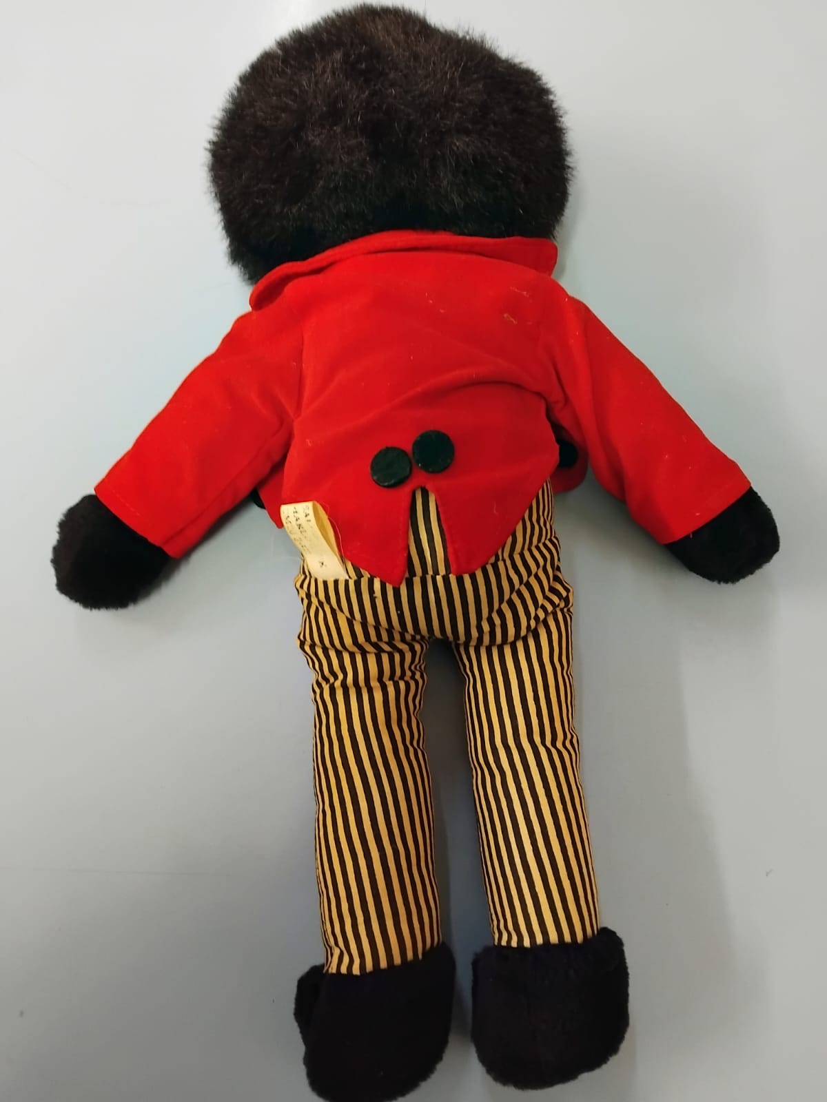 A vintage soft golly doll of British manufacture, attributed to Salco. The figure is constructed from black fabric with a large black faux fur plush head of hair. Facial features are comprised of applied fabric, including circular white and black fixed eyes and a large red and white stitched mouth. The doll is dressed in an original ensemble featuring a red fabric tailcoat with two black buttons to the reverse and one on each cuff, a white fabric waistcoat with two black buttons, and yellow and black vertically striped trousers with a matching bow tie. A yellowed fabric safety tag is attached to the rear, referencing compliance with the 1980 Toys (Safety) Regulations.