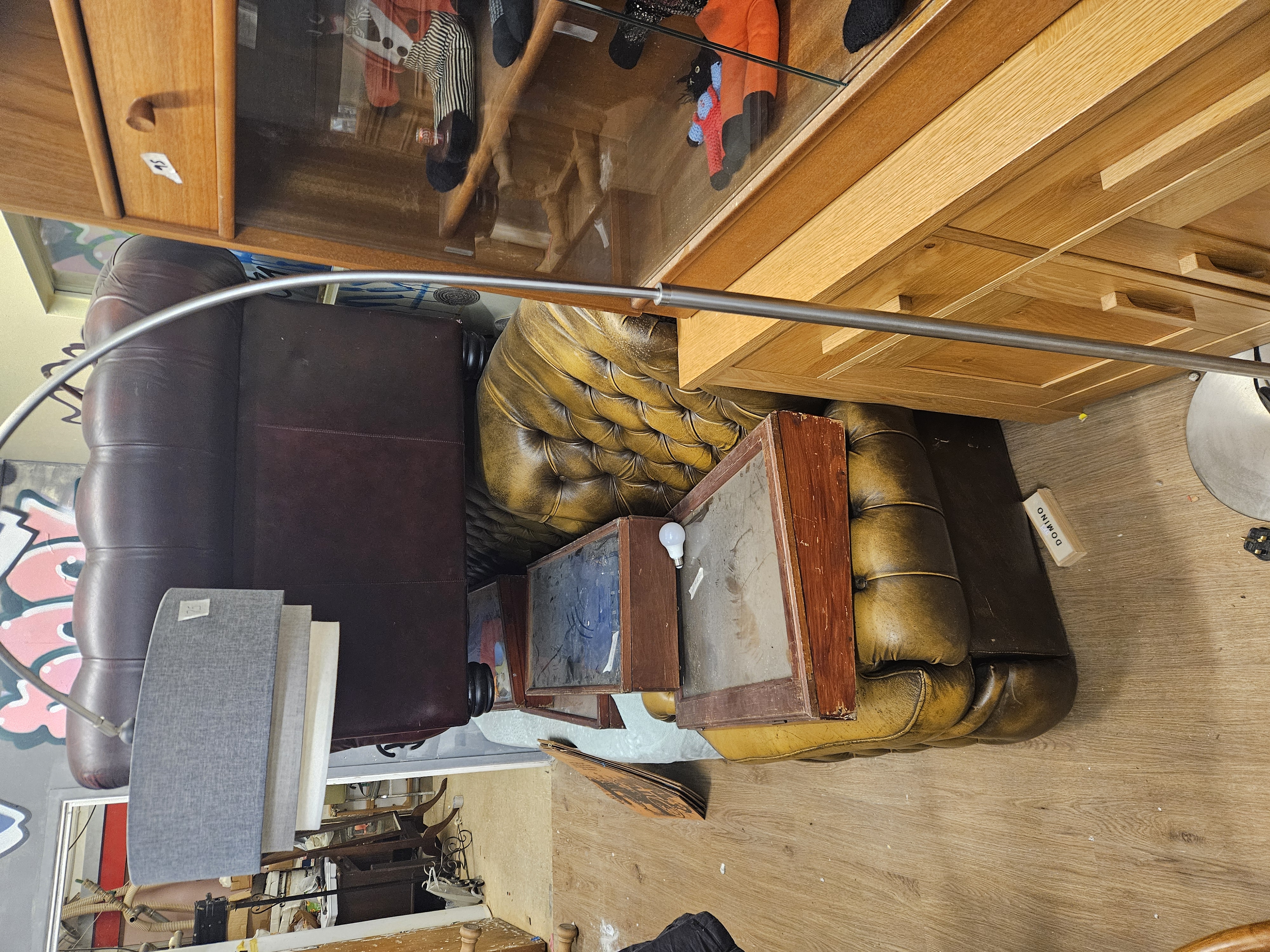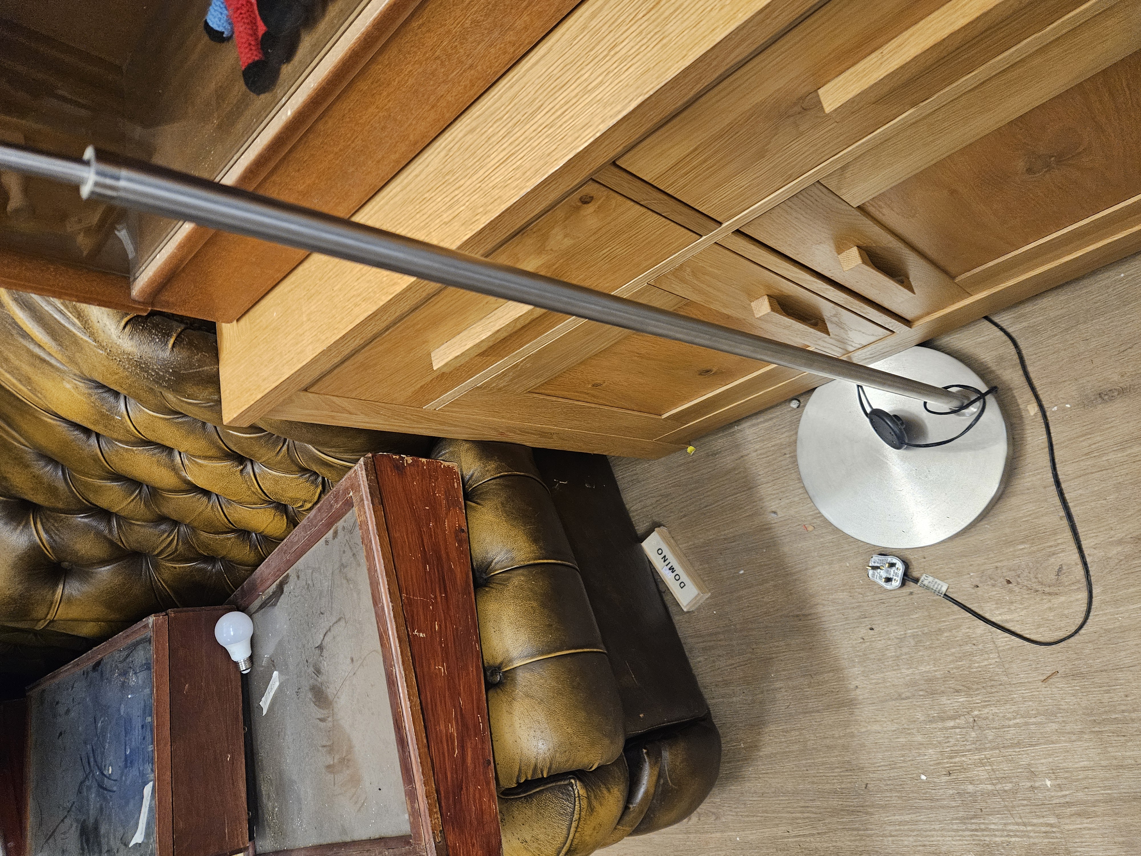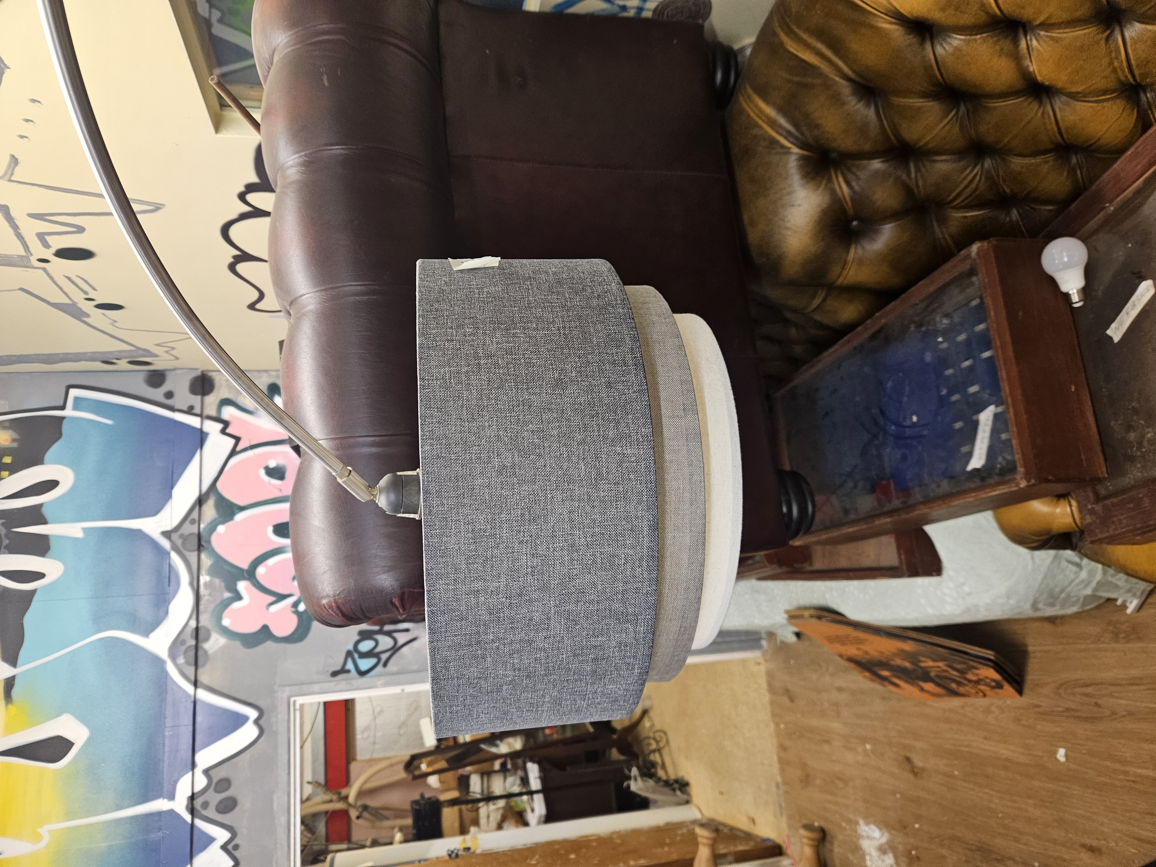A contemporary overarching arc floor lamp featuring a brushed metal frame and a circular base. The lamp is fitted with a three-tiered cylindrical drum shade composed of textured fabric in graduated tones of dark grey, light grey, and off-white. The electrical assembly includes a black power cable, an integrated inline foot switch, and a standard UK 3-pin plug. No maker’s marks or labels are visible on the frame or base.