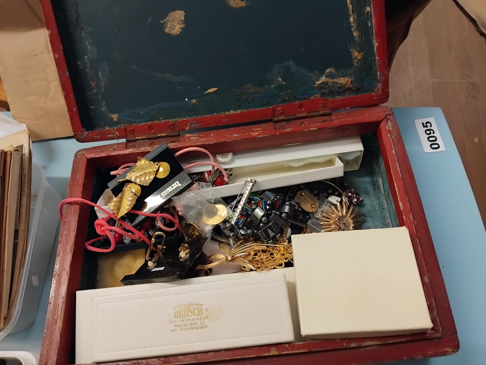 An assortment of vintage costume jewellery and accessories contained within a weathered red wooden box. The lot includes yellow and white-tone base metal brooches, earrings, and beaded necklaces. Specific items include a pair of gold-tone leaf-motif earrings on a card marked Brass, a sunburst-style brooch, and various enamelled and glass-beaded elements. The collection is accompanied by several small white jewellery boxes, one of which bears a gold-stamped mark for BRISCH, Bln.-Wilmersdorf, Wexstraße 32, am Bundesplatz. No hallmarks or purity stamps are distinguishable on the individual jewellery pieces. The wooden box features a red painted finish and a textile-lined interior.
