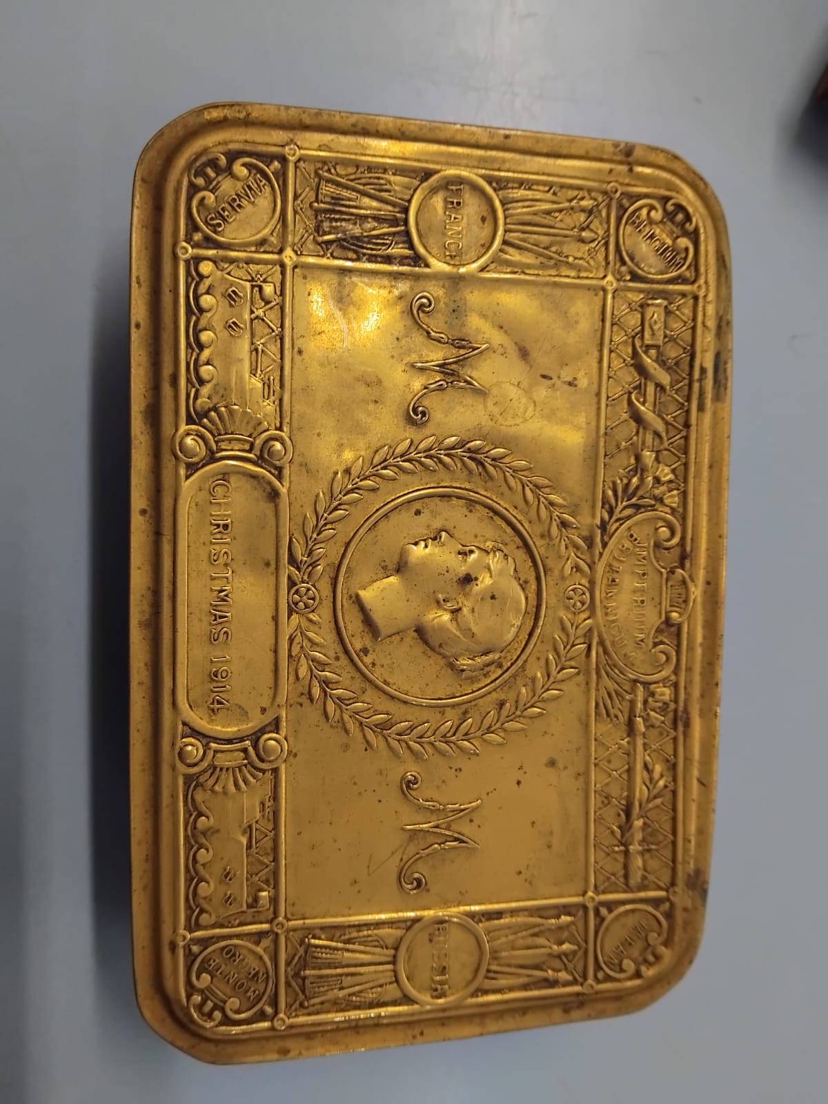 A rectangular brass gift tin produced for the Princess Mary’s Sailors’ and Soldiers’ Christmas Fund for distribution to members of the British, Colonial, and Indian Armed Forces on active service during the first winter of the Great War. The lid features an embossed central profile portrait of Princess Mary facing left, encircled by a laurel wreath and flanked by two stylized cursive M monograms. The decorative border incorporates various military and naval motifs, including battleships, field guns, and bayonets interspersed with flags. The names of the Allied nations are embossed in circular frames at the corners and centres of the edges: Servia, France, Belgium, Monte Negro, Russia, and Japan. A scroll to the right is inscribed Imperium Britannicum and a panel to the left is marked Christmas 1914. This lot consists of the brass tin only.